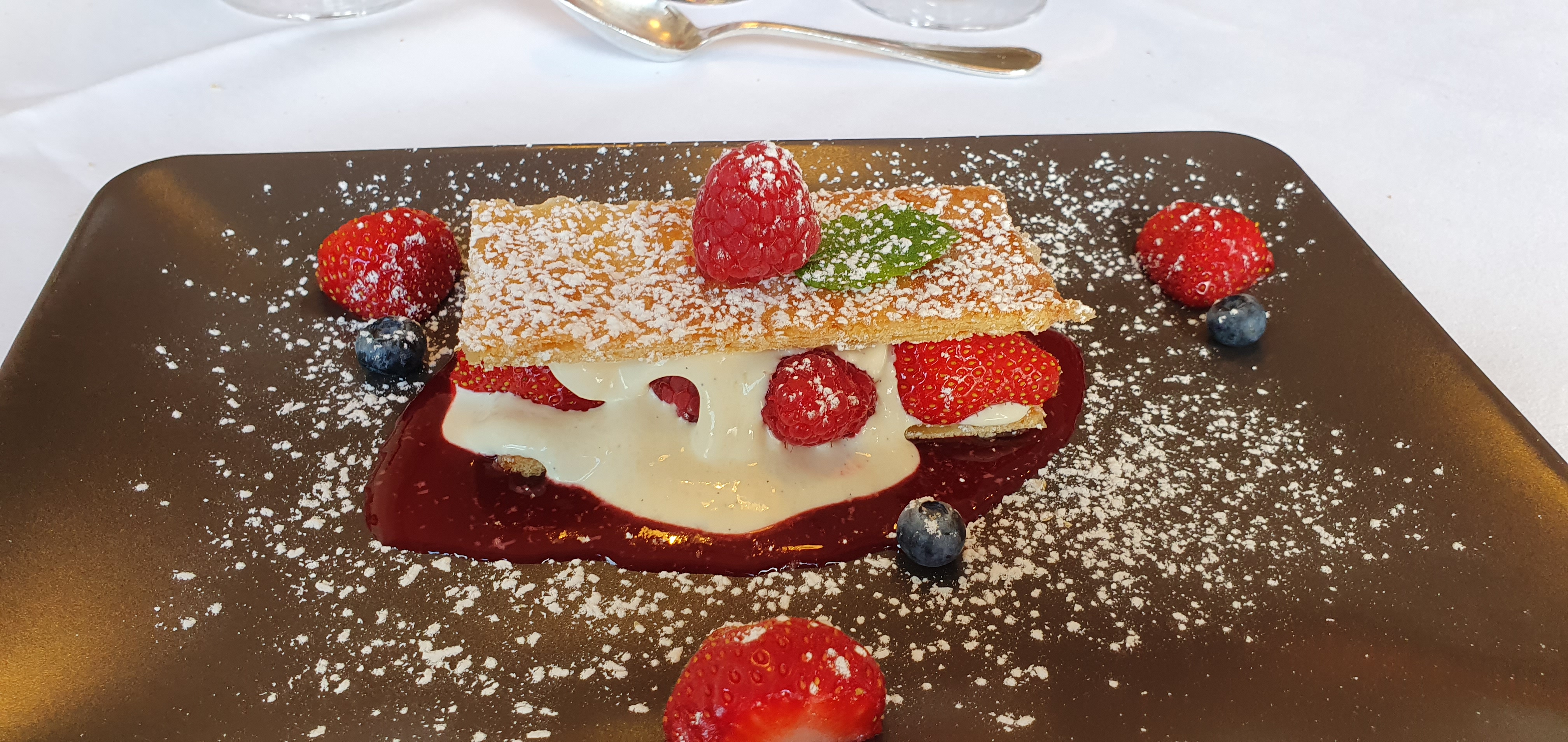 Et voilà un petit restaurant que nous adorons L'accueil est parfait L'intérieur charmant est propre Nous commençons par un apéritif Nous prenons un spritz malheureusement qui n'en a que le nom bon on peut déçu revoir la recette Mon choix a pris la salade saumon foie gras et canard excellente Moi entrer lentilles foie gras canard excellent Un petit peu plus de générosité sur les lentilles aurait été le bienvenu car très bon mais malheureusement deux fourchettes Pour le plat mon conjoint a pris la souris d'agneau avec légumes et tagliatelles viande excellente légumes parfait malheureusement Les pâtes une fourchette un peu plus s'il vous plaît Moi j'ai pris le saumon légumes riz Saumon et légumes parfait Le riz je ne suis pas sûr qu'il était du jour et un très petite quantité allez une fourchette plus de riz Bon je pense que c'est parce que nous sommes venus le lundi soir et beaucoup de plats manqués à l'appel D'ailleurs deux jeunes filles sont repartis car il n'y avait plus du tout de poisson à la carte Ah le dessert 10 sur 10 mille-feuille à la fraise était à tomber Pour mon conjoint il a pris la trilogie des trois petits desserts la petite tartelette n'était pas du jour dommage Un petit peu déçu mais je pense que cela vient du fait que nous sommes venus un lundi 126€ a deux