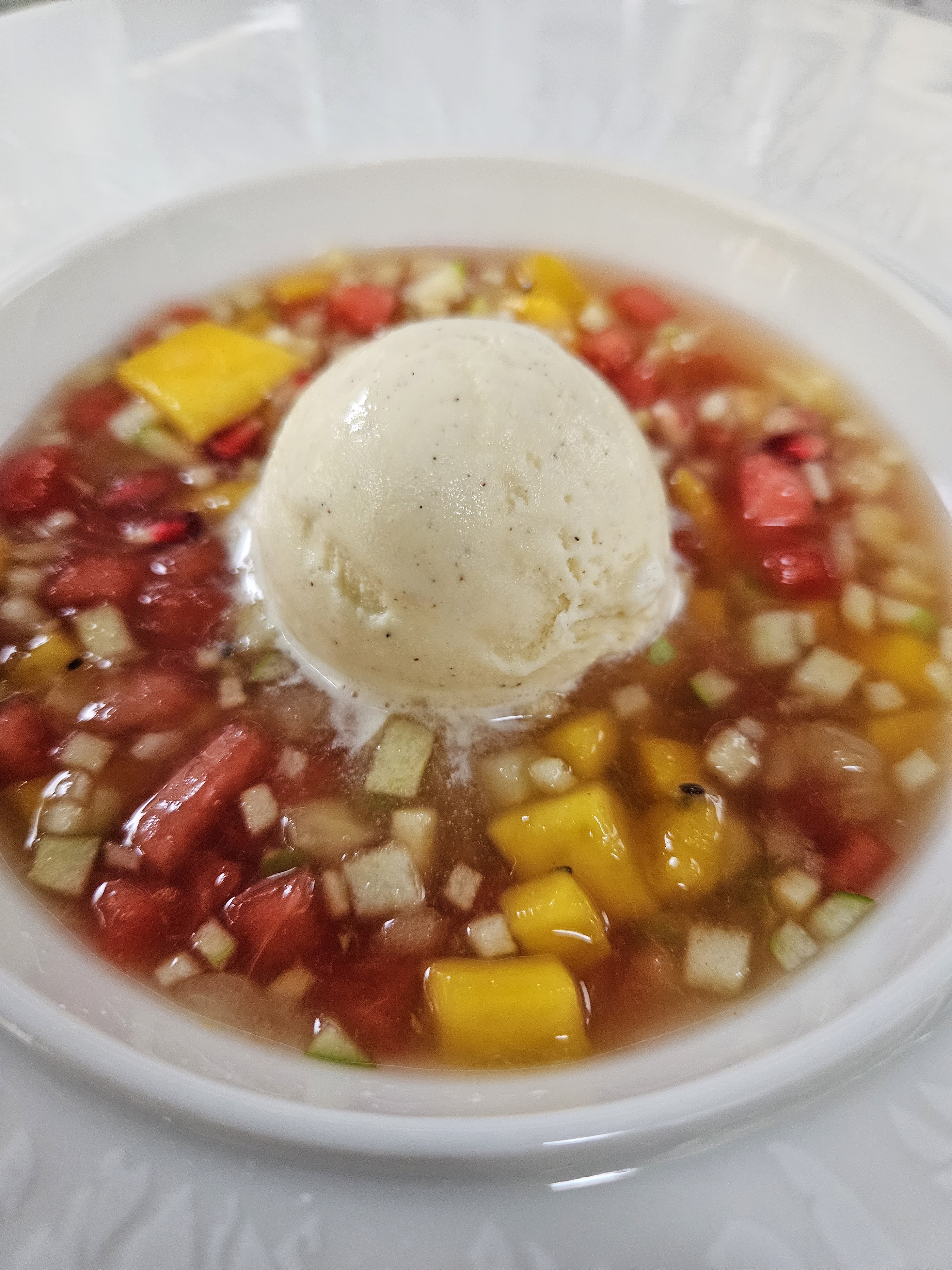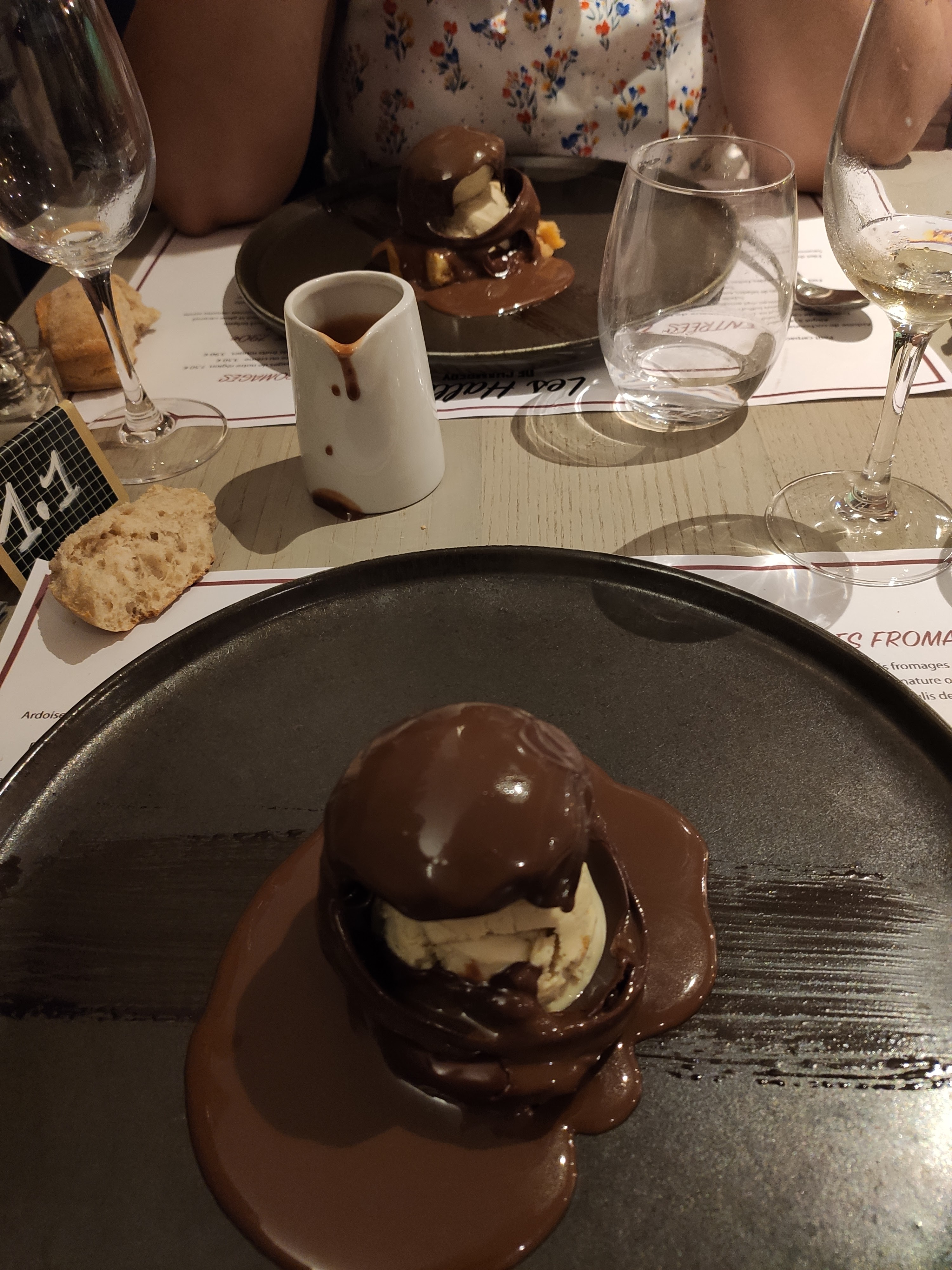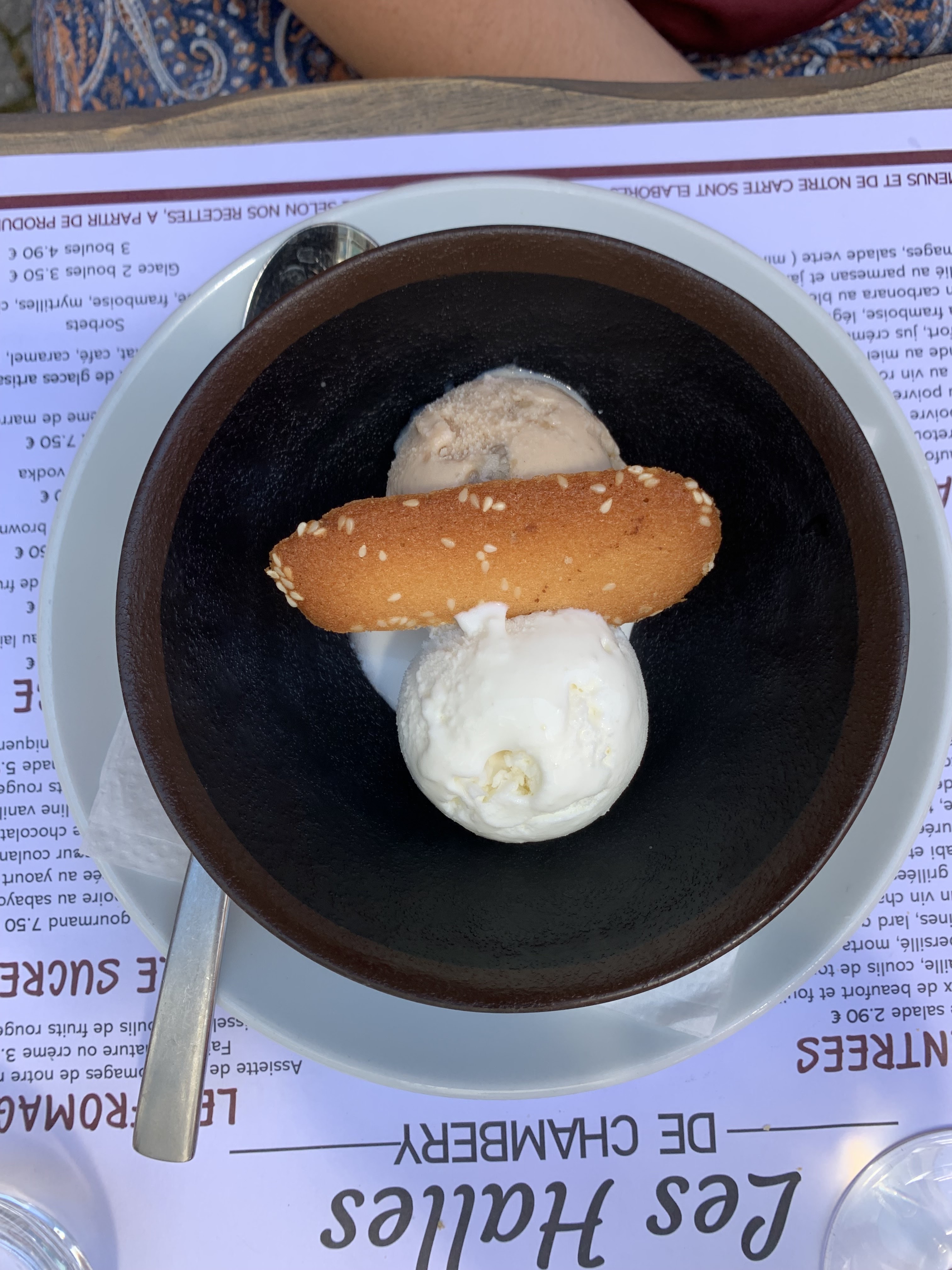 Serveur très sympa, qui nous a fait voyager avec ses suggestions de vin Savoyard mais surtout avec sa bonne humeur. Gauffres faites maison et glace monoboule exquise. La petite attention de la fin valide la 5e étoile 😉