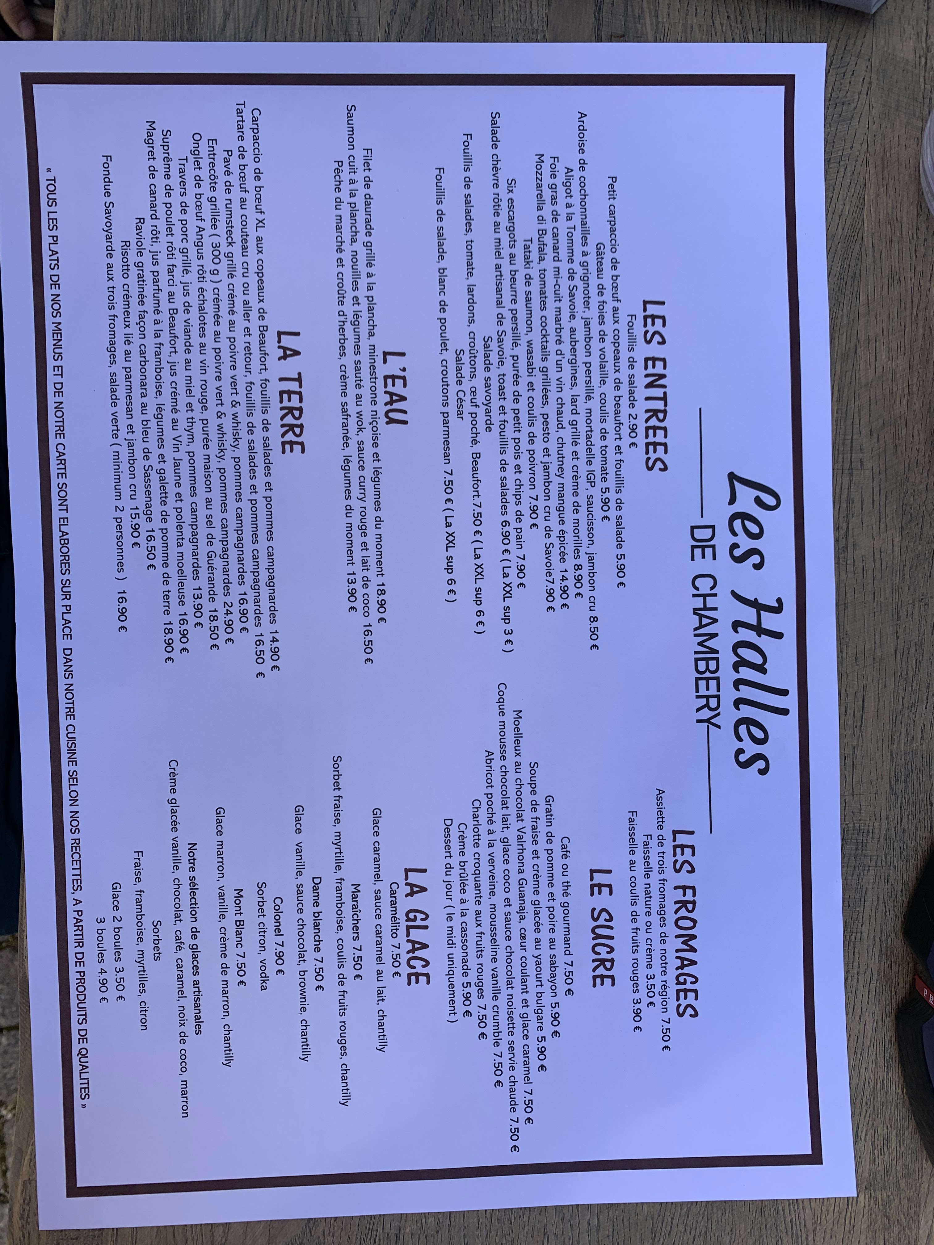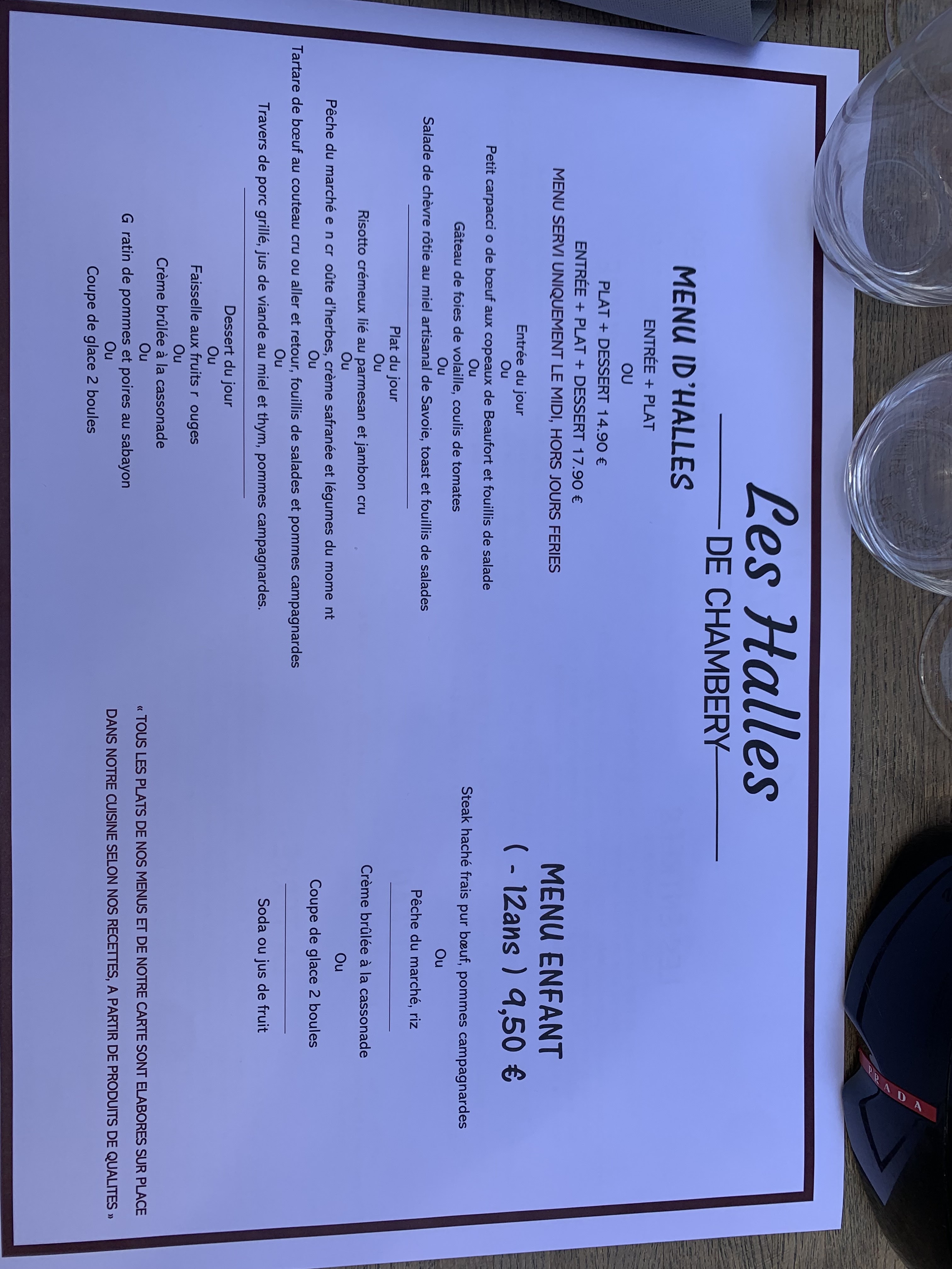 Nous découvrions la ville de Chambéry et avons profiter du midi pour faire une pause déjeuner dans le restaurant Les Halles. Le service est de qualité, la cuisine excellente. Nous avons pu profiter de la terrasse avec autant de soleil dans le ciel que dans l'humour du serveur. Les plats étaient délicieux et suffisamment bien proportionné pour avoir l'Energie de crapahuter de nouveau dans les montagnes juste après le repas. Merci pour le sérieux de votre établissement et la bonne humeur de votre équipe.