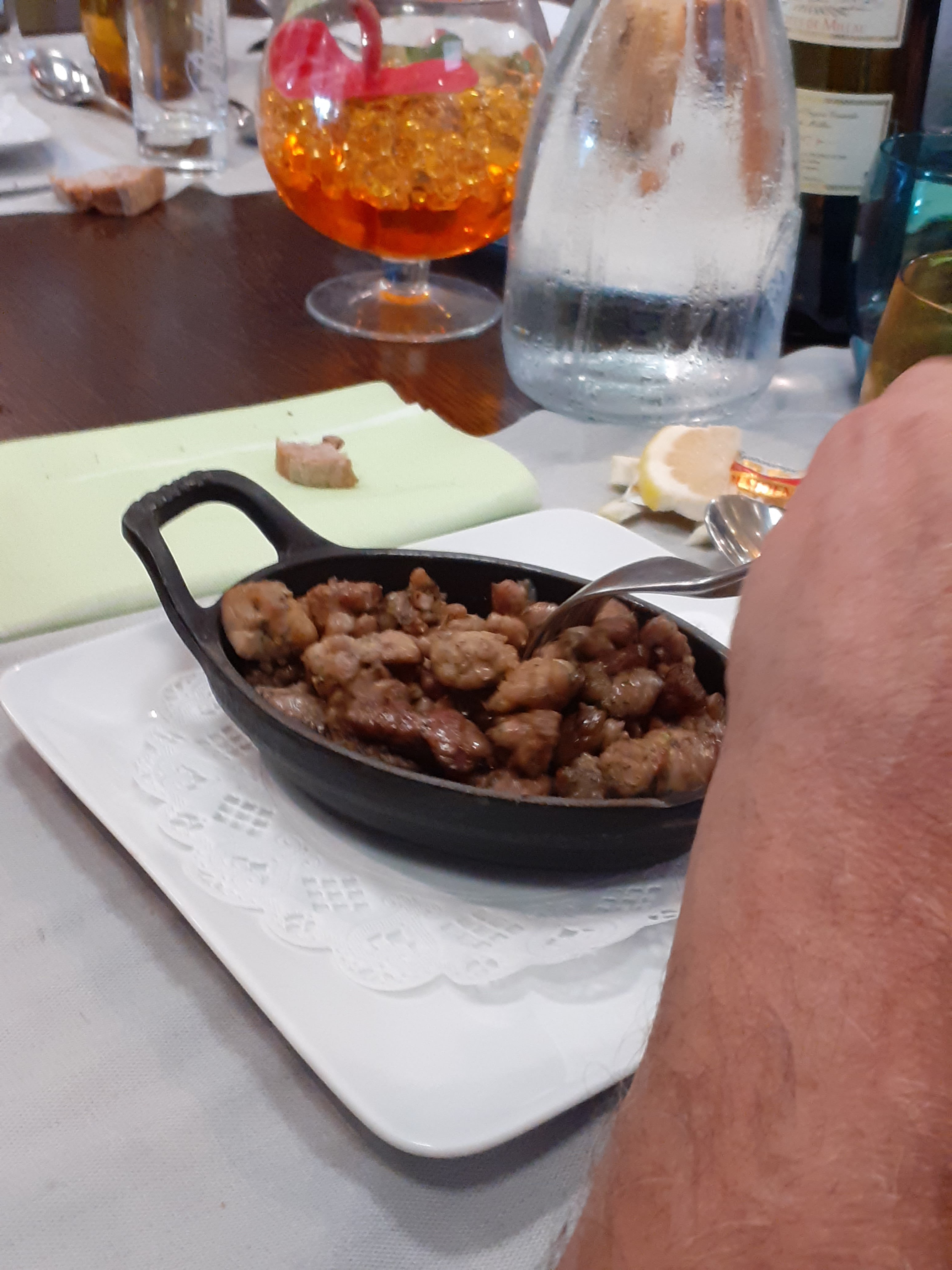 Entrée aux escargots et feuilleté : tout froid, repartie à faire chauffer.... Plat aligot saucisse froid aussi, c'est tout de même meilleur chaud..... Le café n'arrivant pas, sommes partis le boire ailleurs..... Il paraît que c'est le patron qui était à la cuisine ce jour là..... Et bien ?? Vivement que le vrai cuisto revienne.....