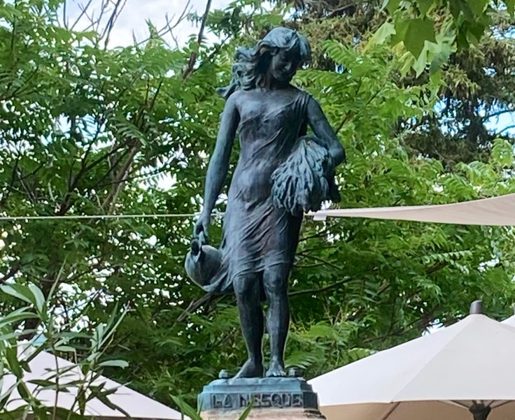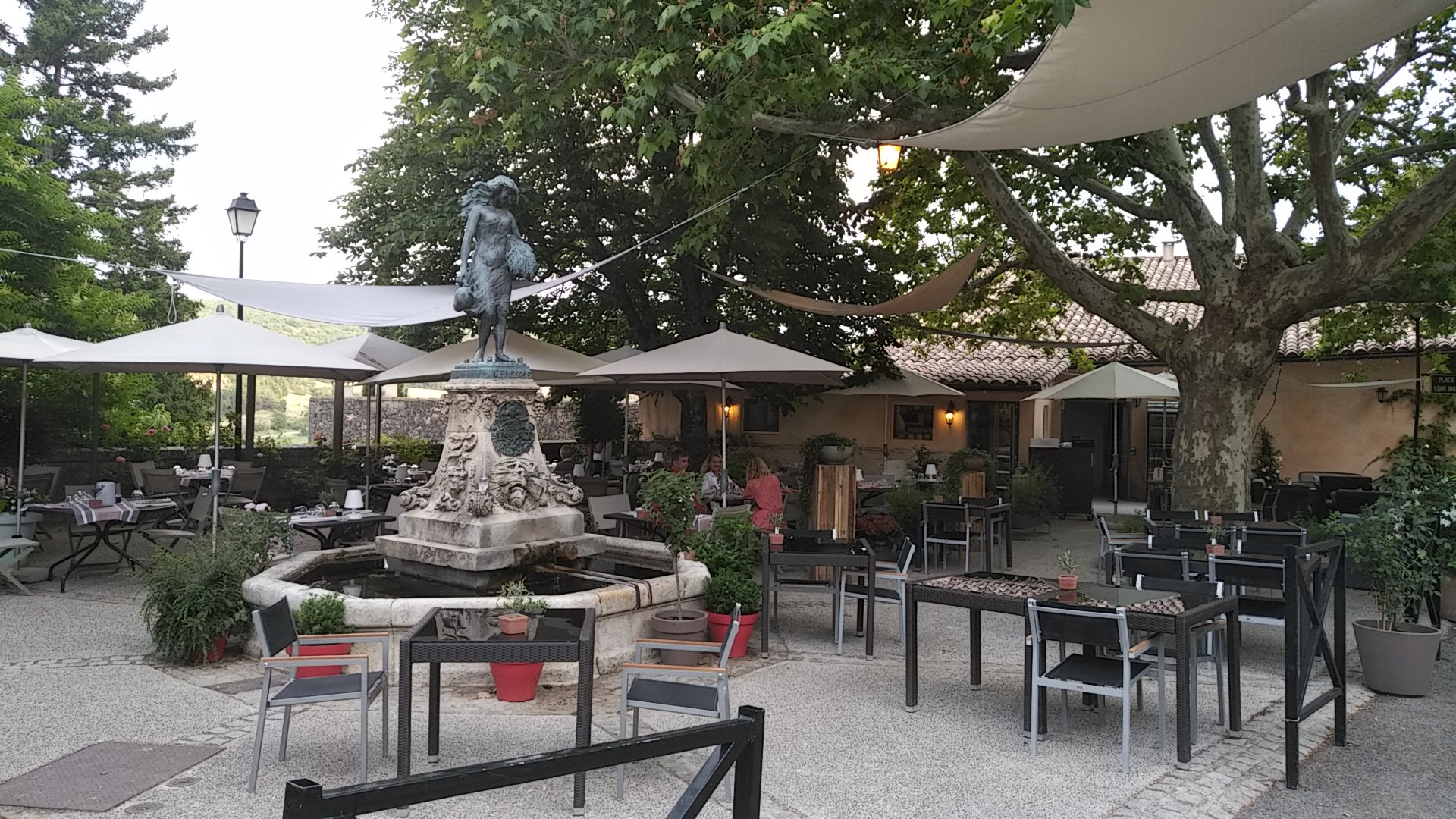 Terrasse très agréable sous la charmante statue de la Nesque.