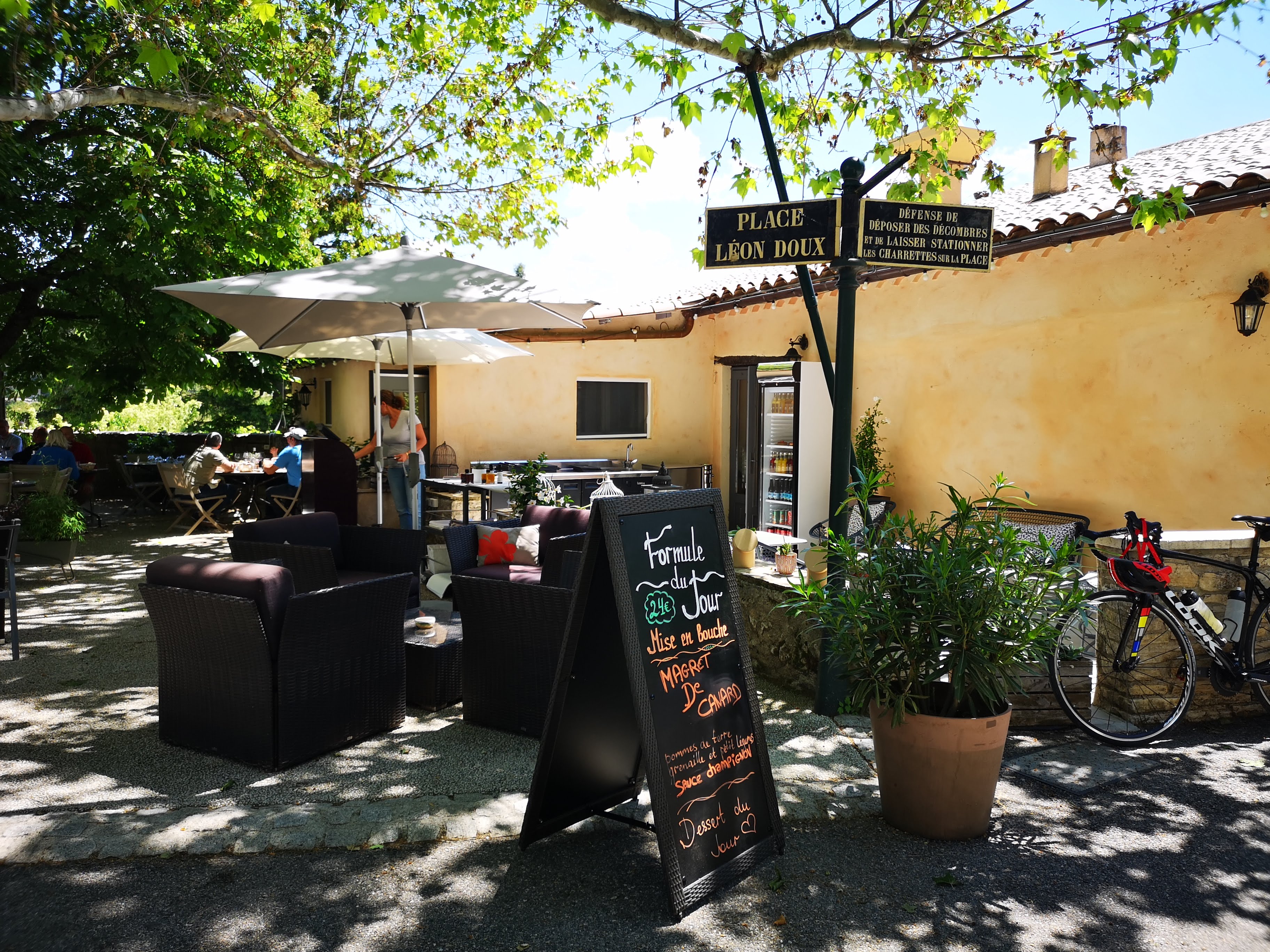 Belle terrasse dans ce charmant petit bourg aux portes des gorges de la nesque. Bon repas. Environ 30€ le.menu du jour.