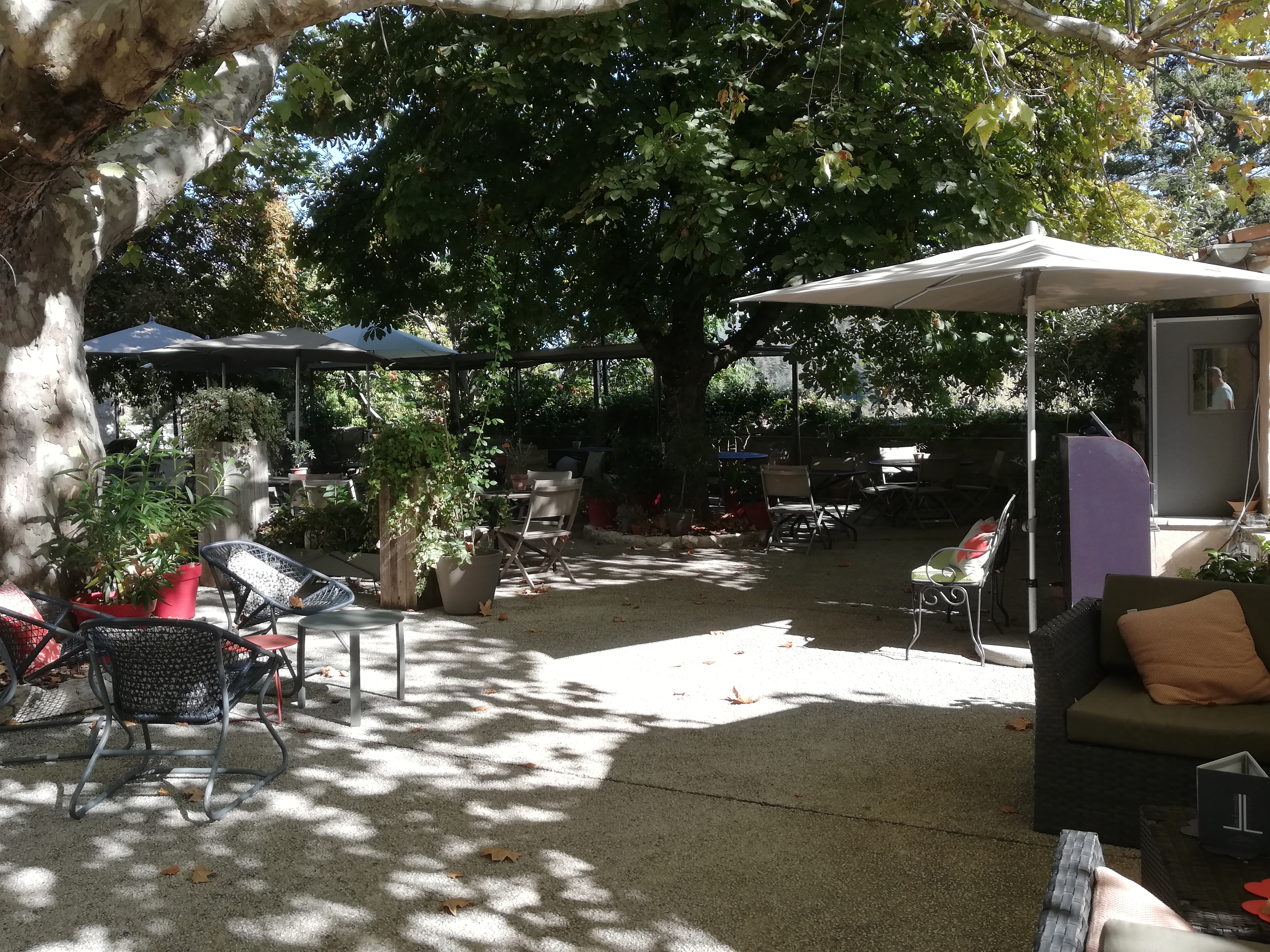 Très bel endroit avec belle terrasse a l'ombre des platanes