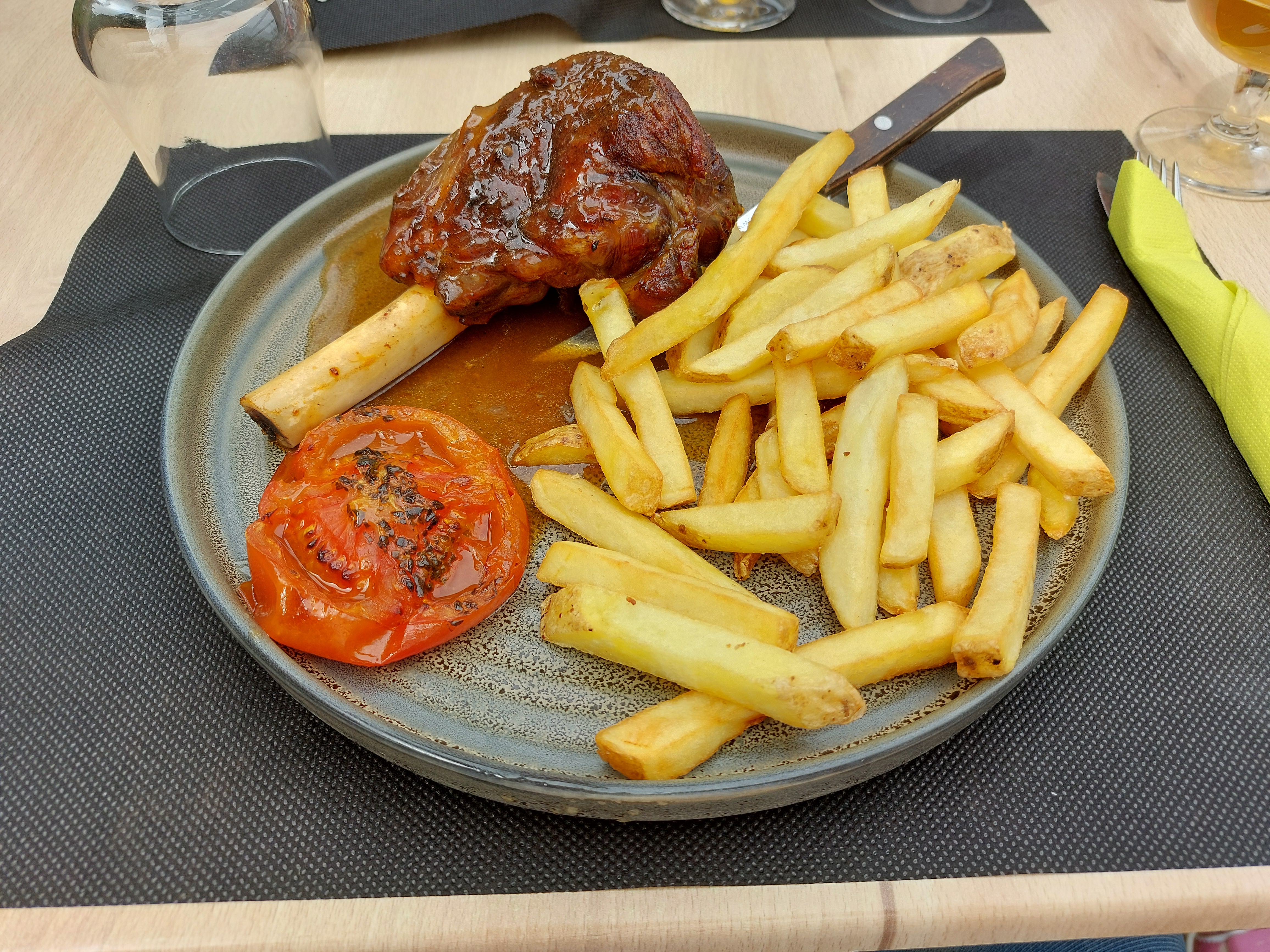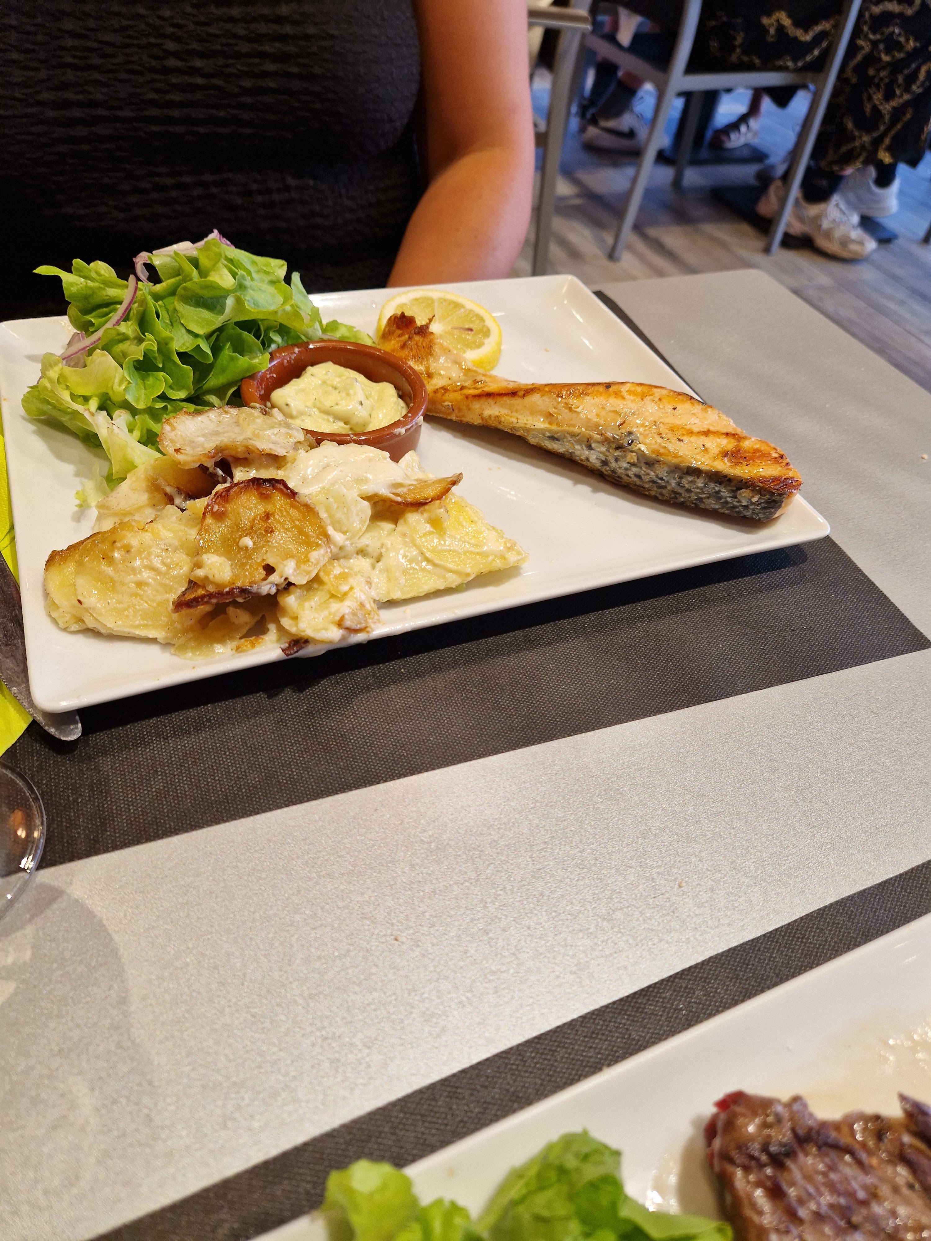 Coté restaurant : Nous avons pris une entrecôte, la cuisson était parfaite et la viande était savoureuse. Les frites un peu fade. Également , une grillade d’agneau demandée saignante avec gratin et salade, le gratin était succulent et la salade également, petit bémol pour la viande qui était plus à point que saignante et pas du tout assaisonnée à son arrivée à table. Concernant le service , un manque d’organisation. 2 fois les boissons ont été oubliées et une serveuse qui ne dit pas bonjour, merci ou quoi que ce soit. Les prix étaient raisonnables. 8/10 Coté boulangerie: Nous y sommes allés 2 fois et la serveuse est tout simplement antipathique. Elle a l’air agacée en permanence. Un client, cela dérange ? 4/10