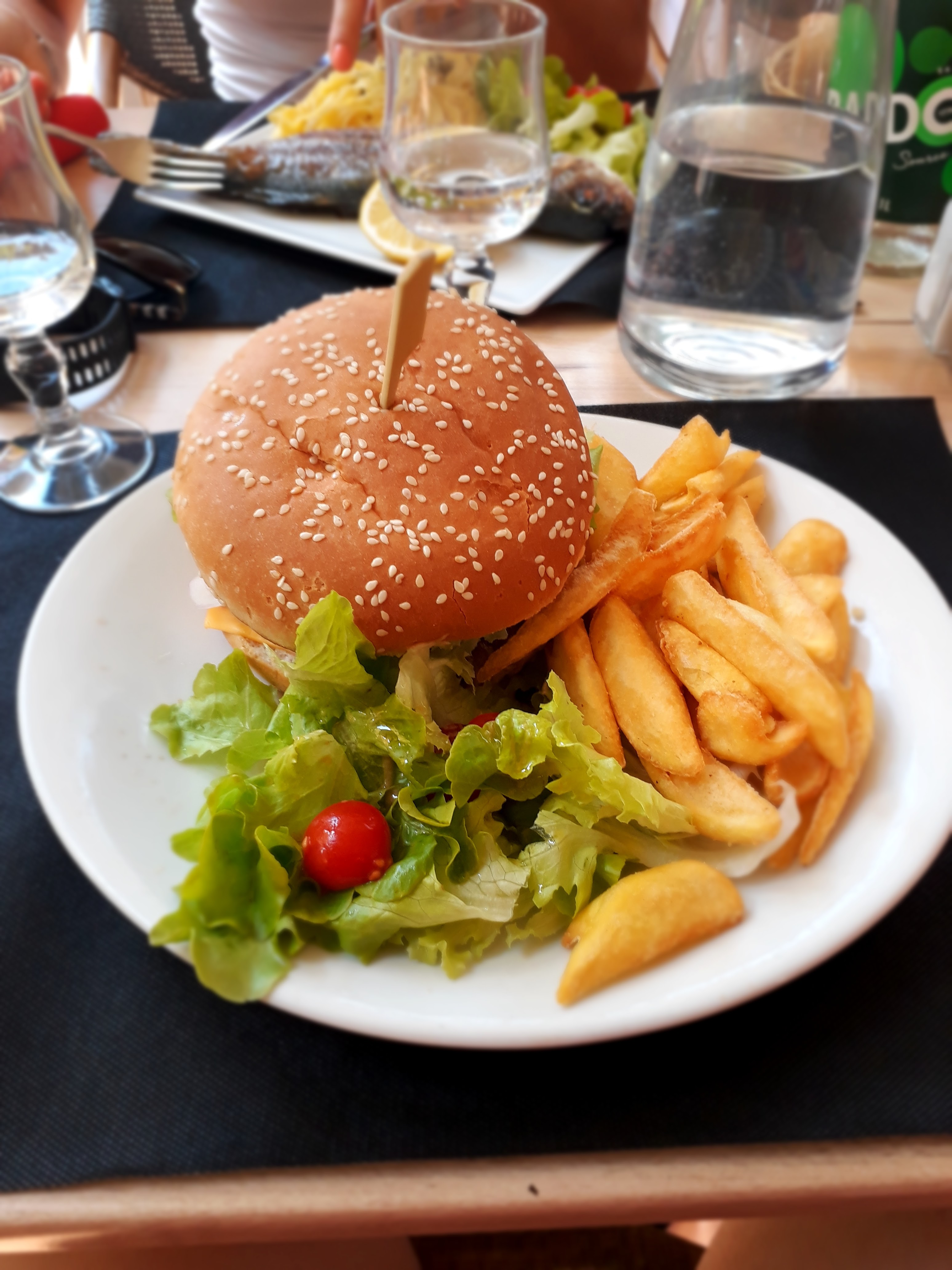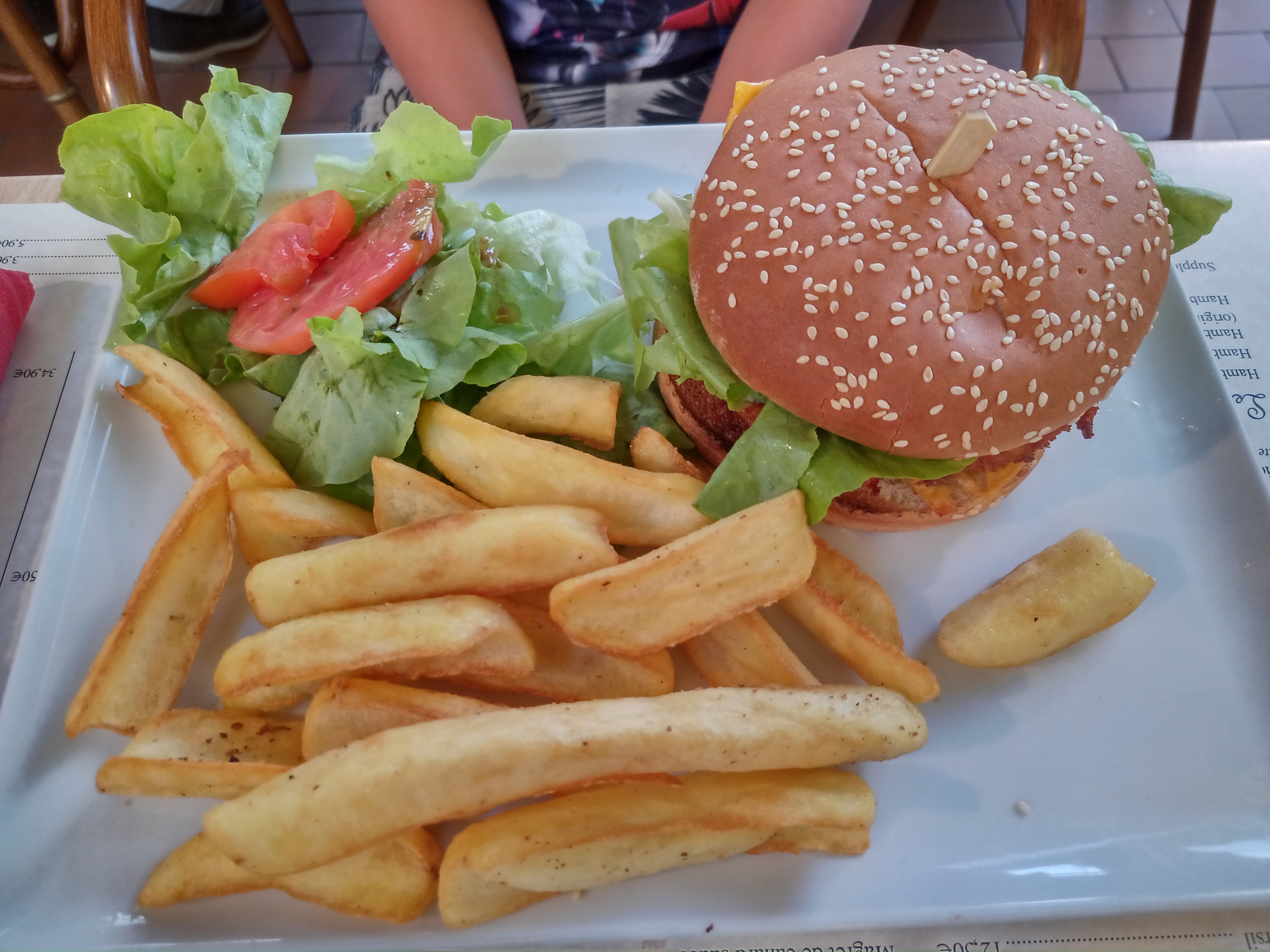 Cuisine assez simple mais bonne. Le pain du burger fait pain de bonne qualité mais de grande surface, par contre la viande et les frites étaient bonnes. Glace écœurante par contre... Côte d'Or et sauce chocolat Monin je pense, donc bien trop sucré :/ C'est dommage car une bonne sauce chocolat est simple à faire pour les glaces et pas cher.
