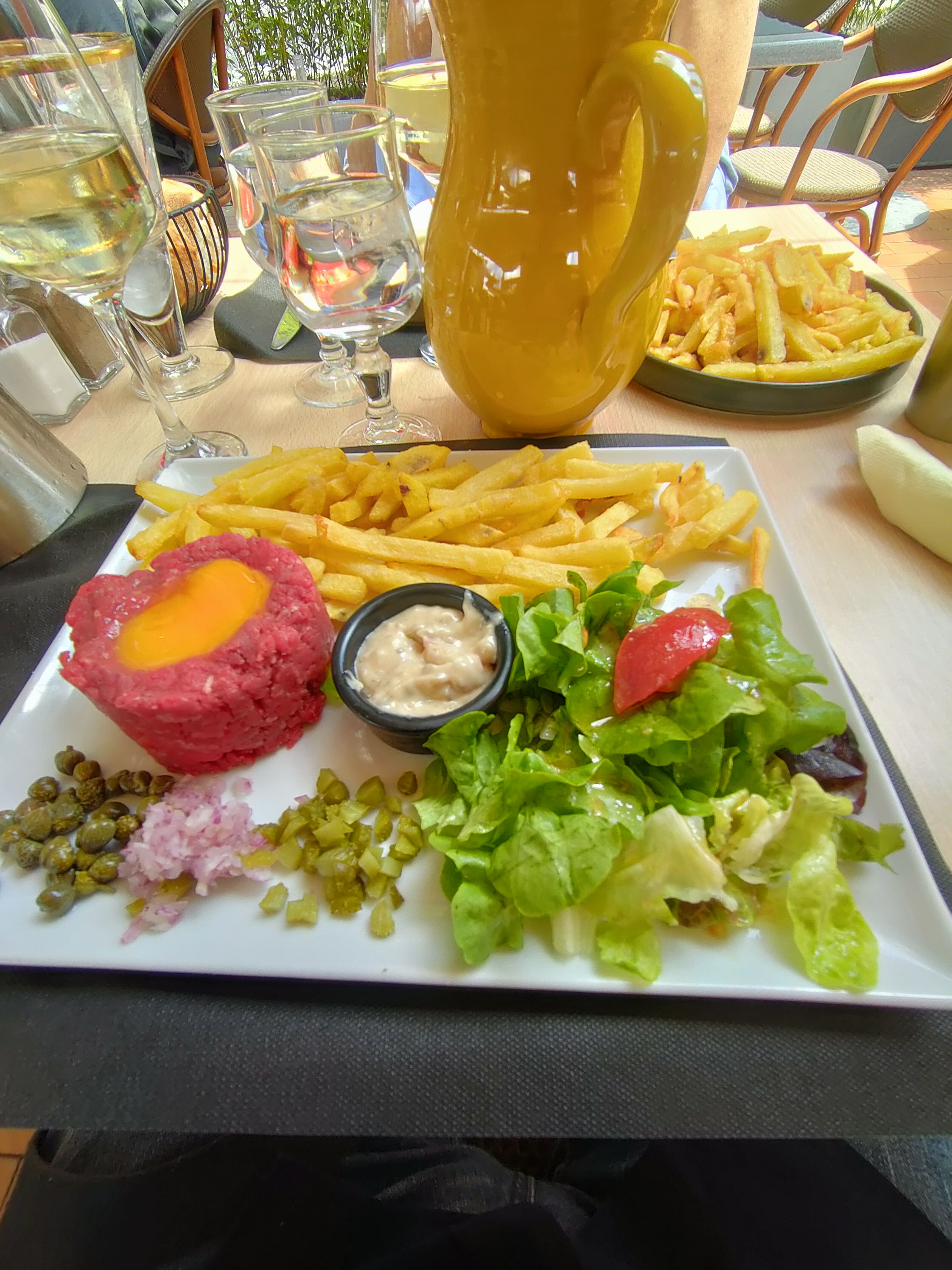 Excellent accueil. Jolie terrasse. Le saumon fumé maison était excellent. La cuisson bleue de caté de boeuf parfaite, d'ailleurs j'ai zappé la photo du début mais vous avez celle dule la fin.