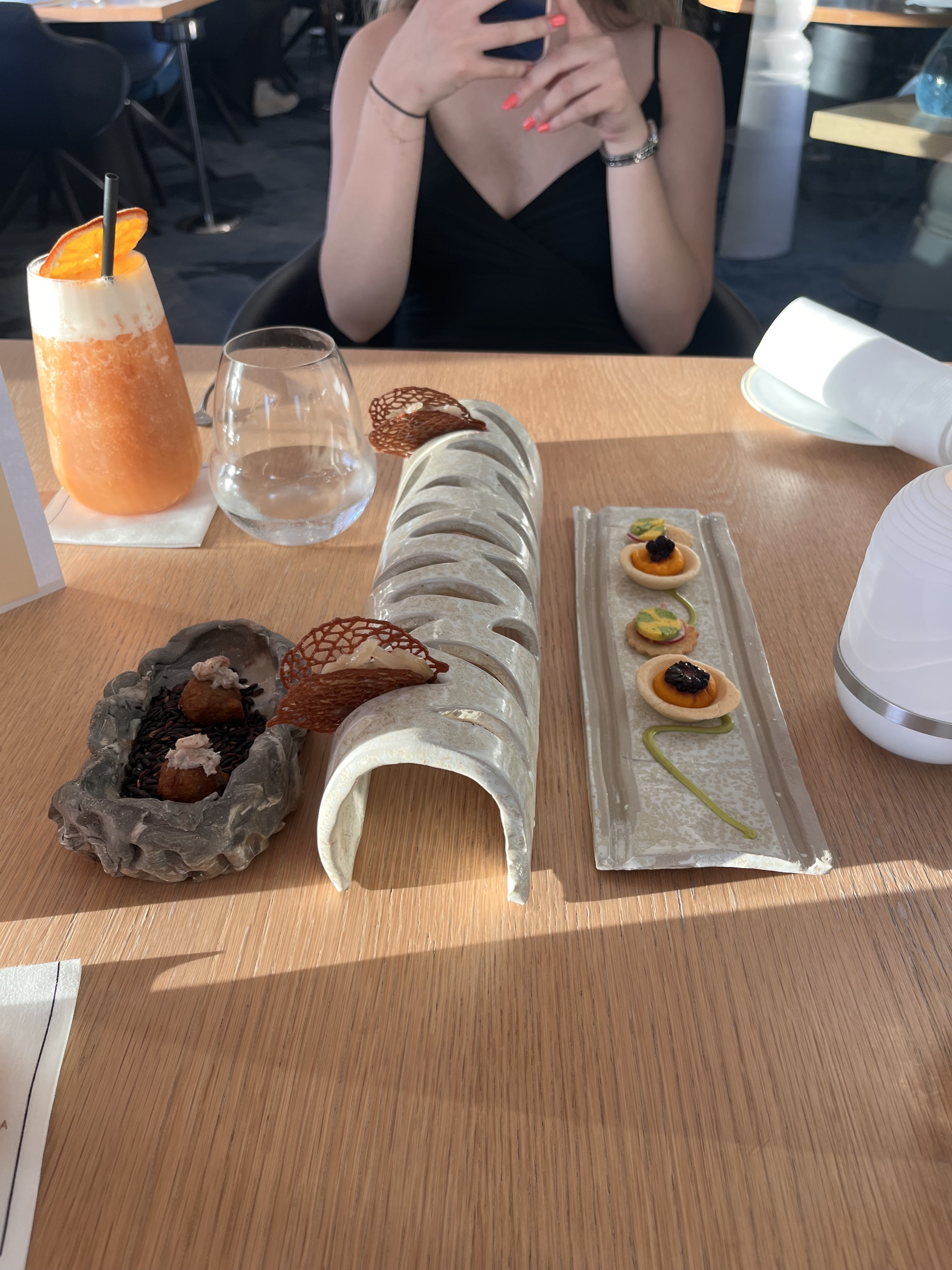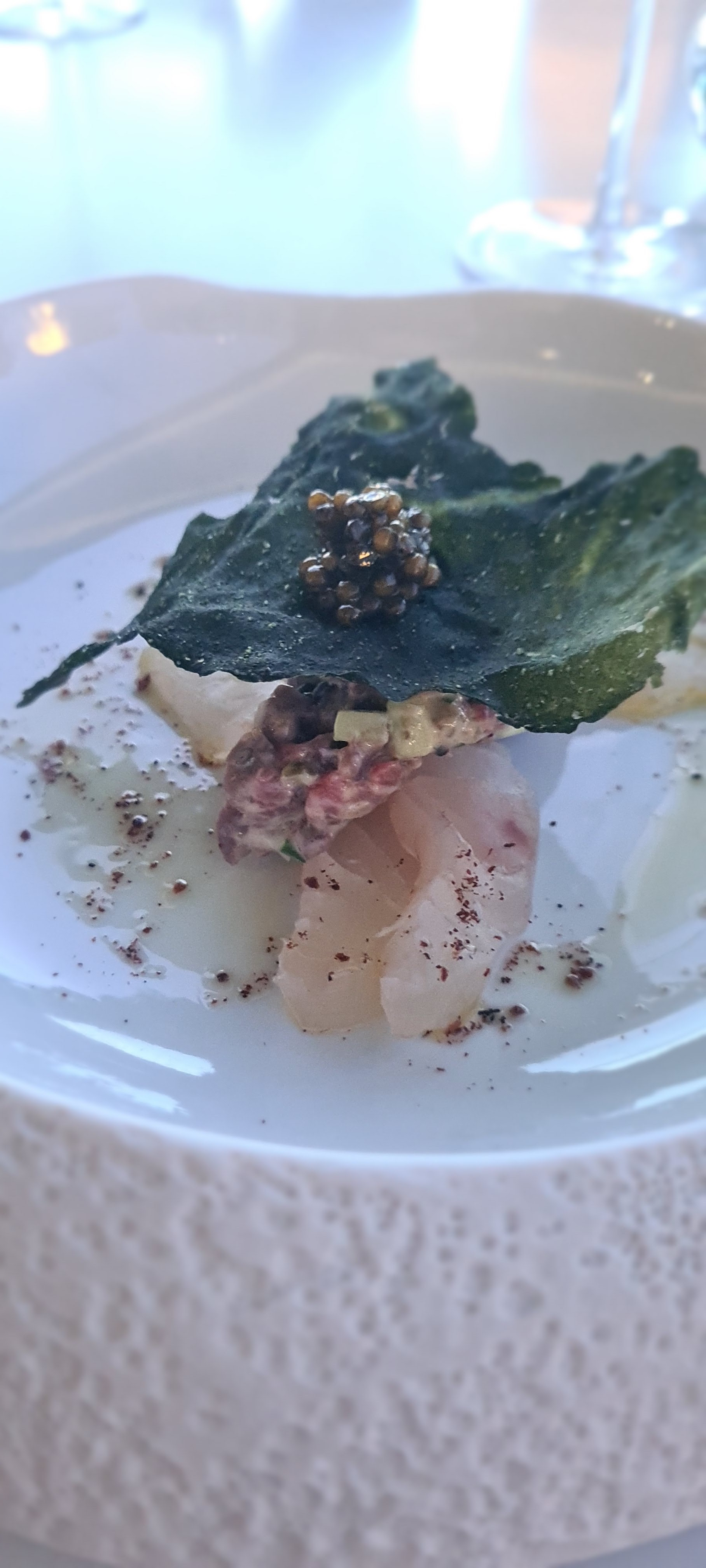La vue est exceptionnelle avec comme tableau la mer on aurait souhaité que les plats le soient aussi Un tantinet plus copieux car ici la cuillère à café fait office de référence pour les quantités Si vous avez bon appétit passez votre chemin vous êtes chez un Gastro. Les saveurs sont très originales et surprenantes . Le service est satisfaisant. L’accord mets vins est hors de prix (58€)pour les vins proposés ( souvent des cépages pas d’AOC ni de cru classé décevant) pour une carte blanche à 128€ Enfin n’attendez pas la visite du Chef . Pour conclure le style Mr J Czaplicki est équilibré avec un choix de produits irréprochables pour une justesse des assemblages.