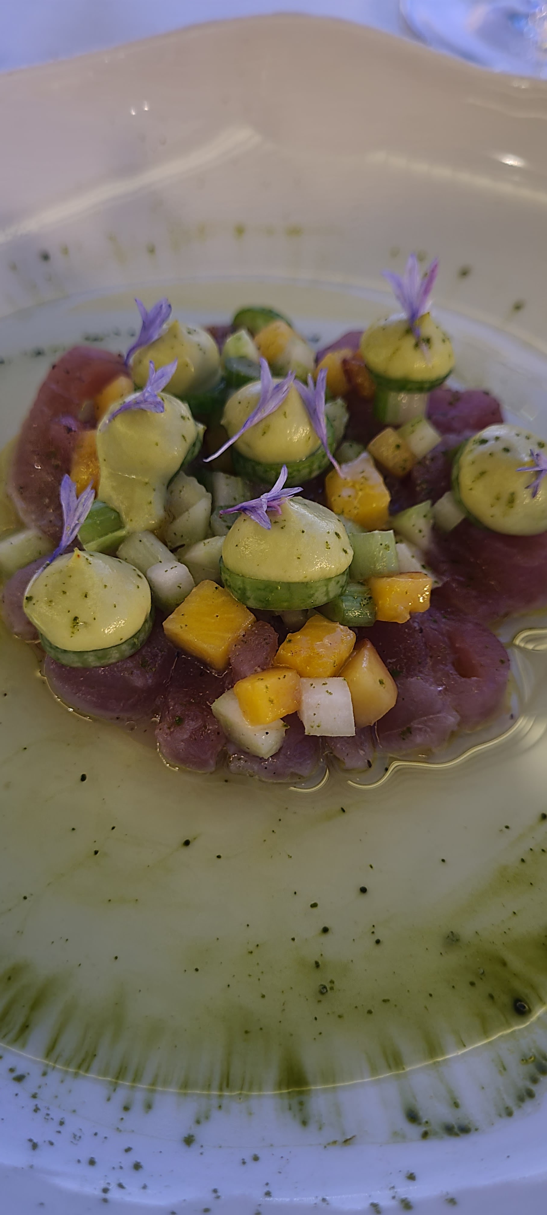 Un cadre exceptionnel, et un service attentif, mais une équipe qui semble tendue.... La maître d'hôtel gère efficacement la salle donc très peu d'attente. Nous avons pris un menu de dégustation, au prix abordable pour 5 personnes dont deux accords mets et vins sur du blanc, mission réussie pour le sommelier, mais des commentaires très brefs.... Joli dressage des plats, qui sont bons mais pas au niveau que l'on attend pour un étoilé Michelin. Ce n'est pas le genre de plats dont on se souvient avec émotion...exemple un thon mi cuit qui arrive cru..heureusement que je mange du poisson cru mes voisins de table avaient du mi cuit eux... .donc je n'ai pas mis 5 étoiles volontairement. Du coup de l'hésitation pour revenir tester la carte dont les prix sont élevés, en rapport avec l'étoile Michelin, quand la saison sera terminée..