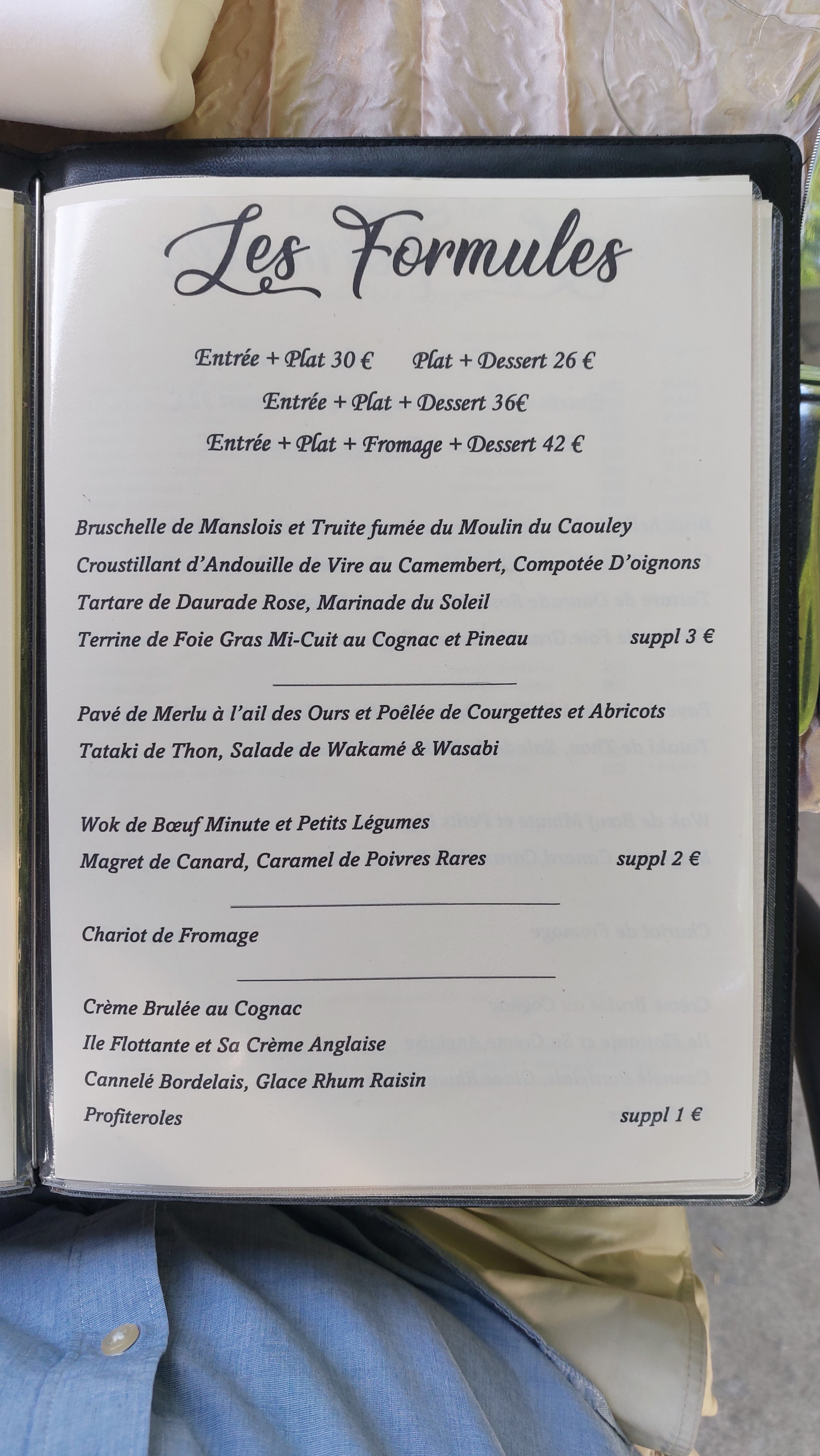 Un seul menu, pas de carte, prix non justifié pour ce menu . Entrée classique hors foie gras ( une petite tranche) supplément 3 euros ! Plat 4 choix ! De grands noms et petites quantités ! Dos de saumon sur lit de courgettes et abricots secs servi sur assiette à dessert !!! Wok avec de la bavette très saignante et gros morceaux ( non digne d’un maître restaurateur) 82 euros pour 2 bières, 50 cl de vin de région , entrées et plats. Déçus et étonnés des commentaires précédents.