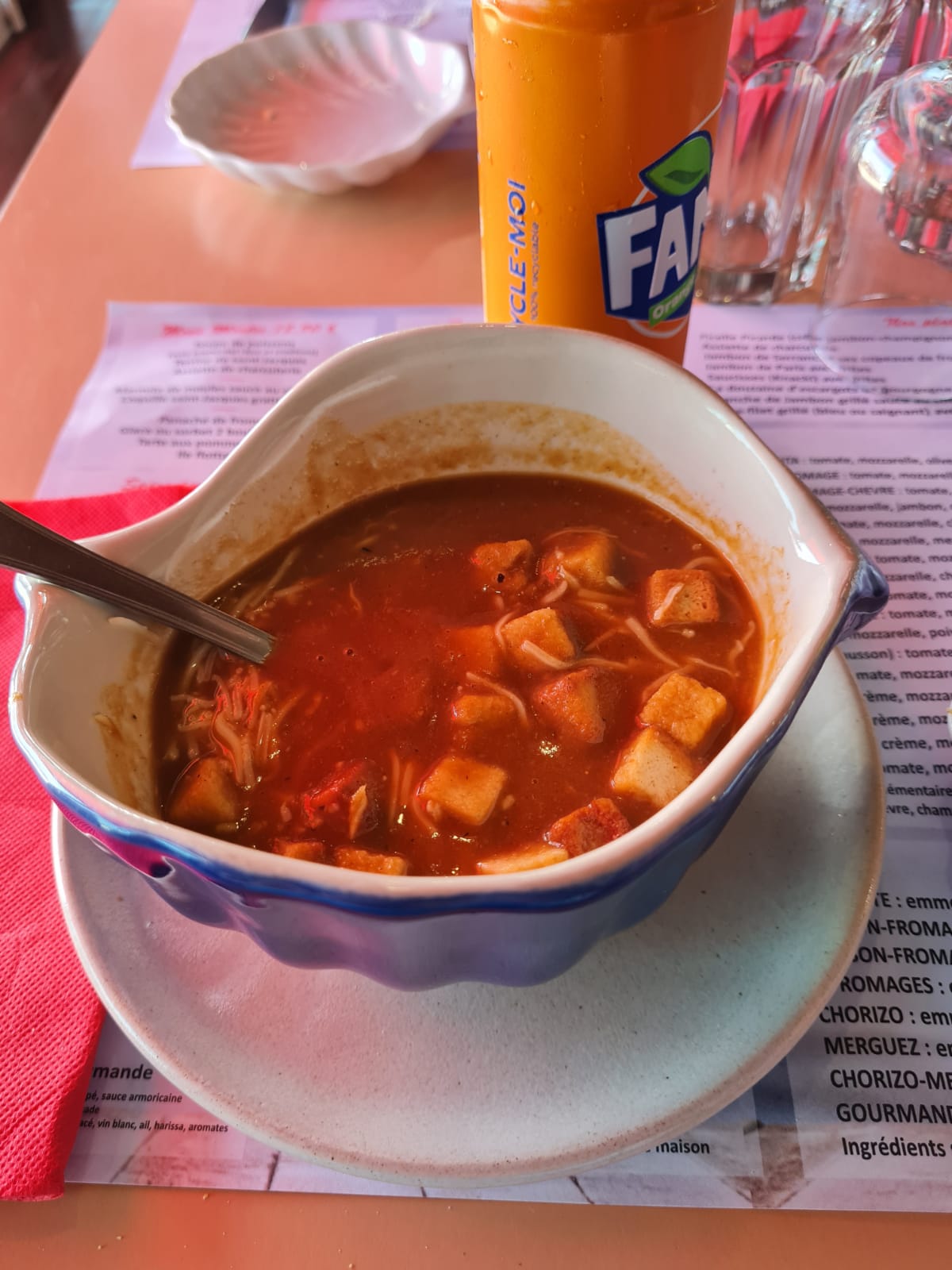 C'est une honte ce restaurant ! Une attente interminable ! Un service lent très lent avec une serveuse peu aimable. J'ai demandé une soupe de poisson, elle avait un drôle de goût, elle était aigre. Pour couronner le tout jai été malade toute la journée du lendemain. C'était durant la deuxième semaine d'août. À éviter à tout prix. Passer votre chemin.
