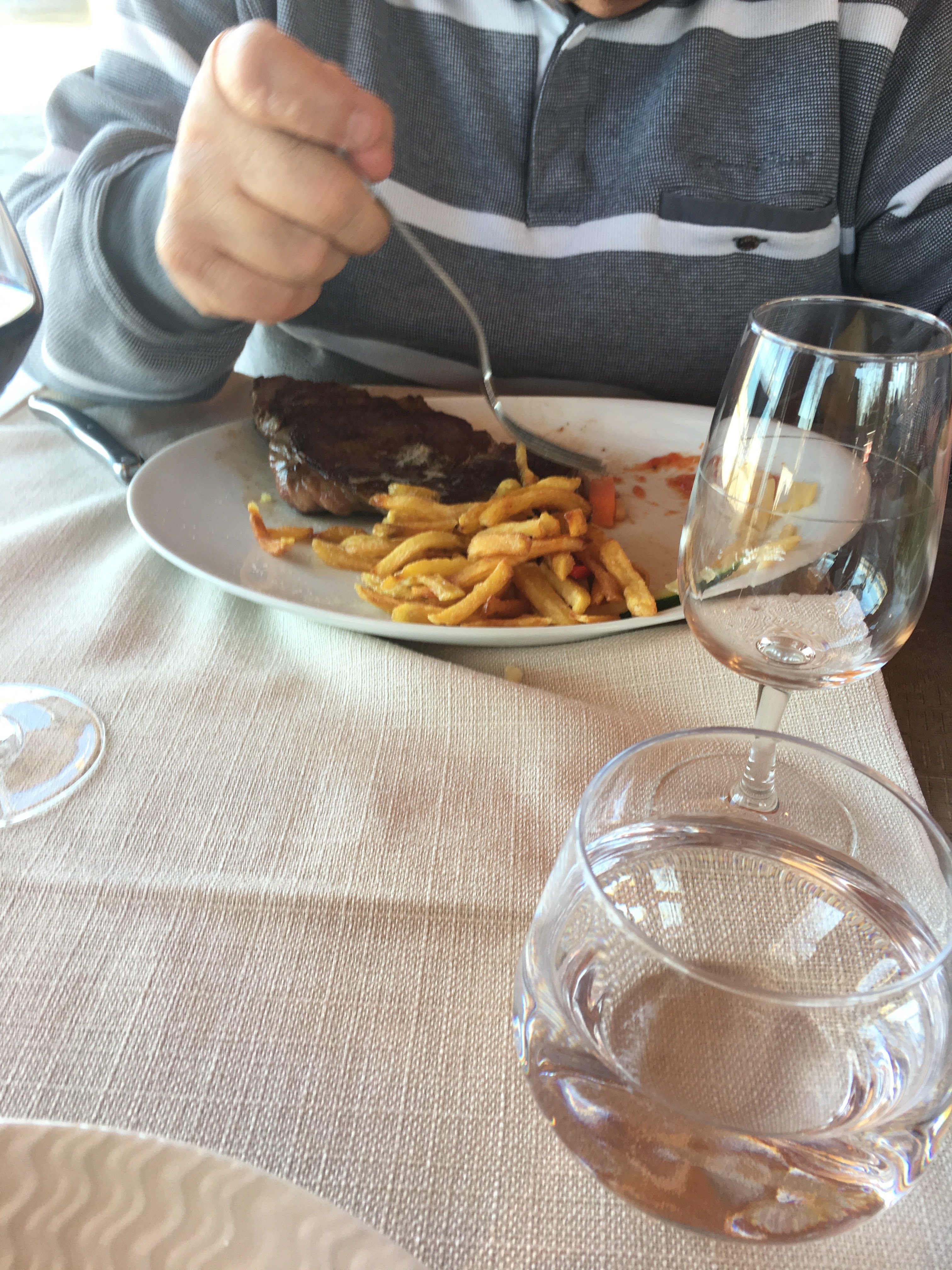 Alors tout d'abord, à peine assis, le cadre .. merveilleux avec les couleurs de feu du couché de soleil. Pas du tout de la région, nous demandons conseil pour une bouteille en accompagnement du plat. Une bouteille local et des filets de perches parfaitement assaisonner le tout accompagné d'une serveuse très très souriante. Tout était très bien.