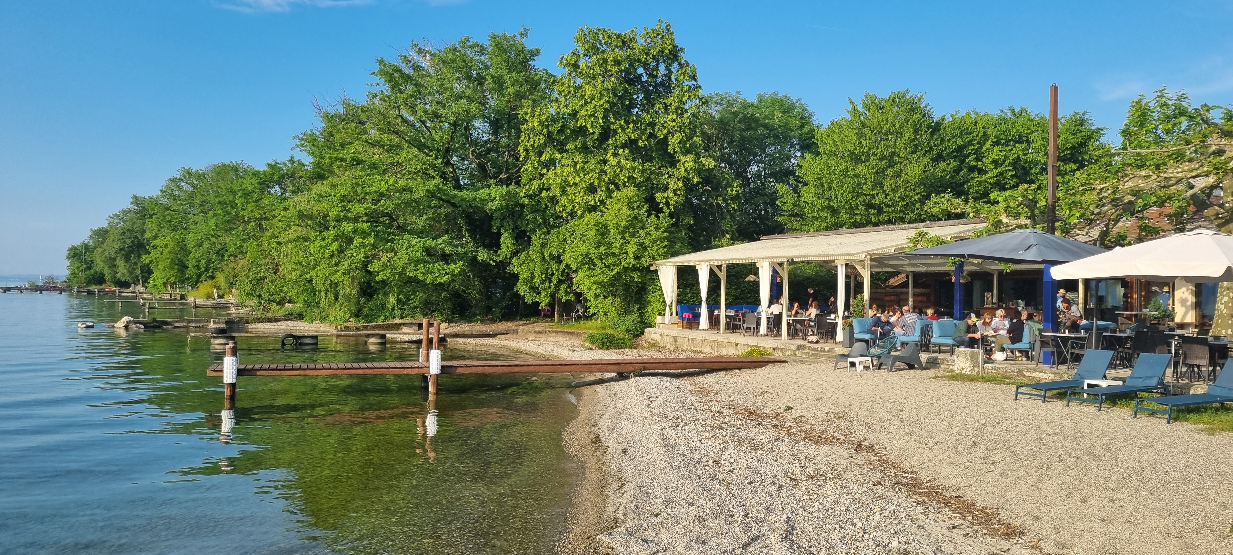Superbe endroit Plage privée avec transats pour l'apéro ensuite repas avec vue sur le lac et coucher de soleil. Service impeccable, personnel sympathique et patron aux petits soins. Je recommande vivement.