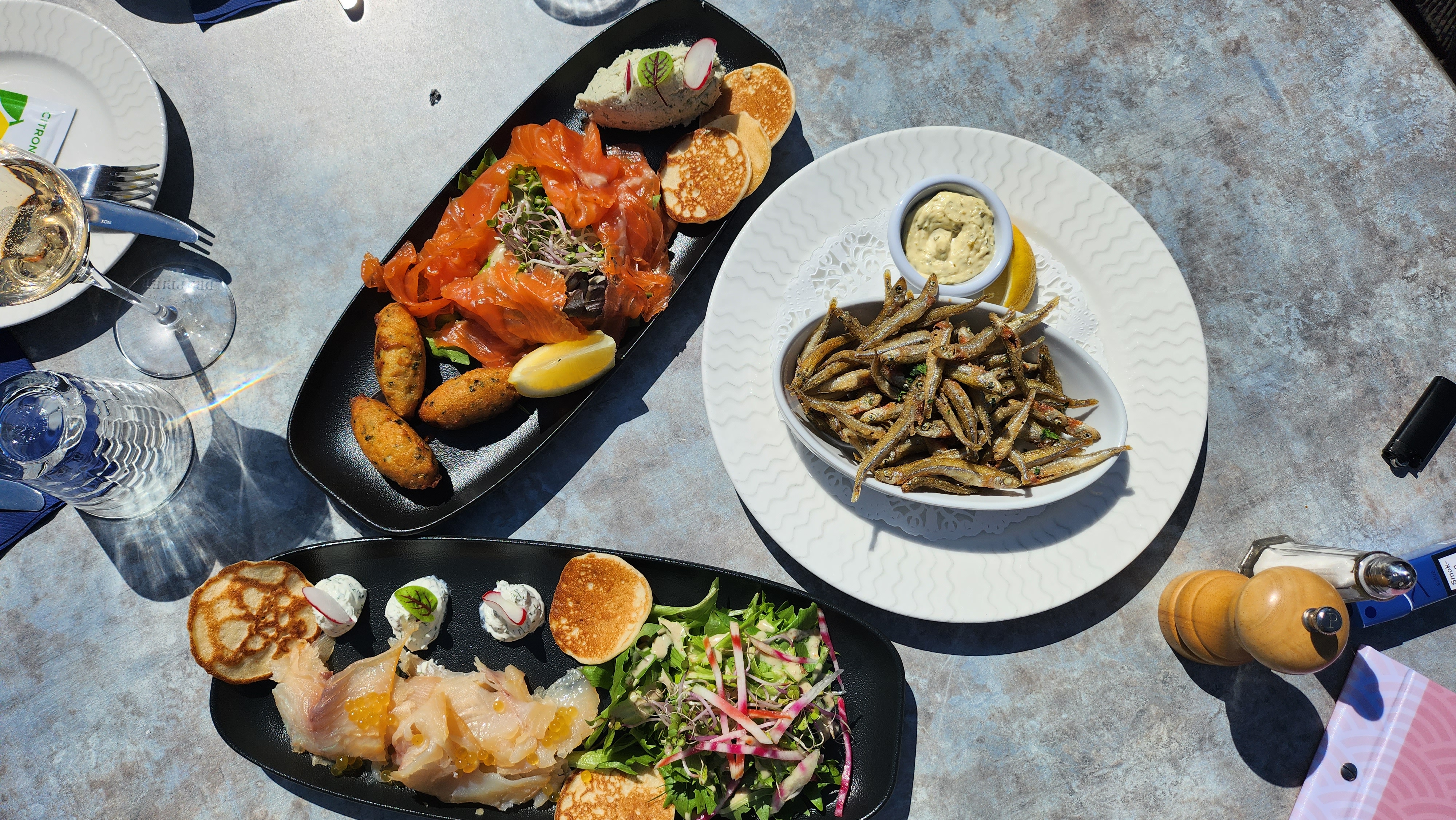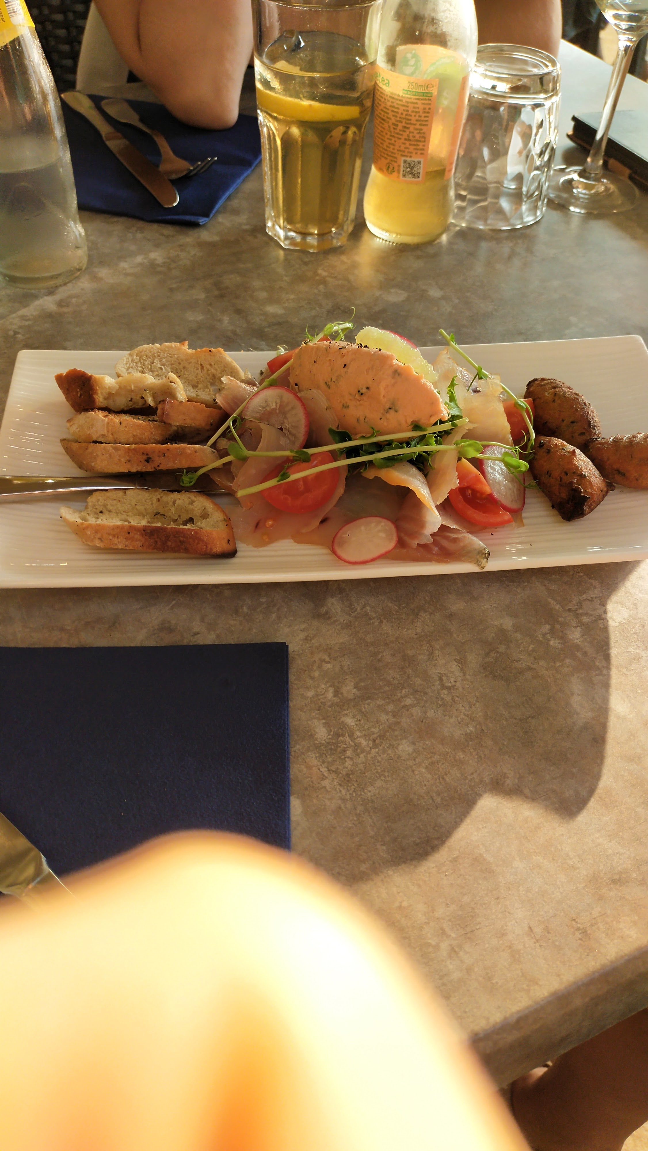 Terrasse grande et ombragée, cadre magnifique. Accueil chaleureux et service au top . Tapas, filets et desserts excellent .Seul bémol, il n y a pas de menu proposé sur la carte . Dommage ..