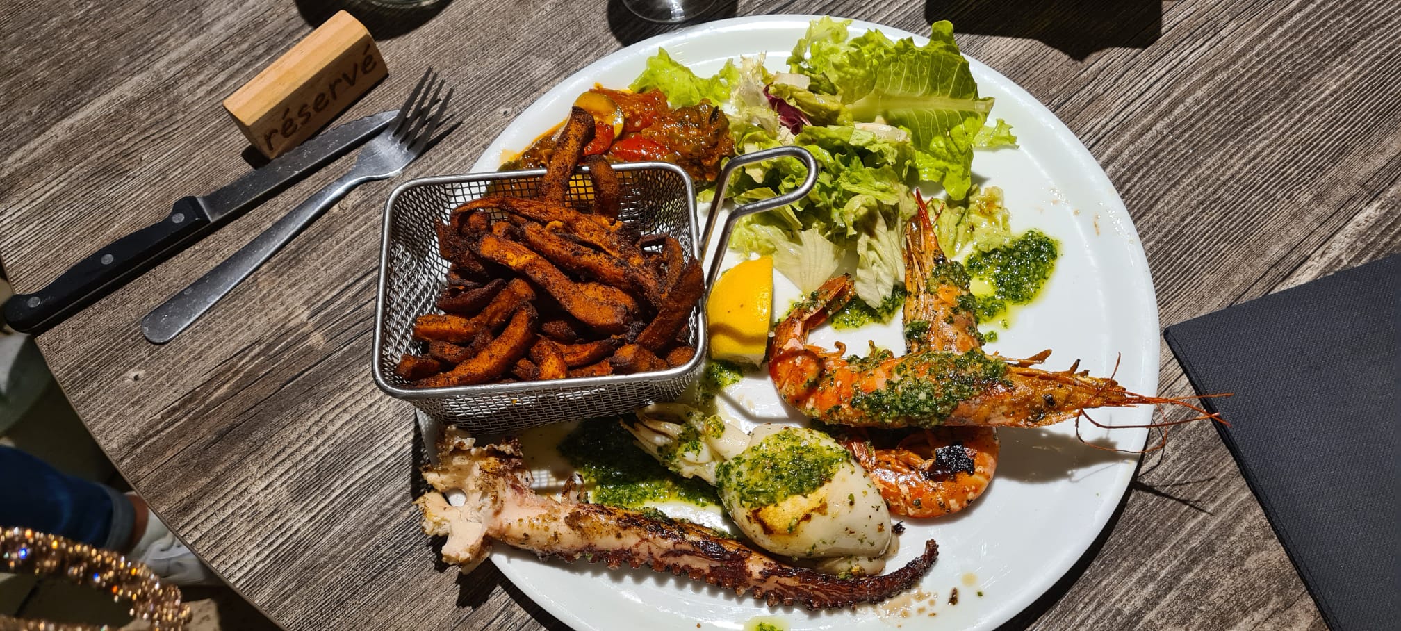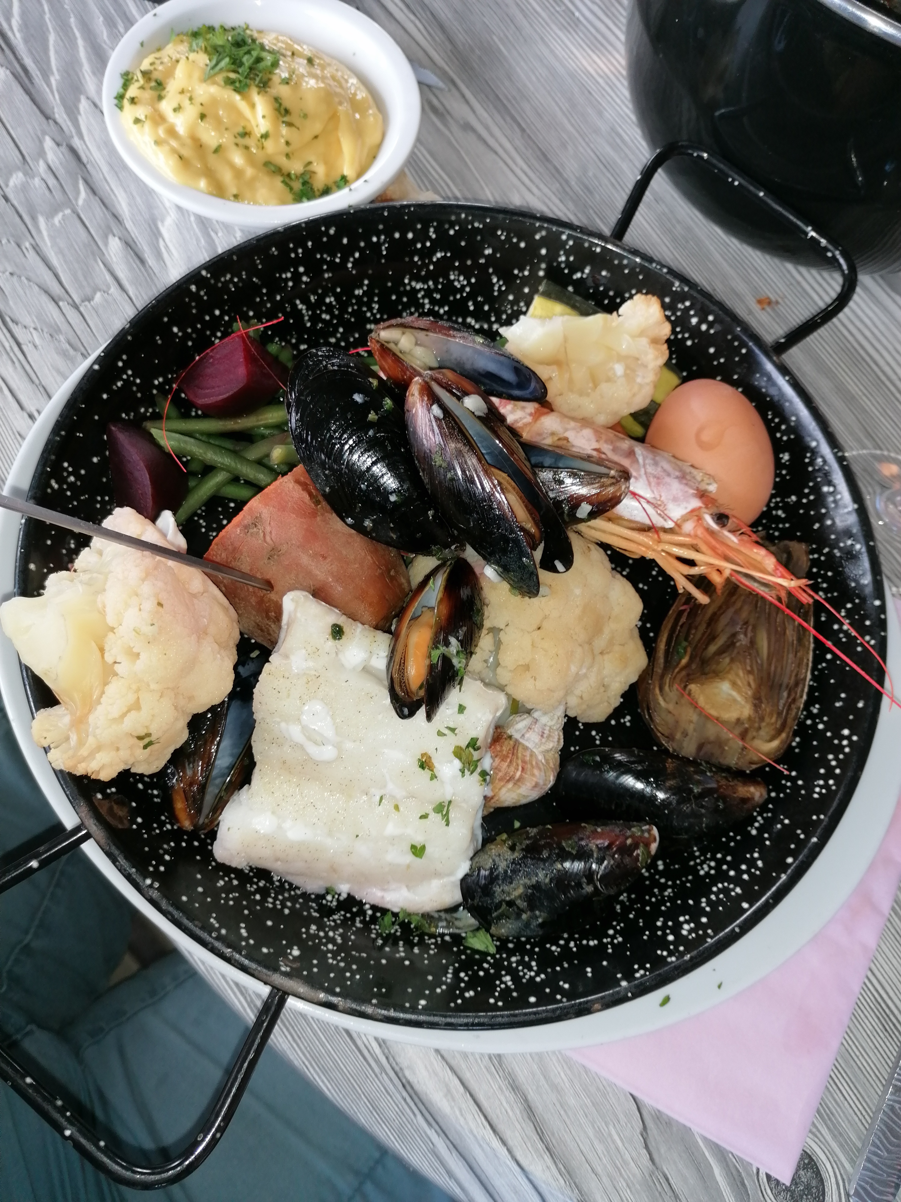 Nous avons pris l aïoli, les légumes étaient soit trop cuits ou pas assez cuits, les moules qui étaient froides avaient une forte odeur, également le burger qui était froid, il a fallu relancer la serveuse plusieurs fois pour avoir le pain, le vin et les lingettes pour s essuyer les mains, c était très bruyant, je ne recommande pas ce restaurant...