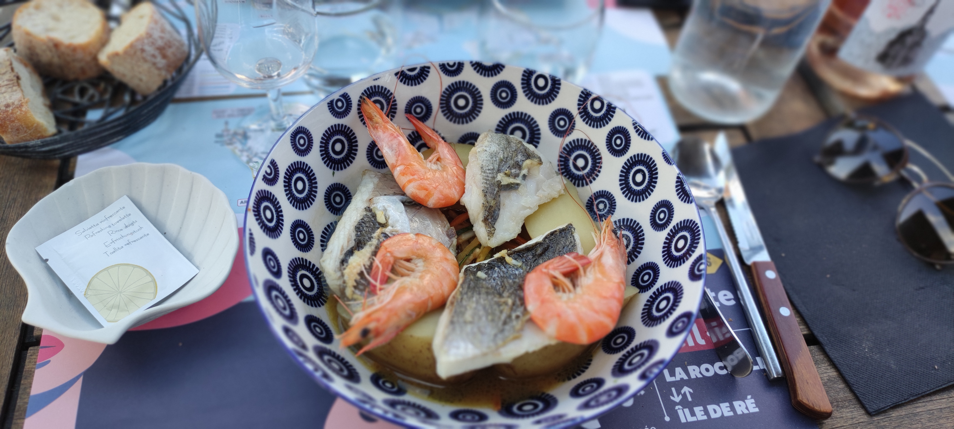 Si vous devez dîner dans un restaurant à la Flotte…..N’hésitez pas. Ce restaurant offre u e belle terrasse avec une vue magnifique sur la mer à 2 pas du port. Mais que dire des plats! Une soupe de poulpe à tomber, un pressé de saumon et une terrine de chèvre piquillos extra ! Le personnel est aux petits soins pour vous Tout est fait maison. Pour une addition très très raisonnable puisque à 2 avec l’apéro, le vin , entrées et plats on s’en sort pour 90€…..en plein mois de juillet. Bravo à toute l’équipe !!