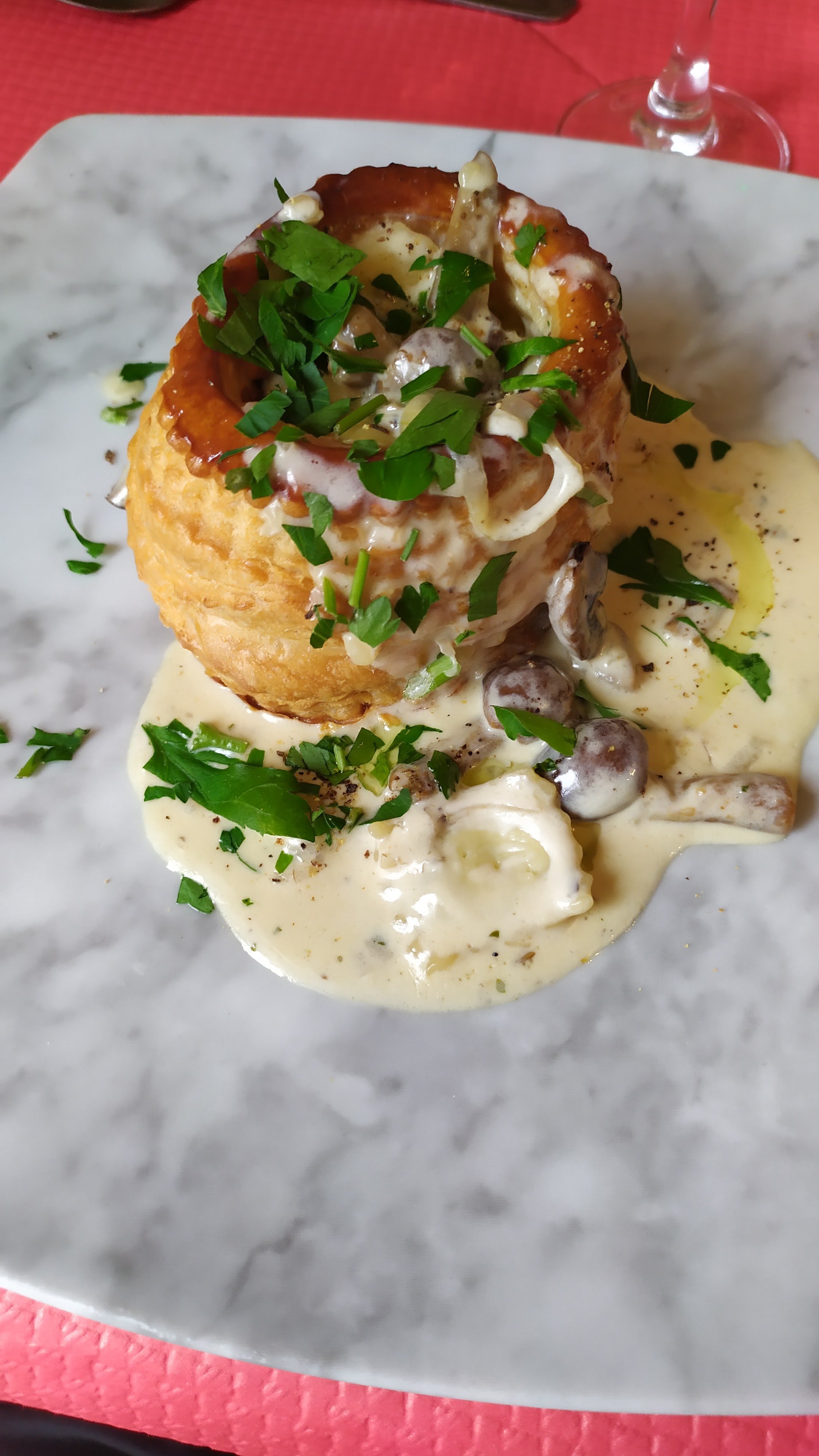 Super nous avions prix vol au vent suivi de la tête de veau Et suivi d tiramisu et une crème brûlée c'etait un délice la serveuse était formidable elle explique bien le cadre était super, les assiette était très chaud et je félicite le chef et tout son équipe car c'est rare d'avoir des assiettes chaude je le recommande avec plaisir et succès vous ne serait pas dessus encore merci