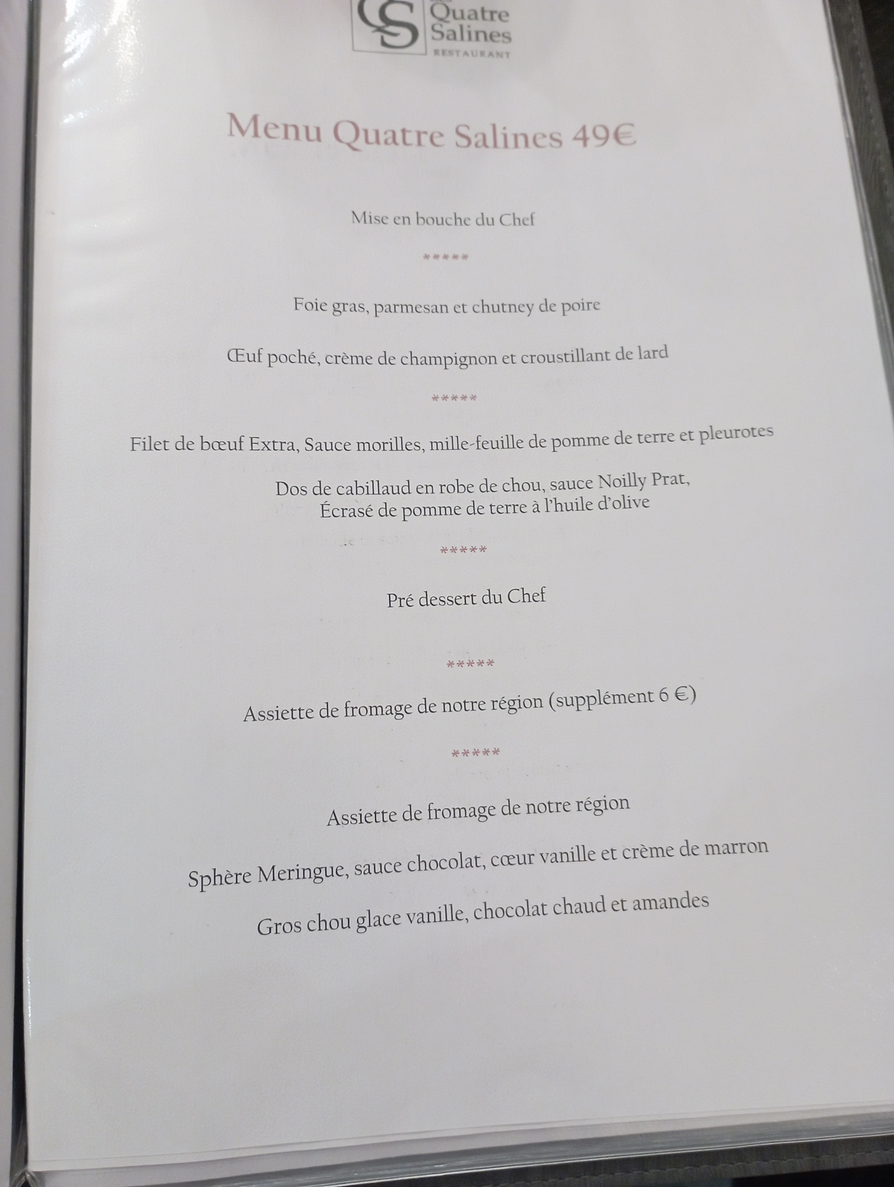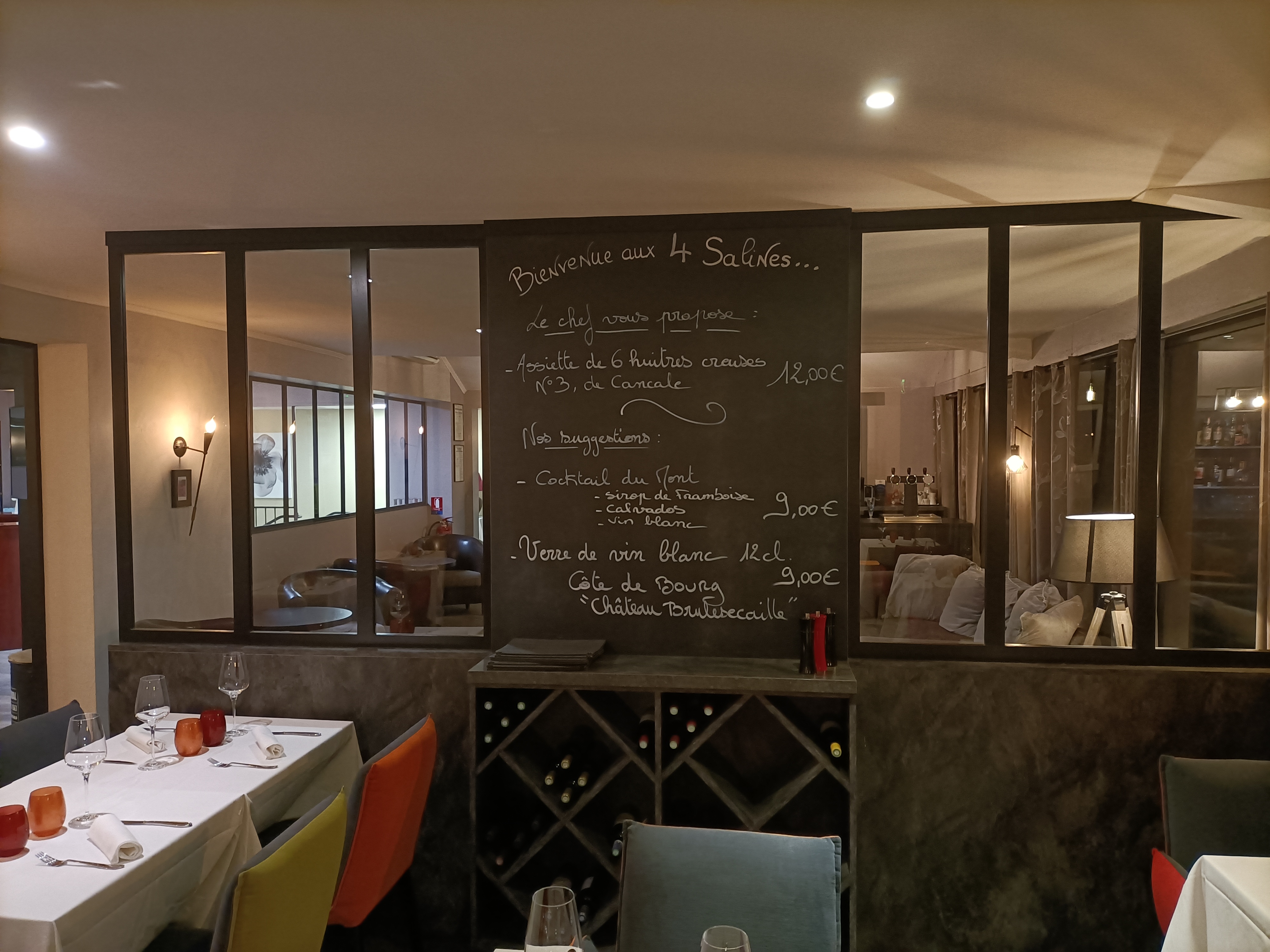 OMG.....Le menu des 4 salines inoubliable ! D une finesse des produits de qualité je n ai jamais mangé une viande aussi tendre et goûteuse En entrée tartare de veau super bon le bœuf tendre goûteux et le choux caramel beurre salee waouw Merci au chef pour cette expérience incroyable ....nous étions venus pour le mon saint Michel nous reviendrons pour les 4 salines ...les chambres moderne sont agréables propre il y a tt ce qu il faut Merci pour ce séjour et ce n est que partie remise A bientôt