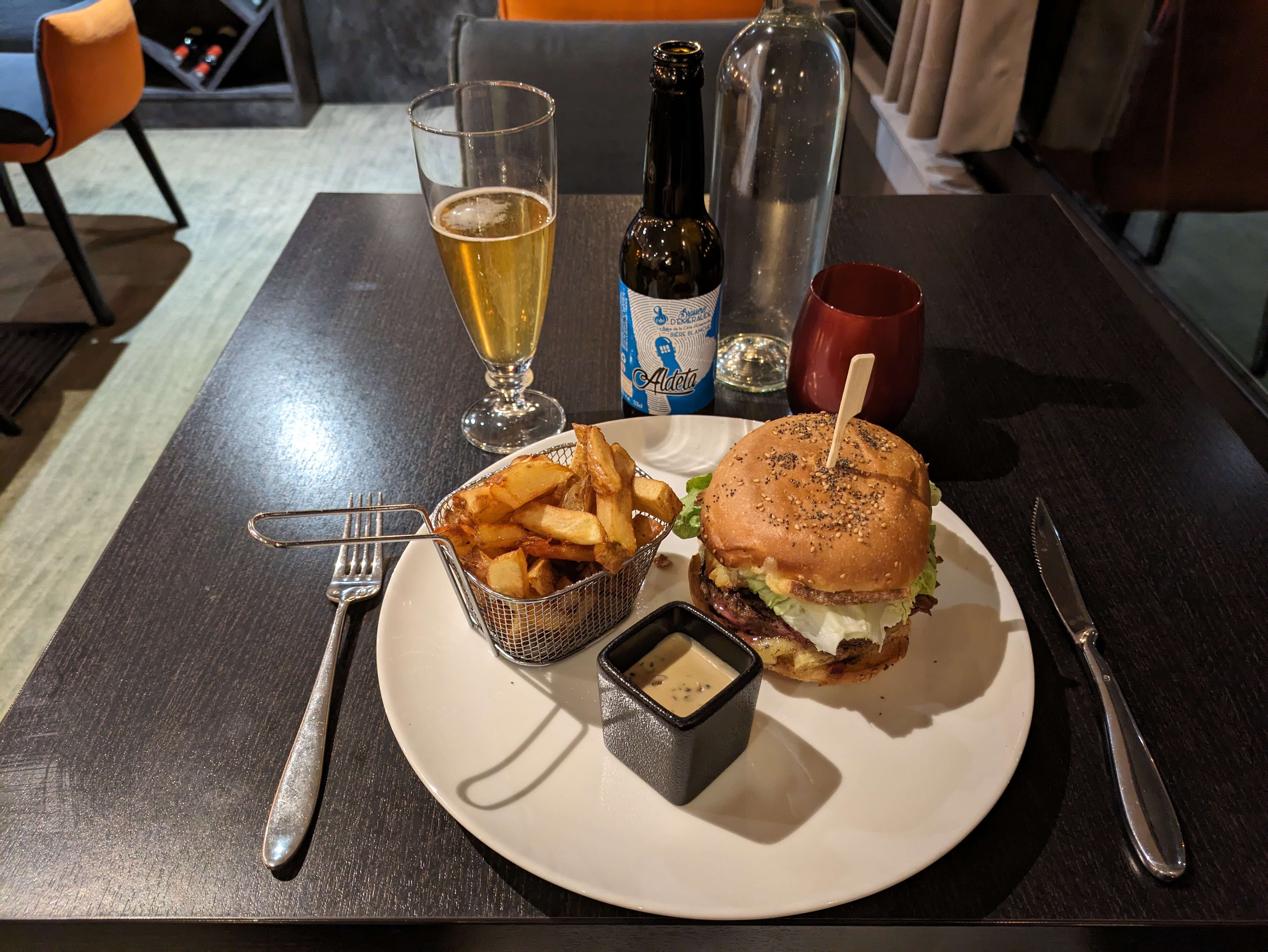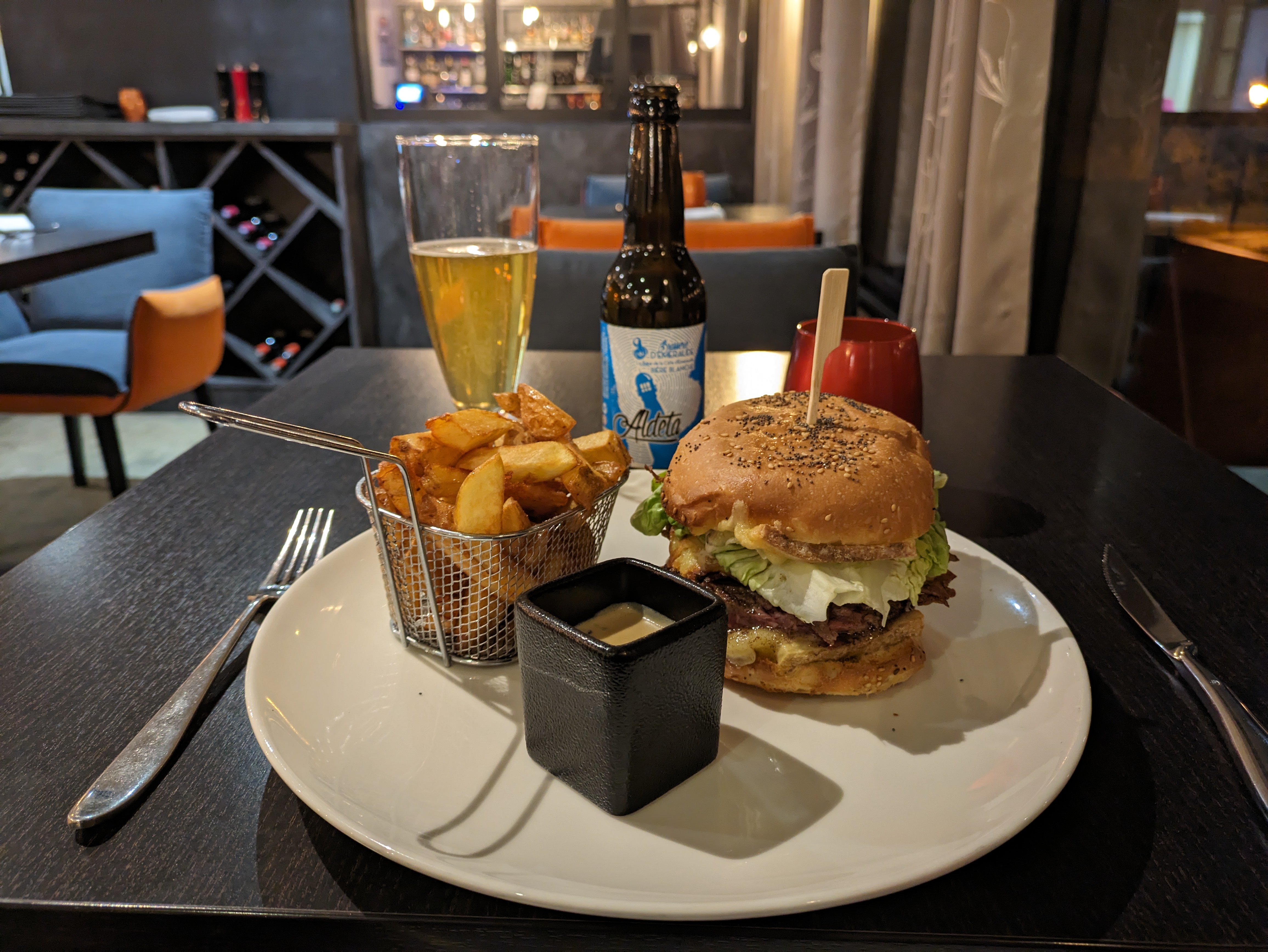 Et bien en voici une belle découverte que ce restaurant un peu perdu et où il faut réserver à l' avance c'est mieux 😉 Alors cadre super sympa, le mobilier est cosy, la serveuse très gentille, ...pour ce qui est de la restauration, un service super rapide et pourtant de qualité, des plats qui donnent envie et qu'on a envie de déguster .... Pour ma part ce fut le Breizh burger avec une petite bière locale , la Aldeta bien fraîche ... Pour le dessert qui est pas en photo une sphère chocolat m, sa glace vanille a l intérieur le tout arrosé de chocolat tout chaud pour découvrir sa glace caché ^^ En bref tout ça était très bon, bien assaisonné et à un prix modéré ... Recommandation à 100%