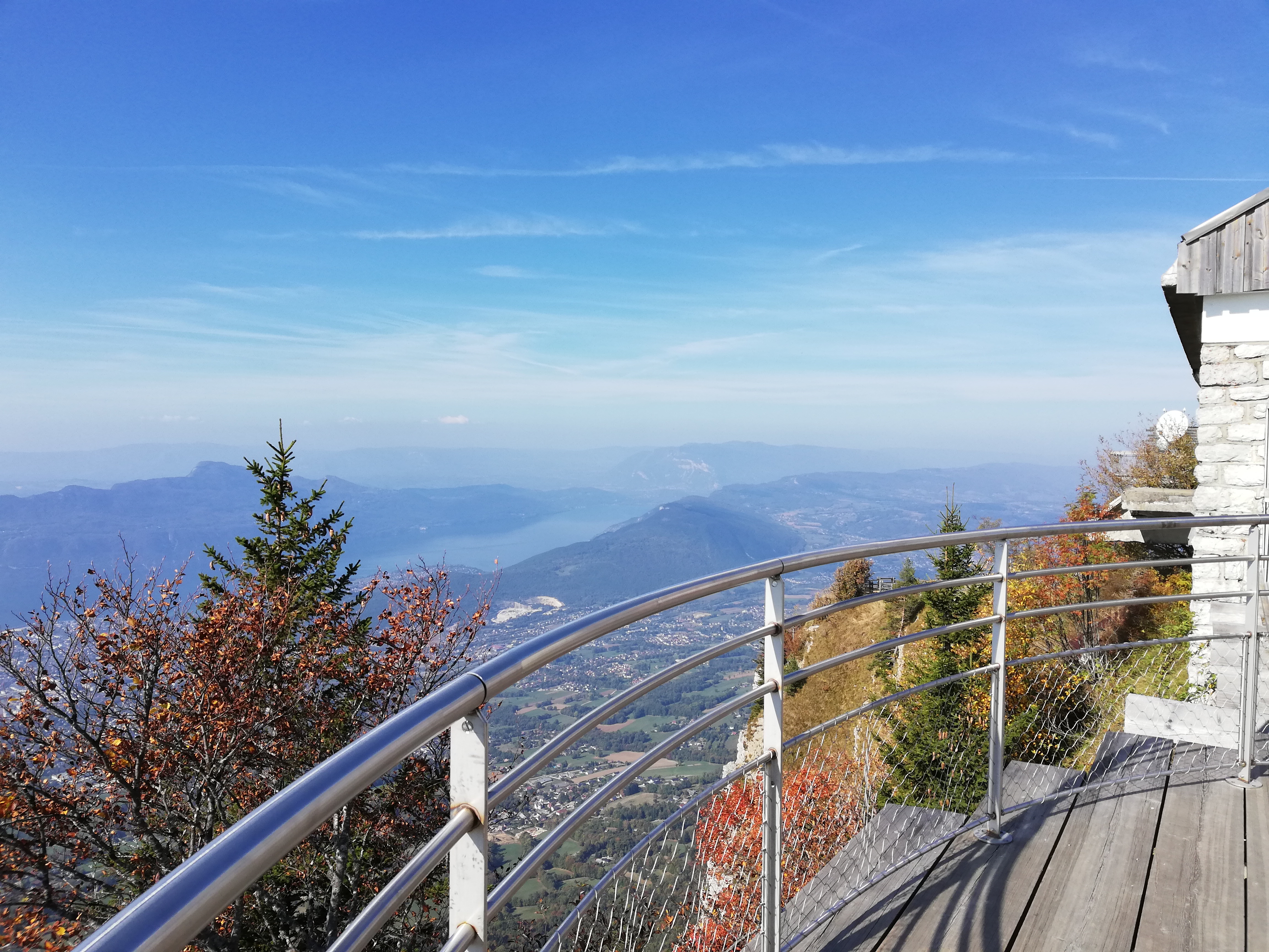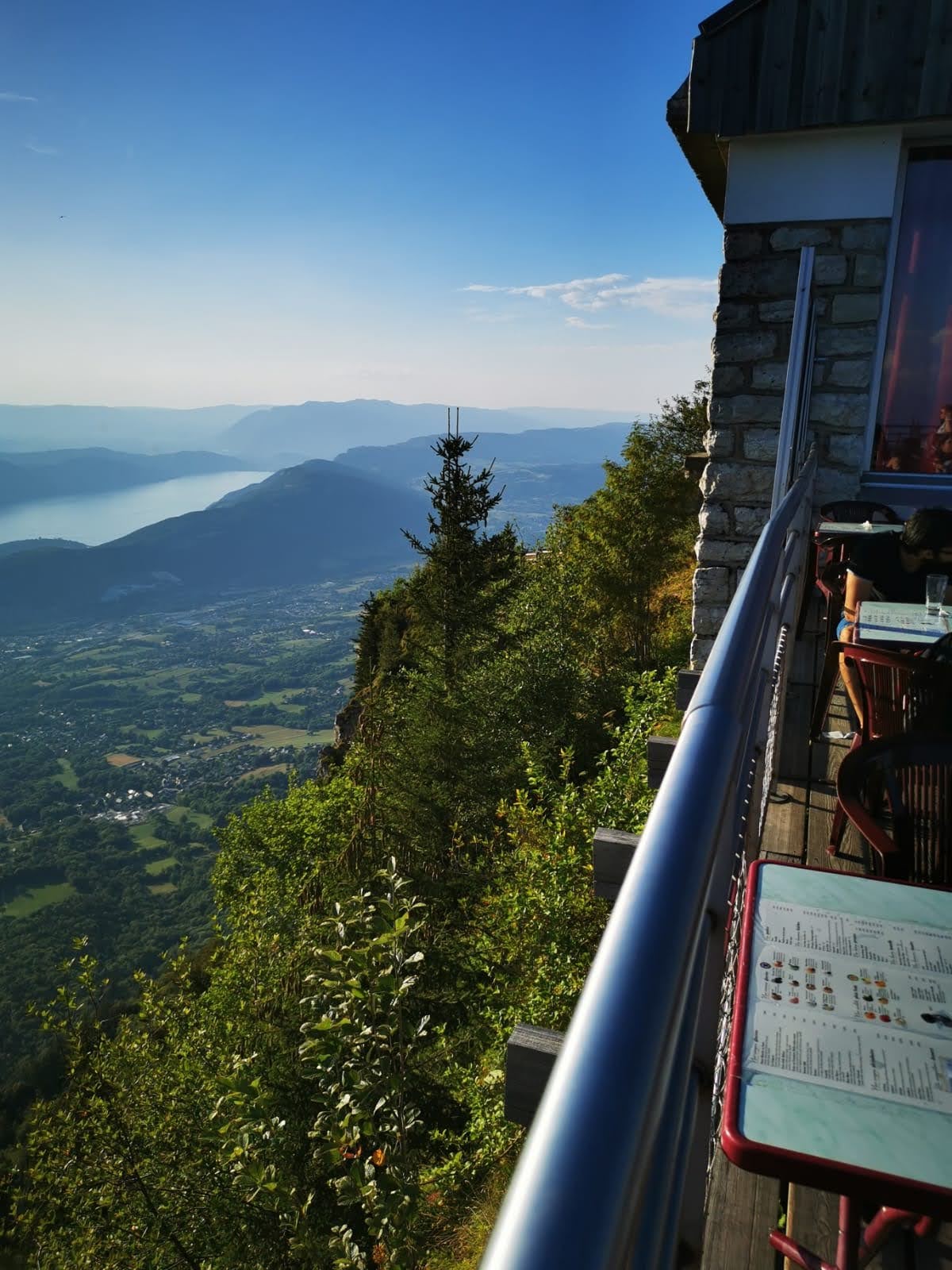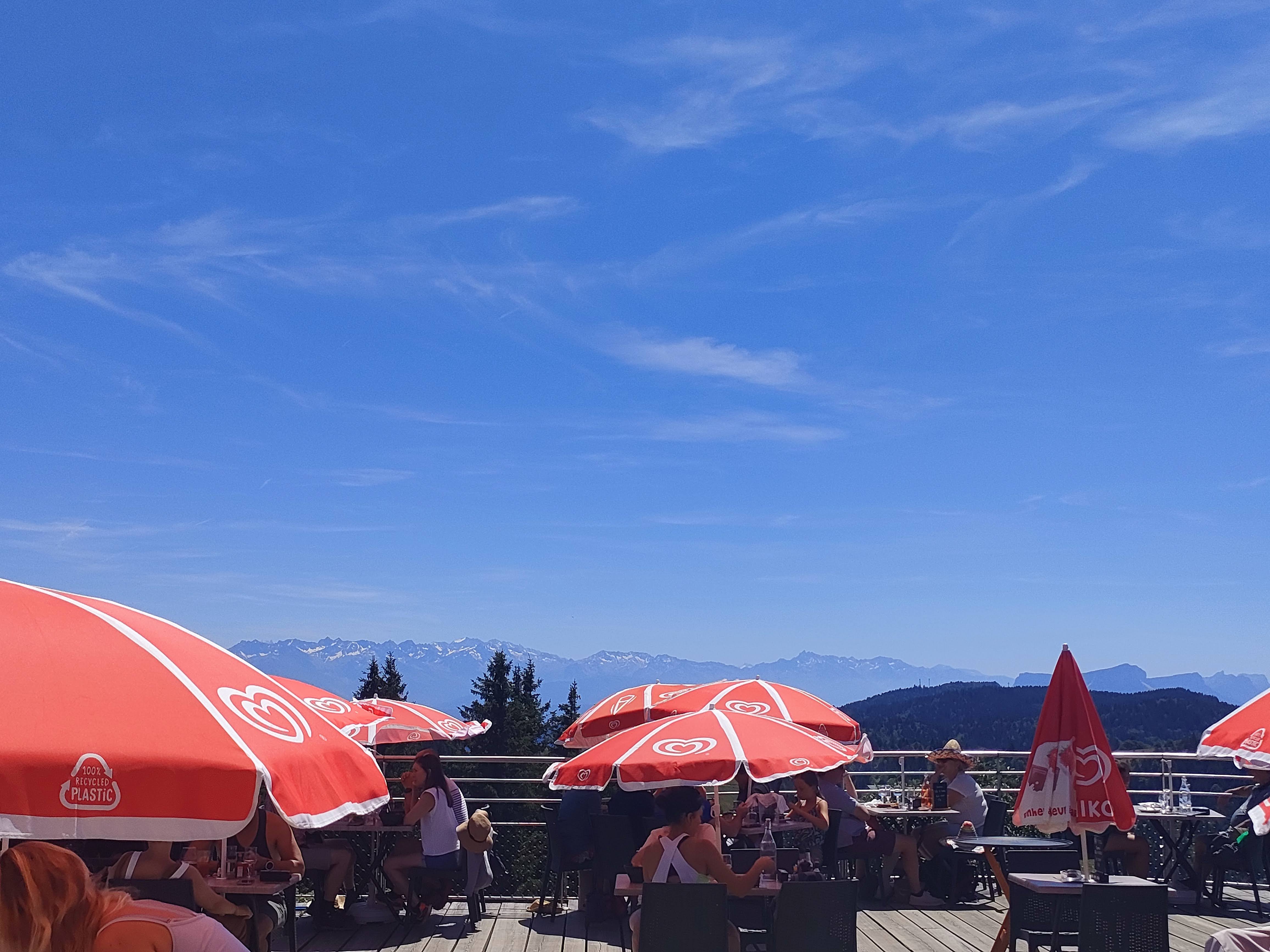 Panorama exceptionnel avec vue sur le lac du bourget , le mont blanc , la dent du chat ! Sympa pour se poser boire un verre après une rando. Le personnel est peu enthousiaste et se presse de vous en encaisser pour laisser place au futurs clients .un peu dommage mais avec le rush cela peut être compréhensible.nous avons pris une pause sucrée glace et brioche perdue très bon.tarif plus cher mais étant le seul restaurant du mont c'est le petit forfait à payer pour le panorama.