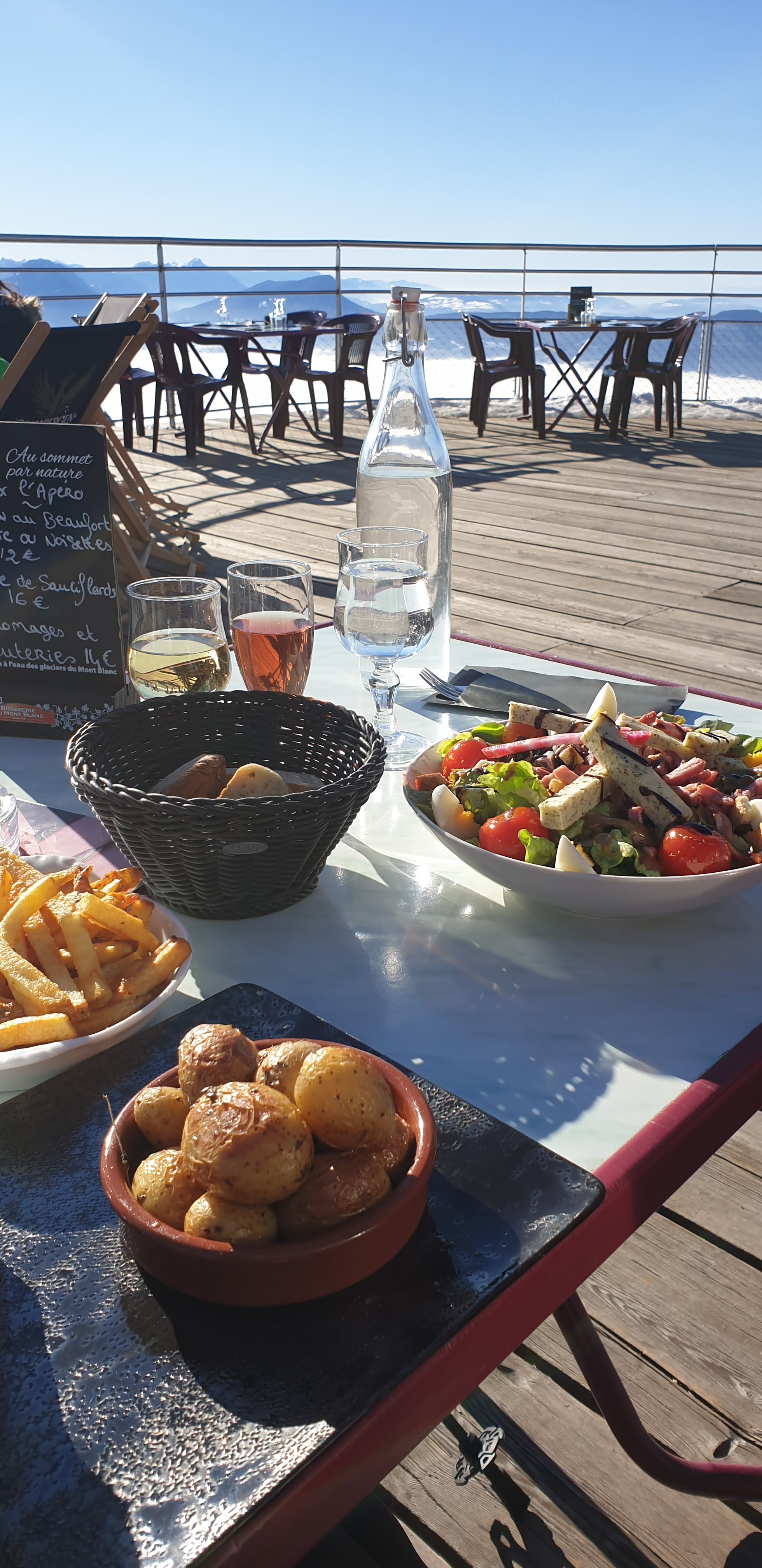 il s'agit d'un de ces endroits où l'emplacement (exceptionnel ici pour la vue à 270°, du Mont Blanc au Lac du Bourget) fait presque tout, mais justement il faut souligner le service sympathique que l'on ne trouve pas toujours dans ce genre d'endroits touristiques en France. Ce n'est pas de la haute gastronomie, mais il faut également rendre hommage au fait qu'ils proposent des plats végétariens, ce qui n'est pas encore si courant en France dans les restaurants traditionnels. La tartiflette végétarienne fait du bien après etre monté en vélo et est beaucoup moins lourde qu'une tartiflette traditionnelle