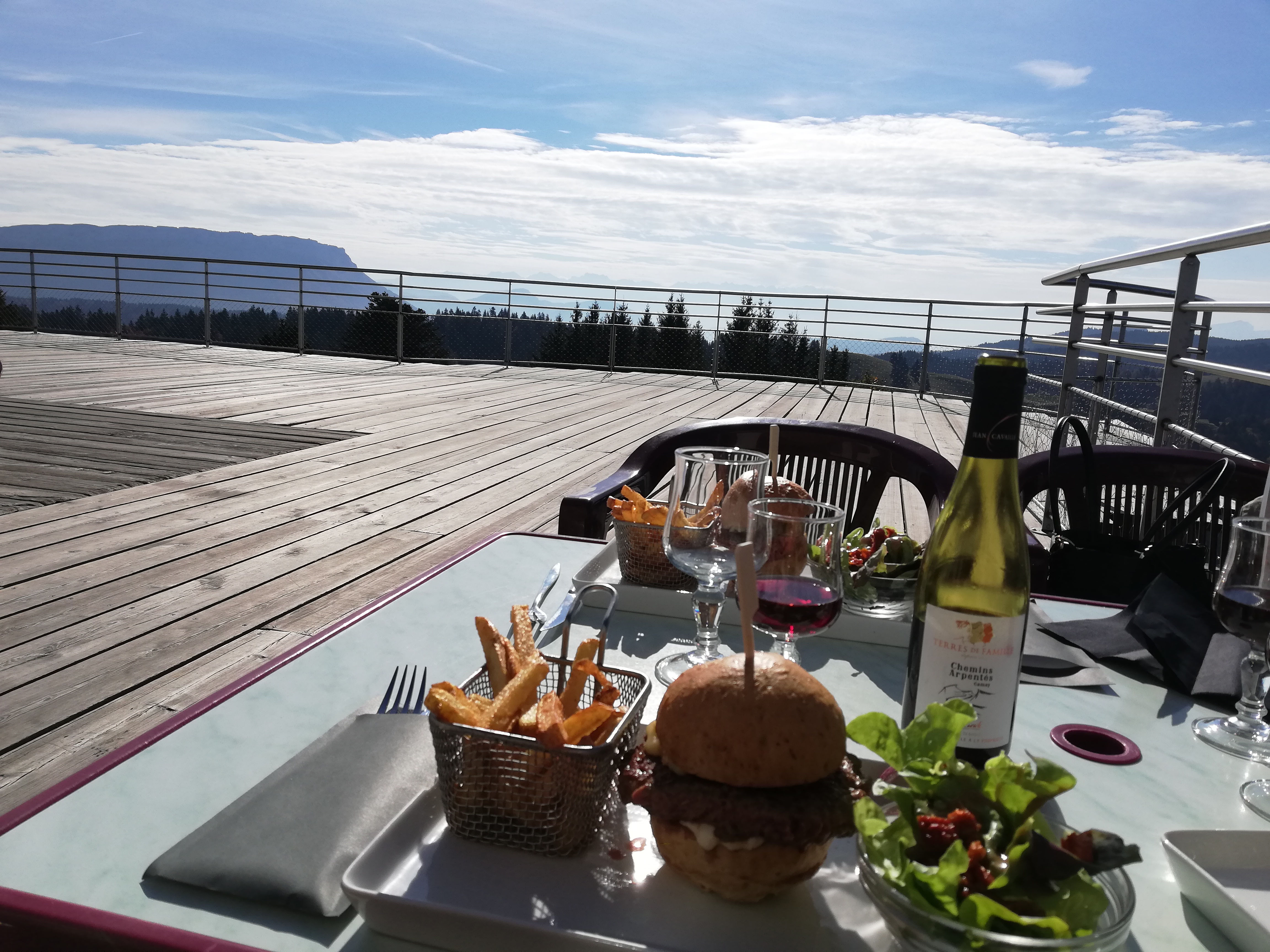 Ce restaurant est sur le côté du belvédère du Revard. Depuis sa terrasse et dans la salle on peut prendre son repas tout en regardant la vue superbe sur Aix-les-Bains et le lac du Bourget. Ma femme et moi avons mangé un burger savoyard (avec frites + salade), il est fait maison, copieux et très bon ! En dessert la crème brûlée au génépi m'a bien plu aussi. Prix correct. Nota : arrivés vers 12h nous avons été servi rapidement par une jeune femme souriante et efficace. Par contre vers 13h, j'ai entendu qu'aux nouveaux clients on annonçait 30 minutes d'attente, ce qui n'a pas plu à certains qui sont partis, pourtant seulement la moitié des tables étaient occupées...