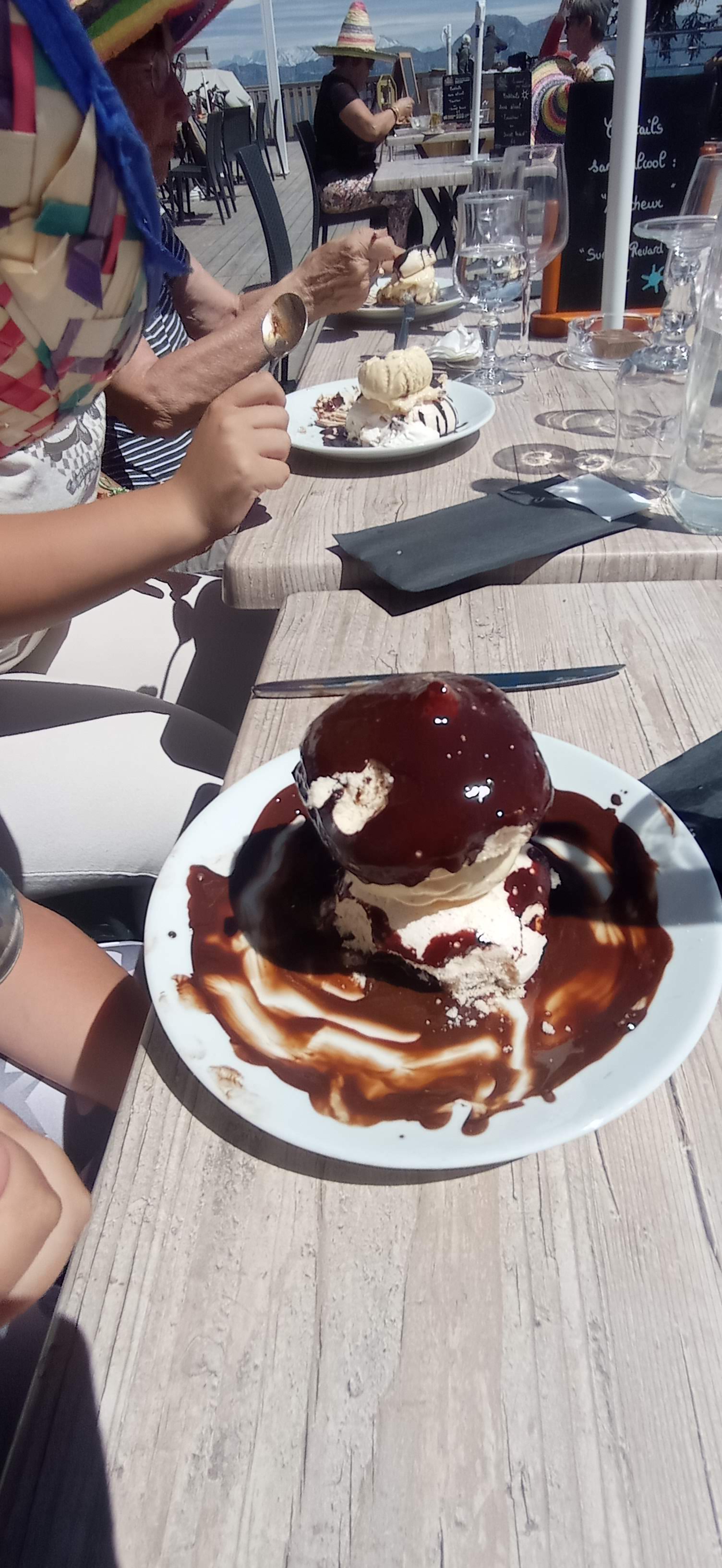 Déjeuner dominical en terrasse, au soleil, avec une magnifique vue sur les montagnes. Le service est agréable et les plats généreux. En revanche, carton rouge pour la gaufre ! Industrielle et décongelée au toaster (ou plutôt cramée) ressemblait plus à une biscotte noyée dans du Nutella. Dommage.
