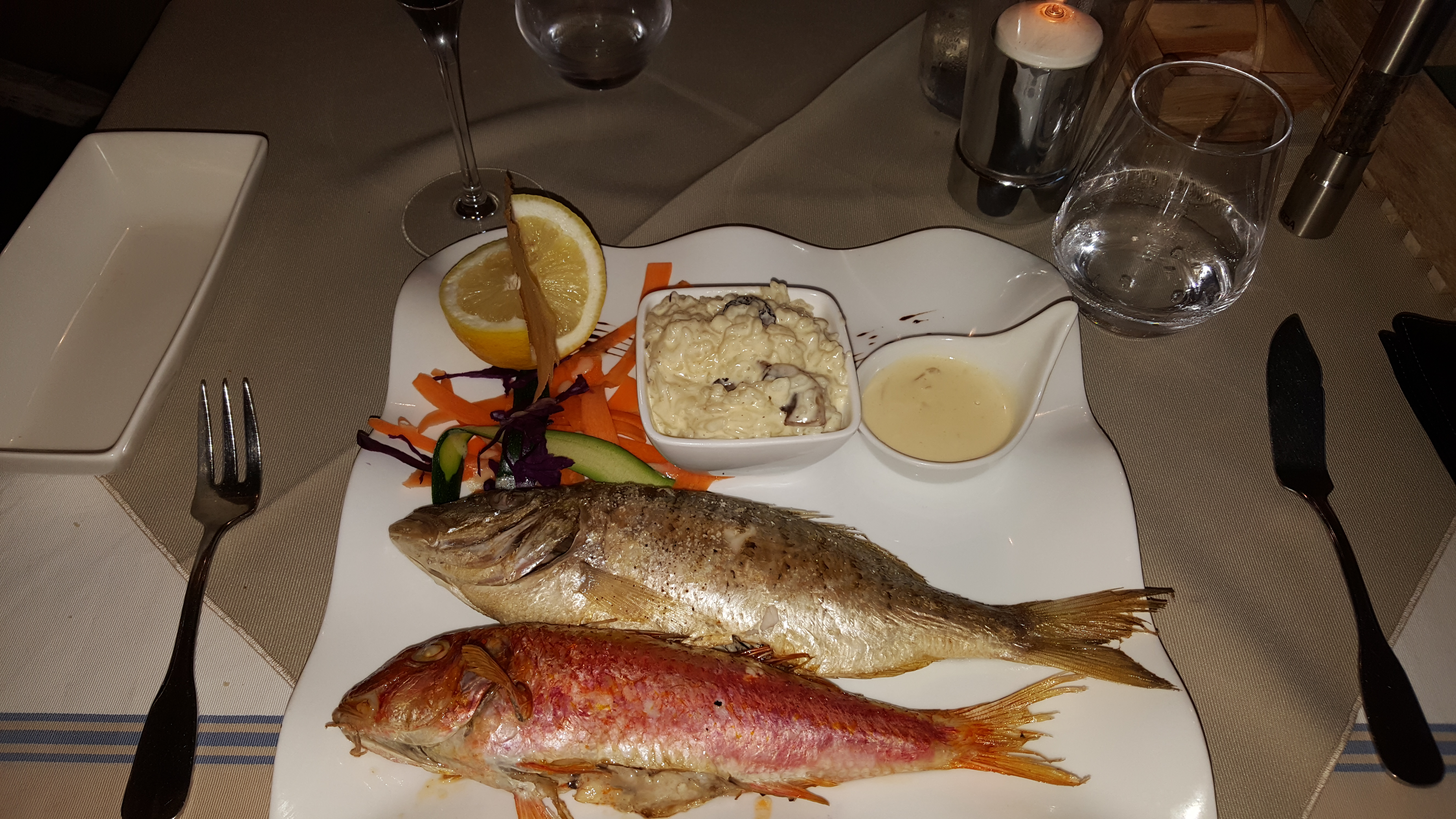 Très très bon resto au menu pour nous salade de poulpes , avocat avec crabe en entrée, sole meunière avec risotto aux champignons et gambas et risotto (énormes les gambas). Un petit rosé du pays conseiller par le personnel qui est très sympathiques , le prix est raisonnable en rapport a la qualité des produits, si vous voulez vous régaler en avant et bon appétit.