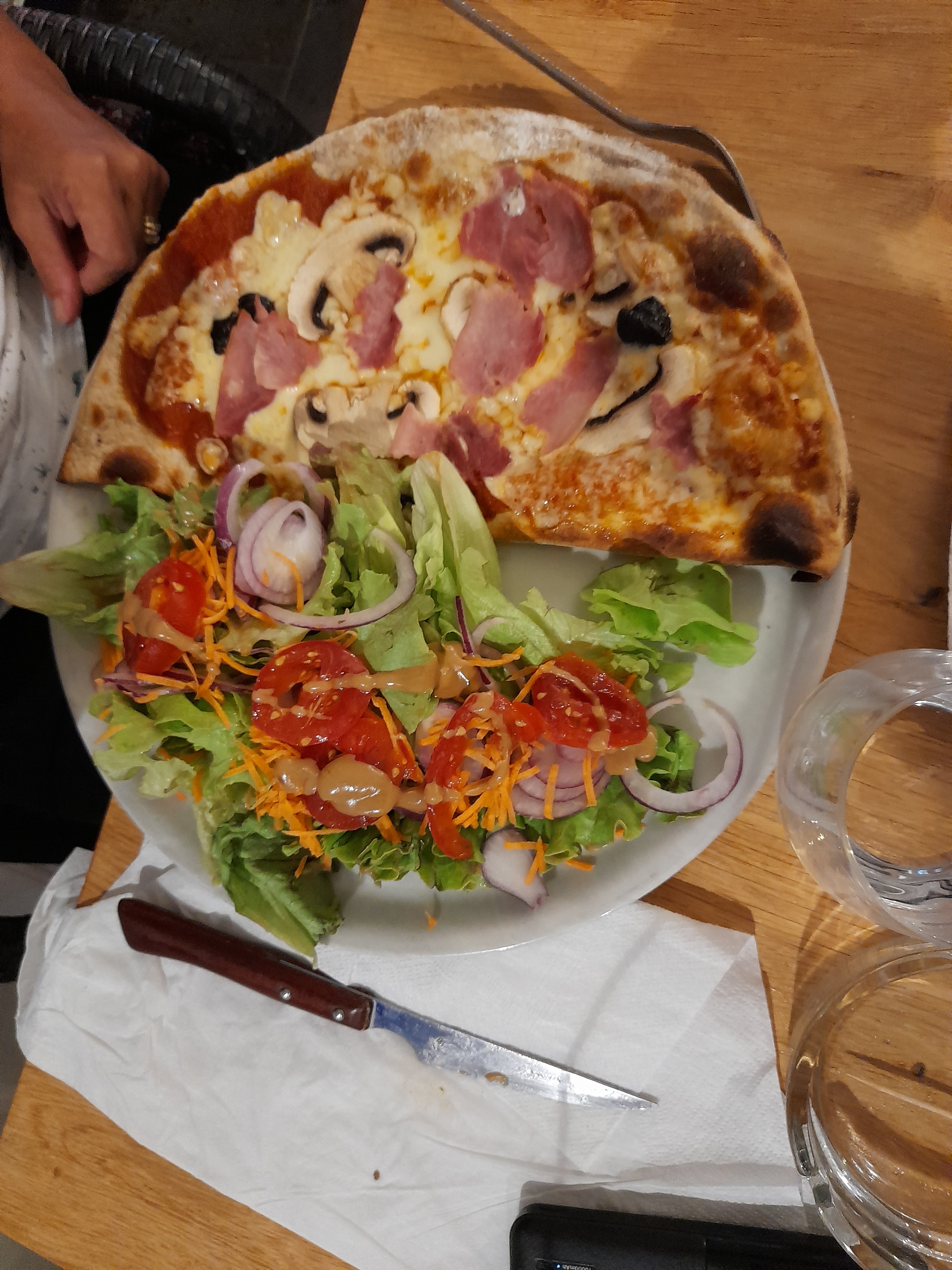 Le restaurant est bien placé au bout du mail, grande carte de cocktail, y a pizzas viande burger moules, crêpes gaufres, ils vendent des glaces également et y a toujours du monde, nous sommes arrivés à 19h40, nous n'avions pas réservé, le restaurant dispose de plusieurs terrasses, en attendant nous avons pris l'apéritif sur une banquette, c est sympa, j'ai pris un cocktail très bon, on a eu plusieurs serveurs pour commander l'apéritif🤪, ensuite notre table à été dressée 30 mn après, la commande a été rapide, le serveur réactif, rapide et sympathique avec de l'expérience, la pizza était bonne cuite au feu de bois👍 22h15 nous avions fini, nous étions ravis, au plaisir😁
