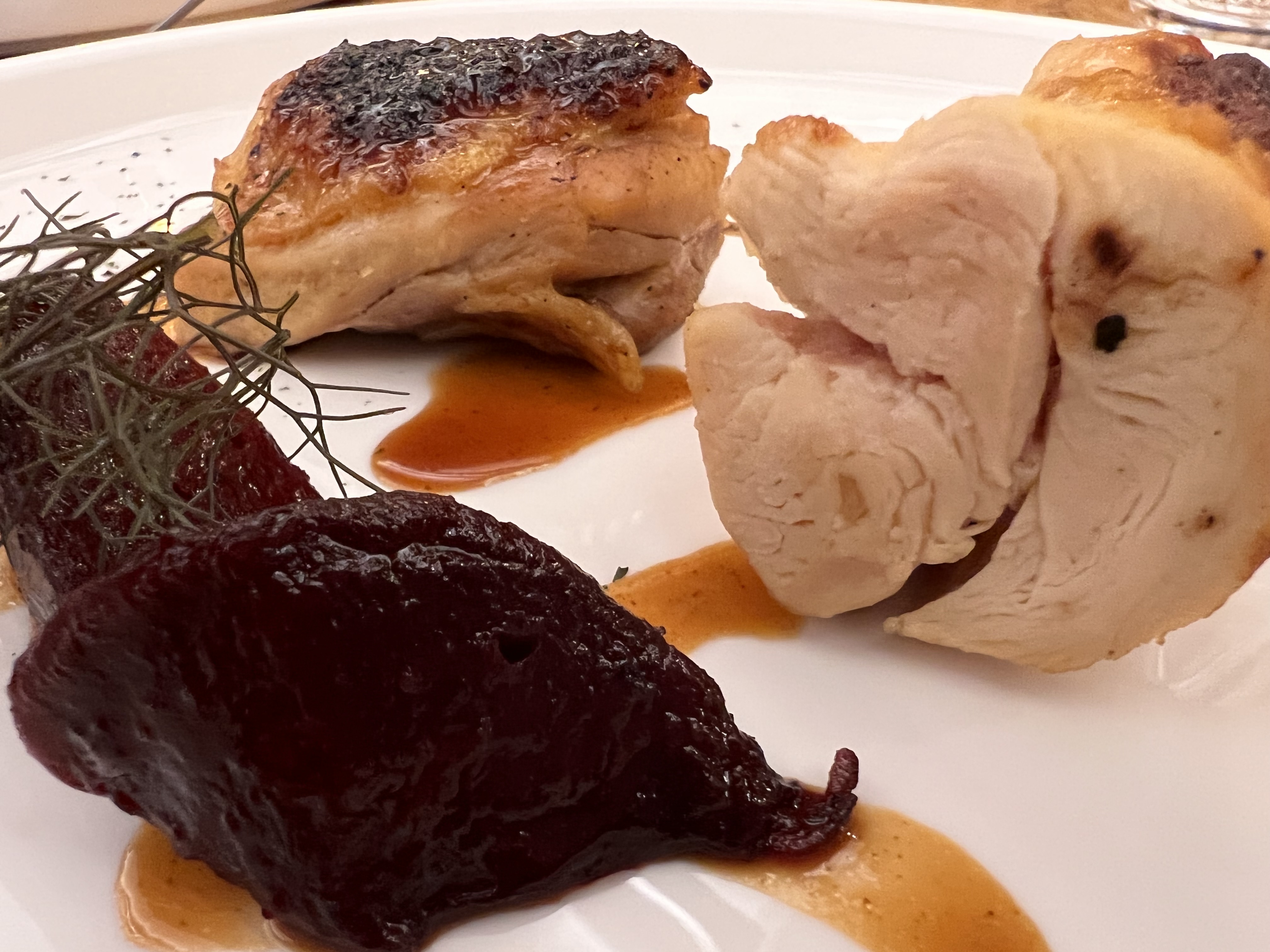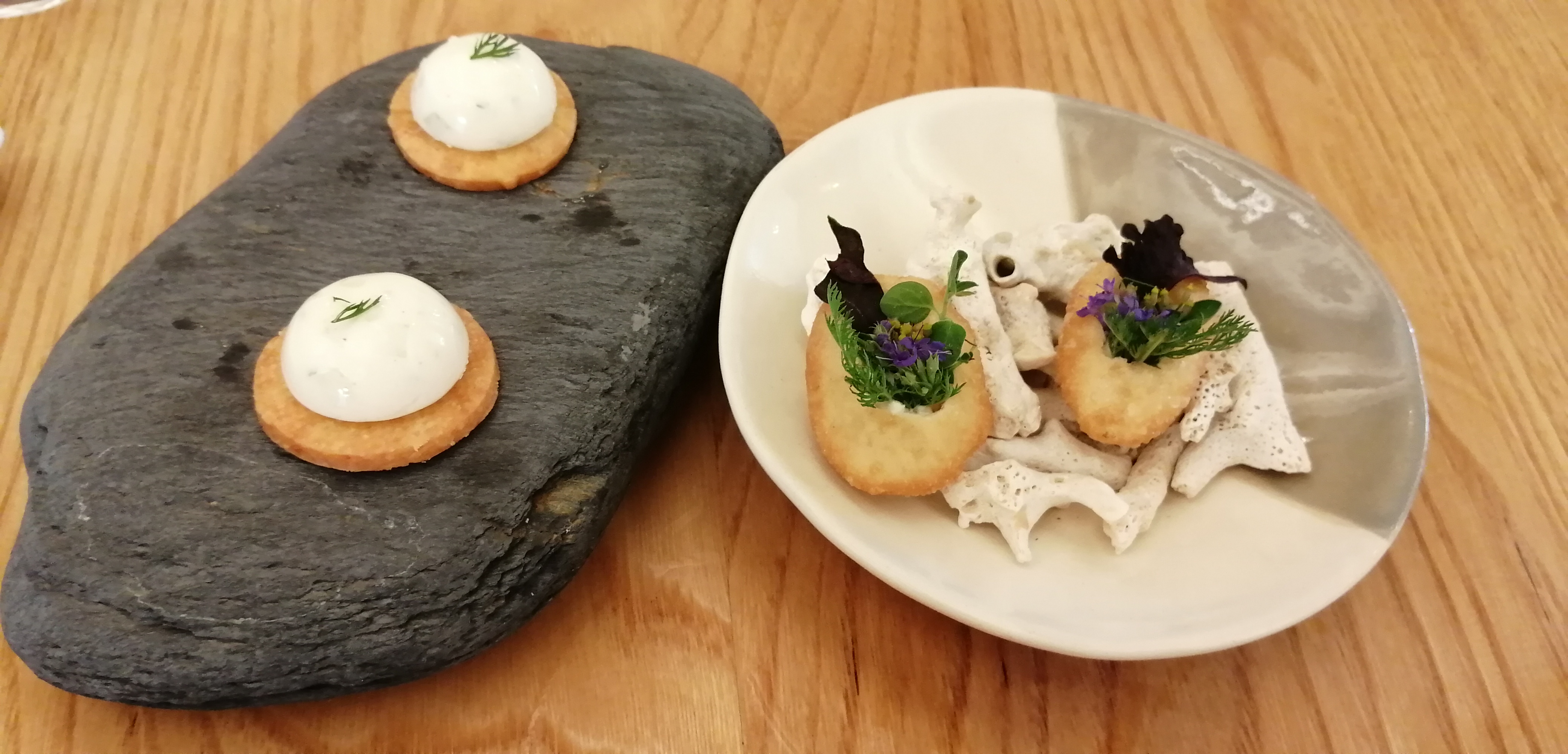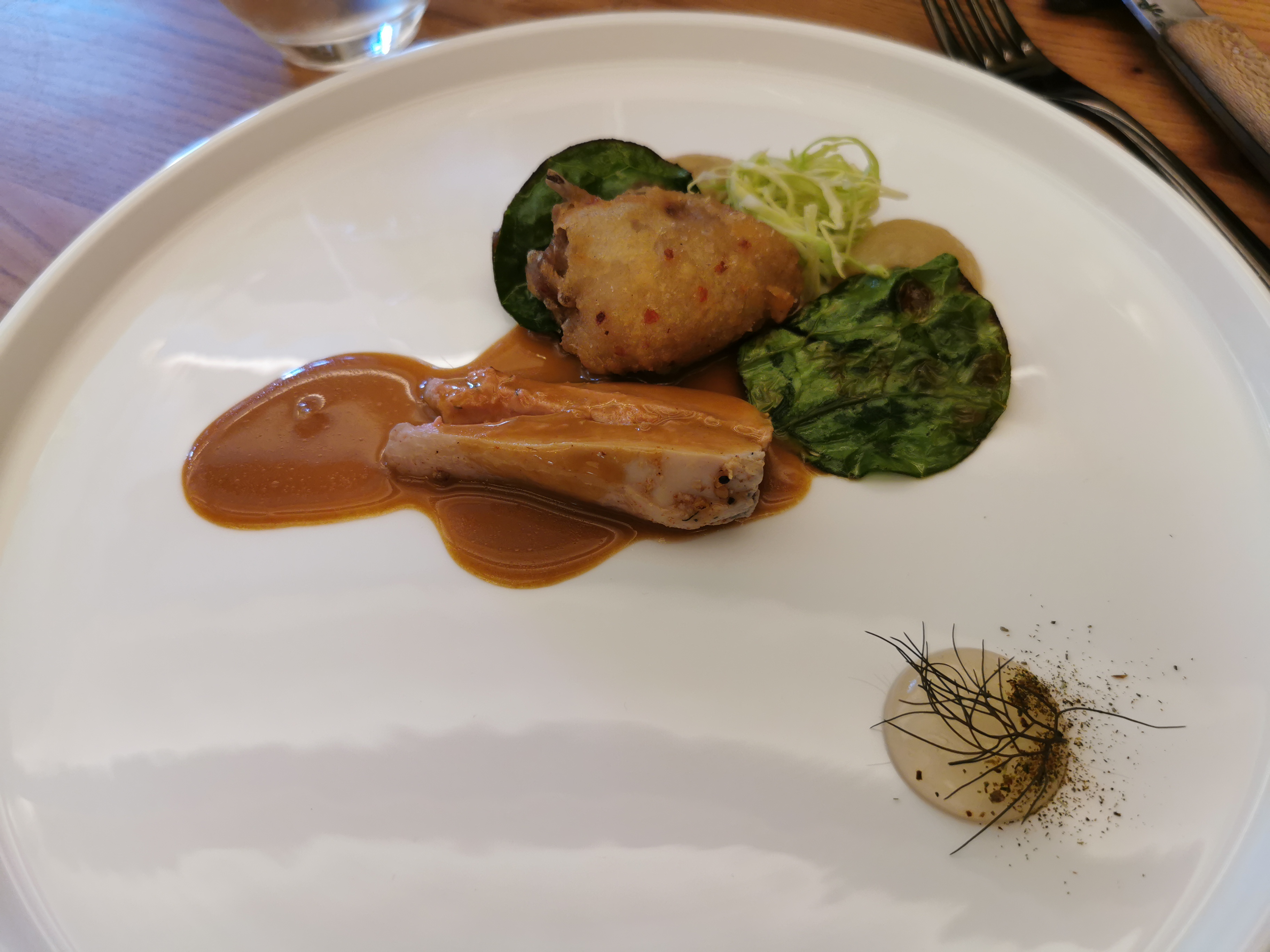 Nous avons commandé le menu avec 5 assiettes. C’est bon et raffiné, bien travaillé et avec des produits locaux. Les assiettes sont belles mais plutôt vides. Je dois avouer que je n’étais pas repu à la fin du repas, malgré l’assiette de fromage en supplément. En revanche c’était un bon moment, le chef est accessible, le service est (un peu trop) proche.