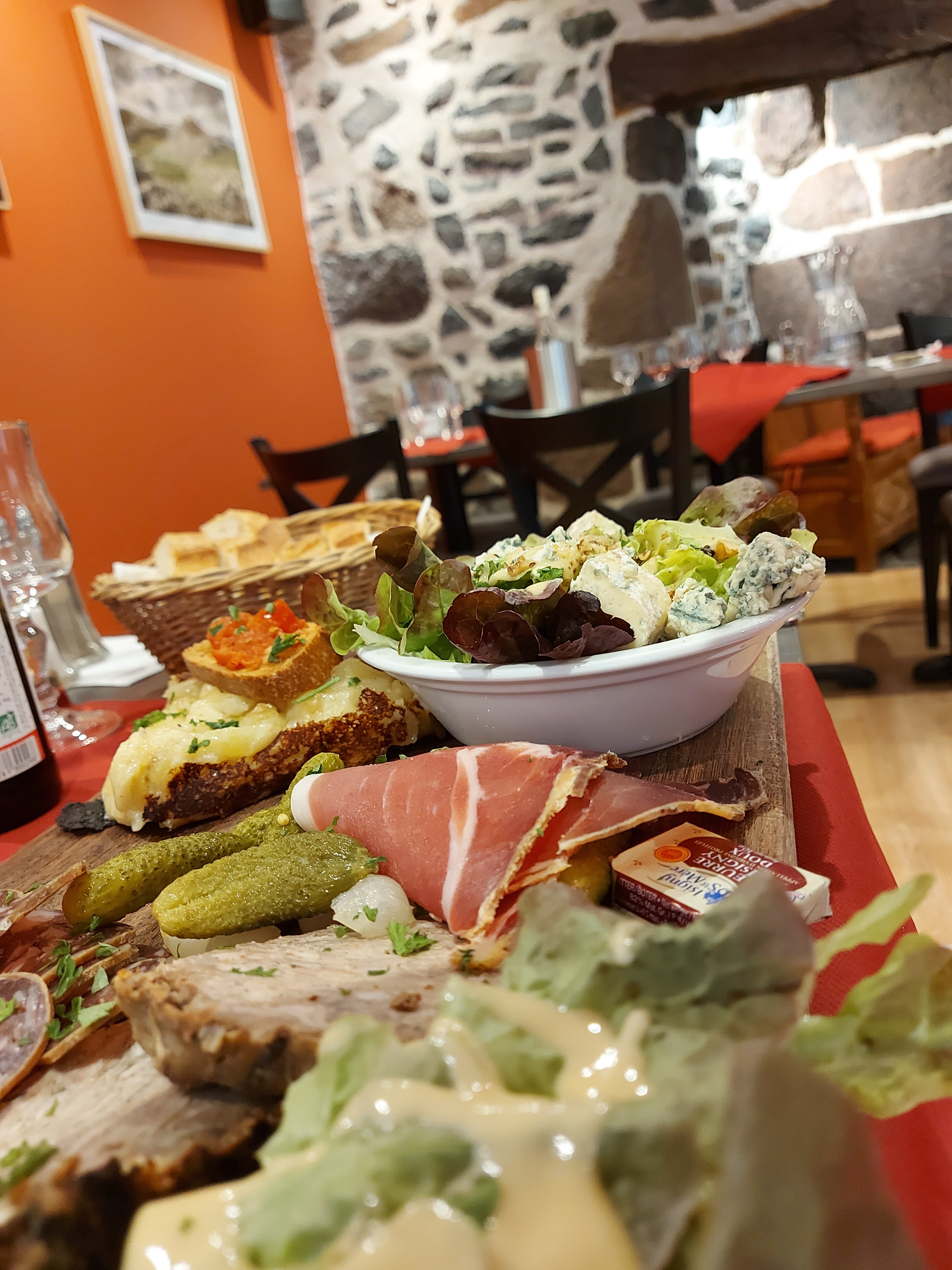 Nous avons testé la planche du berger et sincèrement nous n'avons pas été déçus...bien et joliment servi, nous avons pu déguster du jambon local, du saucisson, des terrines maison de la truffade (typique du Cantal) et une salade au bleu d'Auvergne et aux noix. Vraiment délicieux et copieux. Et pour couronner le tout l'accueil était au top. Encore merci.