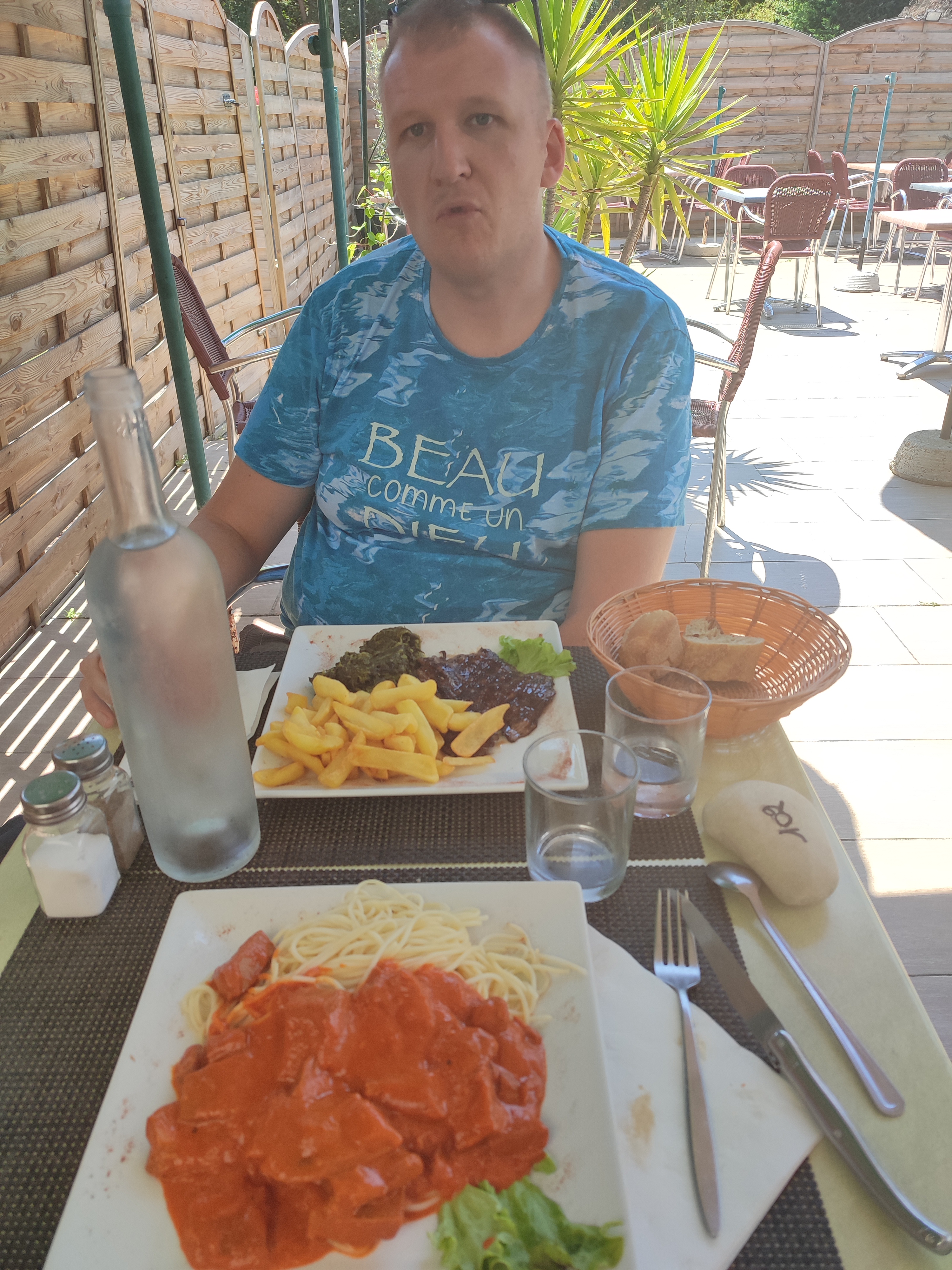 Au hasard nous avons trouvé un restaurant bien sympa avec la patronne qui gère ça en main de maitre et qui a toujours le mot qui va bien . Très bonne pioche.