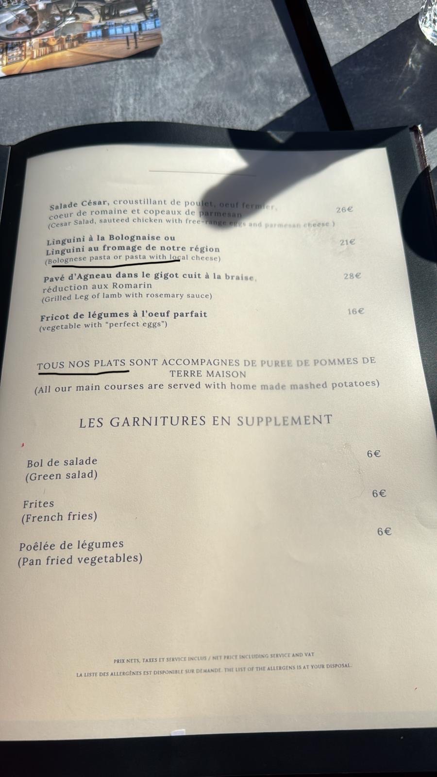 J'ai récemment déjeuner dans votre établissement et j'ai été déçu par une erreur dans la description du menu. J'ai commandé les linguines bolognaises en m'attendant à ce qu'elles soient accompagnées de purée de pommes de terre, comme indiqué sur le menu en français : tous nos plats sont accompagnés de patate de purée. Cependant, à ma grande surprise, les patates de purée n'étaient pas incluses avec ce plat, malgré ce qui était clairement indiqué sur le menu. En informant la serveuse de cette erreur, elle a tenté de justifier la situation en expliquant que les pâtes en France ne sont généralement pas servies avec de la purée de pommes de terre. Cependant, cela contredit directement ce qui est écrit sur votre menu. Je trouve cette incohérence très décevante et trompeuse pour les clients. Je vous prie donc de corriger cette erreur sur votre menu afin d'éviter toute confusion future et de garantir une expérience client plus cohérente.
