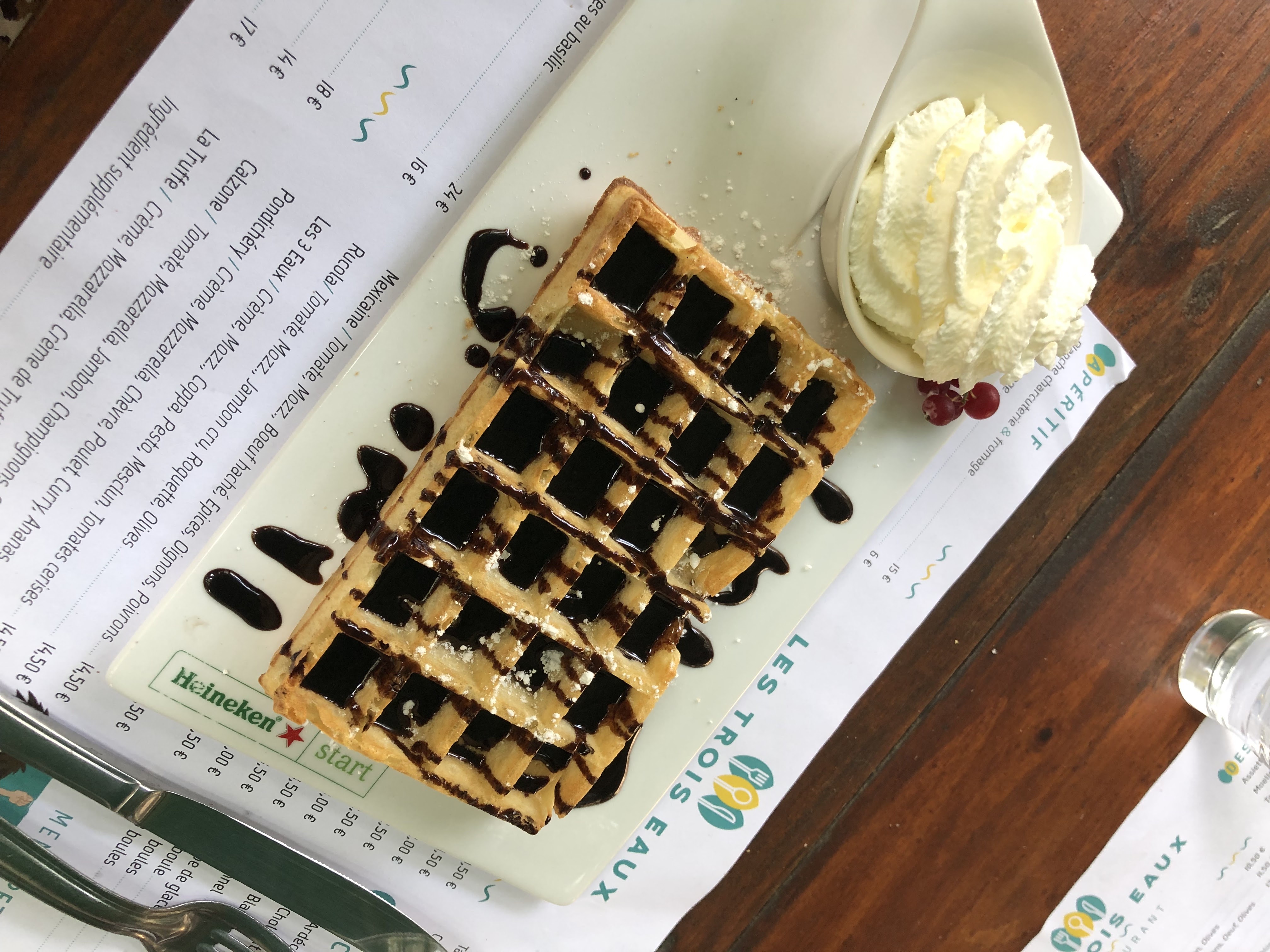 Nous avons décidé de manger au restaurant pour notre dernier soir, la serveuse avais l’air un peu perdue dans notre commande, nous avons commandé des moules frite, réception sans lingette de nettoie main ainsi qu’une cuillère à soupe… au moment du désert, nous avons commandé une gaufre caramels arriver au chocolat, renvoyez en cuisine, attente de 15min pour le retour, résultat la gaufre était sèche, et presque pas cuite, vraiment déçus de ce restaurants