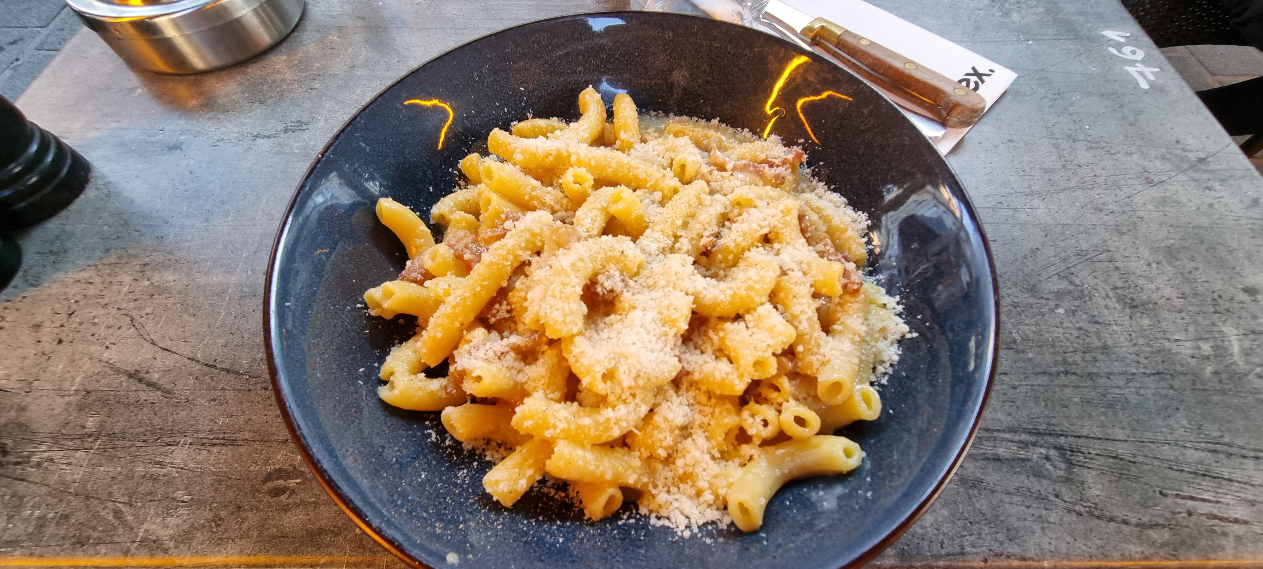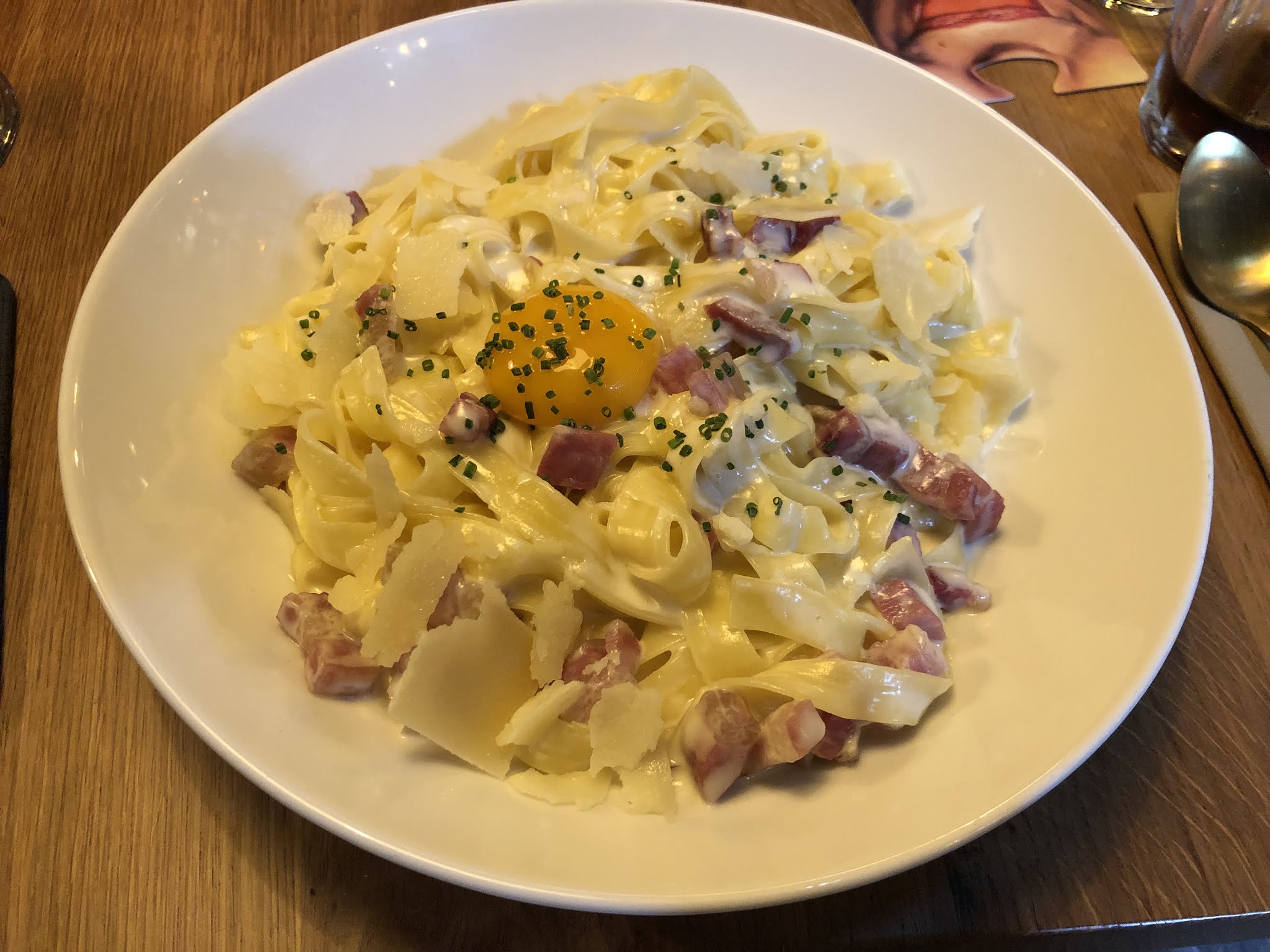 la carbonara était très bonne, la papillote de saumon n'avait pas beaucoup de saveur. à l'intérieur l'ambiance est vraiment bonne