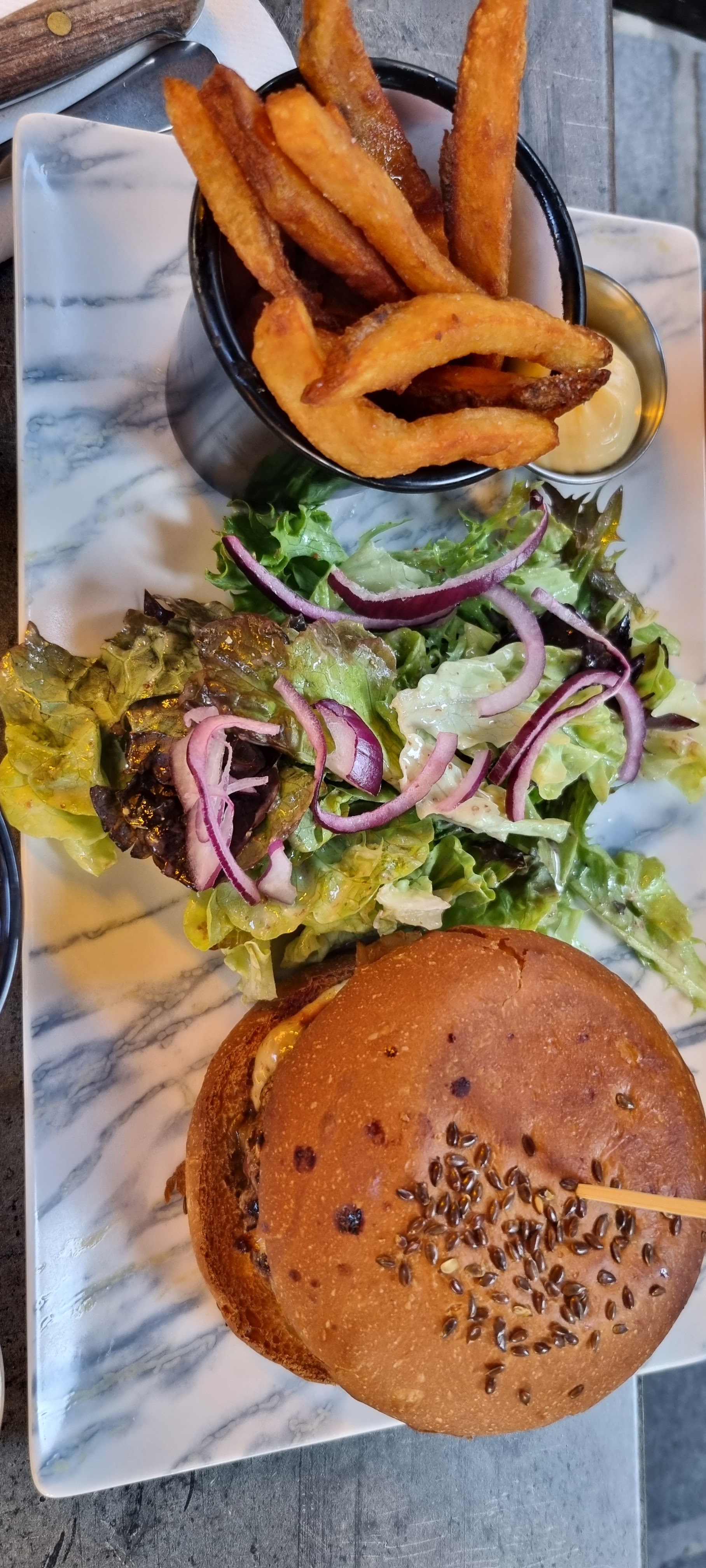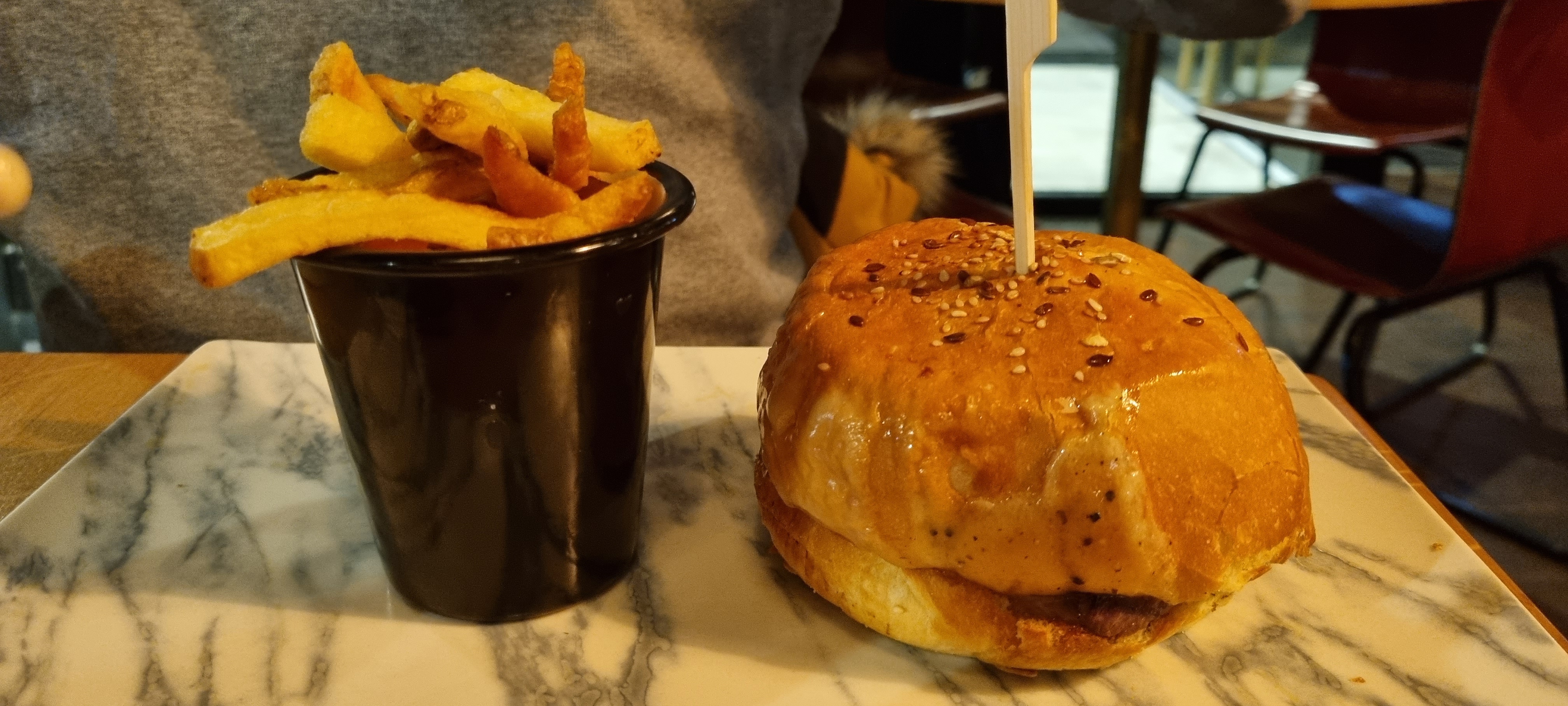 J ai adoré l endroit ,le style ,le calme ,cette ambiance cosy . 1er bemol les toilettes au 1er etages. Les serveurs/ses sont top ,le sourire, agréable ,disponible ,une belle equipe a l image du responsable . Mais parcontre 2eme bémol, la carte pour moi n est pas assez variée ,je sais qu il en faut pas beaucoup mais la je m y retrouvais pas dans mes goûts. La quantité de frites était mince au vu du burger ,mon mari est resté sur sa faim.Parcontre mon buddha bowl lui etait garni et top ! Les profiteroles une tuerie et la aussi suffissant pour 2. Mais le resto mérite ses 5⭐️ ,car cela reste que mon avis personnel.