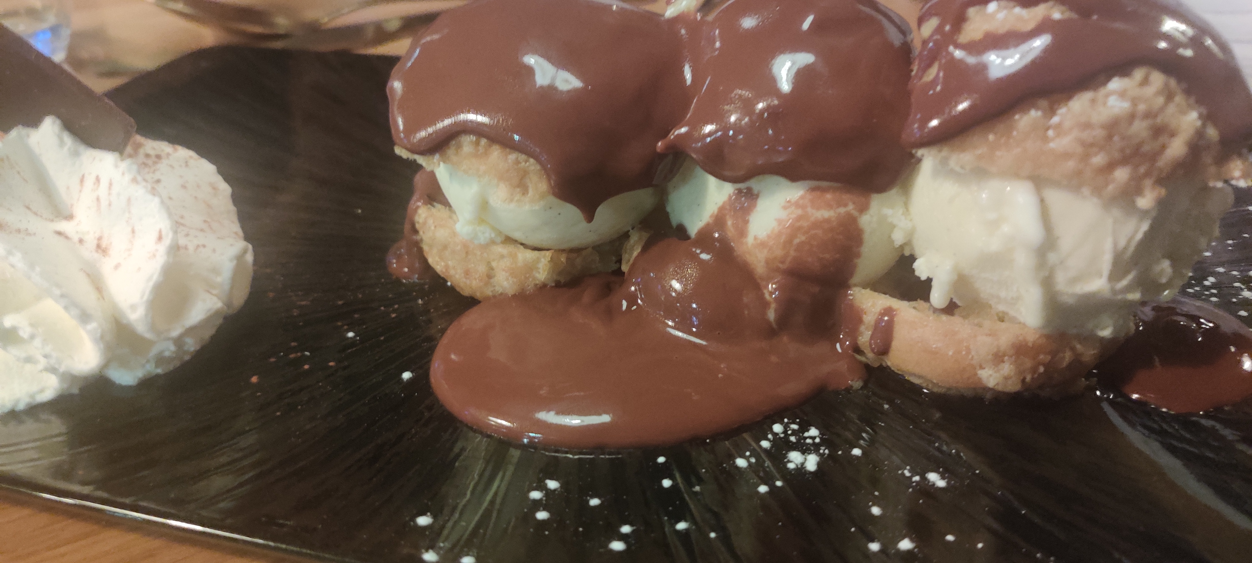 C'était de la bonne nourriture, et surtout les pâtes au jambon et aux champignons. Comme c'est délicieux ! Les profiteroles pour le dessert étaient une finition merveilleuse avec de la glace à la vanille, de la crème fouettée et une sauce au chocolat. Il semble y avoir de la place pour le dessert !