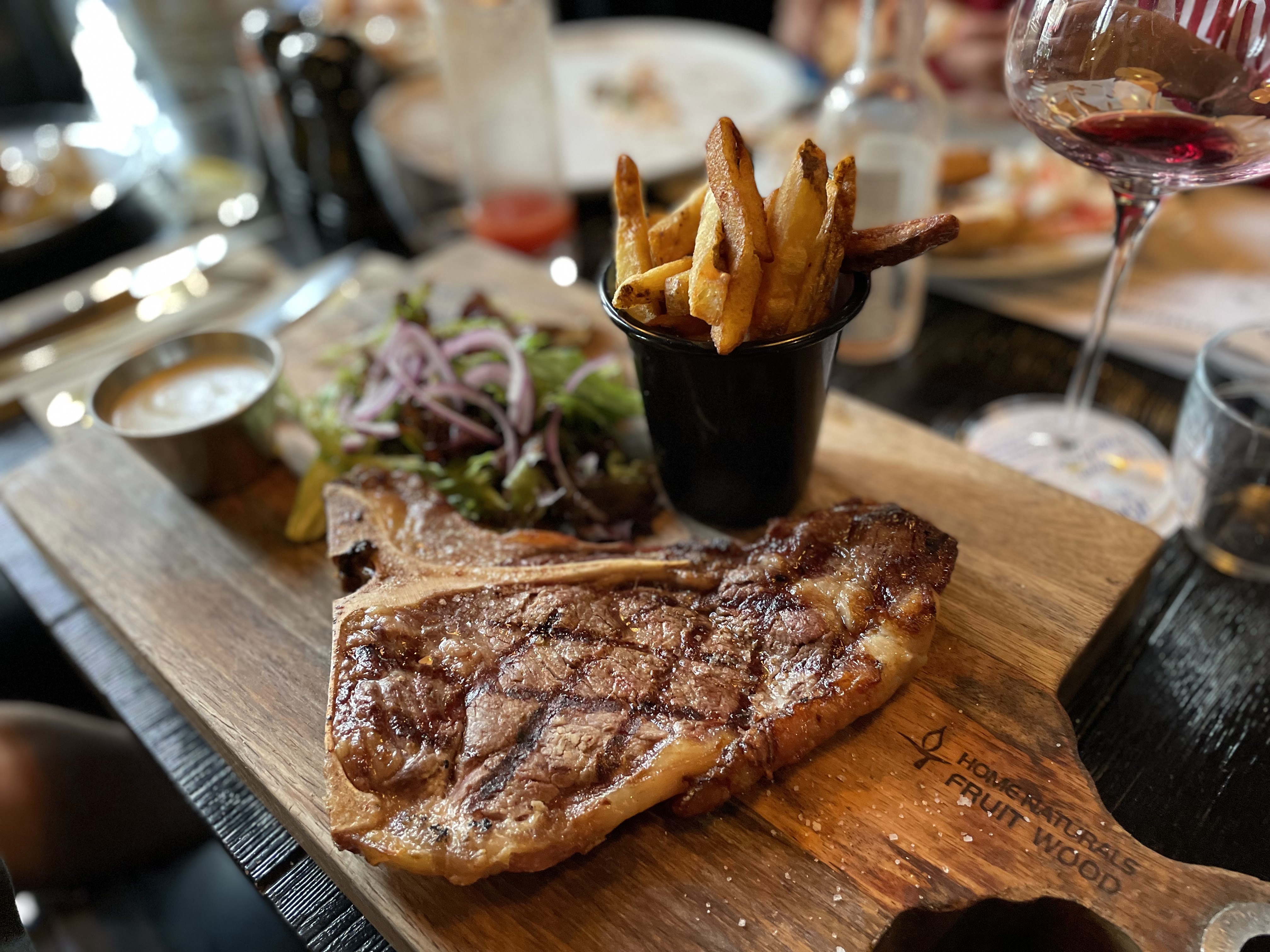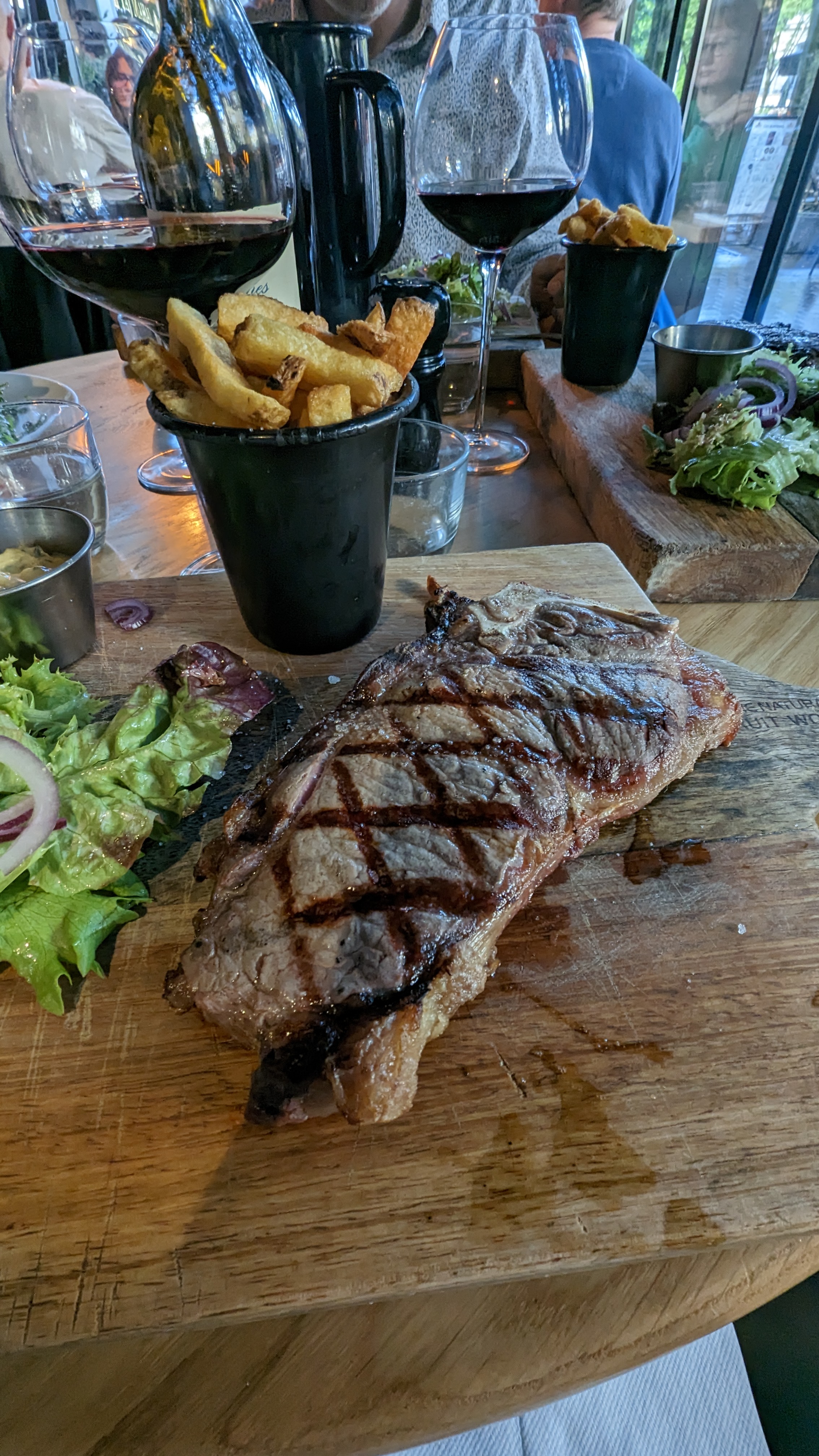 Un endroit absolument charmant pour passer une soirée. Il y avait un DJ et c'était un environnement animé mais familial. Un steak parfaitement cuit, d'excellents hamburgers, des pâtes faites maison et bien sûr une fabuleuse carte des vins (y compris une page complète de champagnes). Le service à l'extérieur sur la terrasse était très sympathique et le personnel était compétent bien qu'un peu lent, mais lorsque nous avons emménagé à l'intérieur, la vitesse s'est accélérée et nous avons eu une excellente expérience.