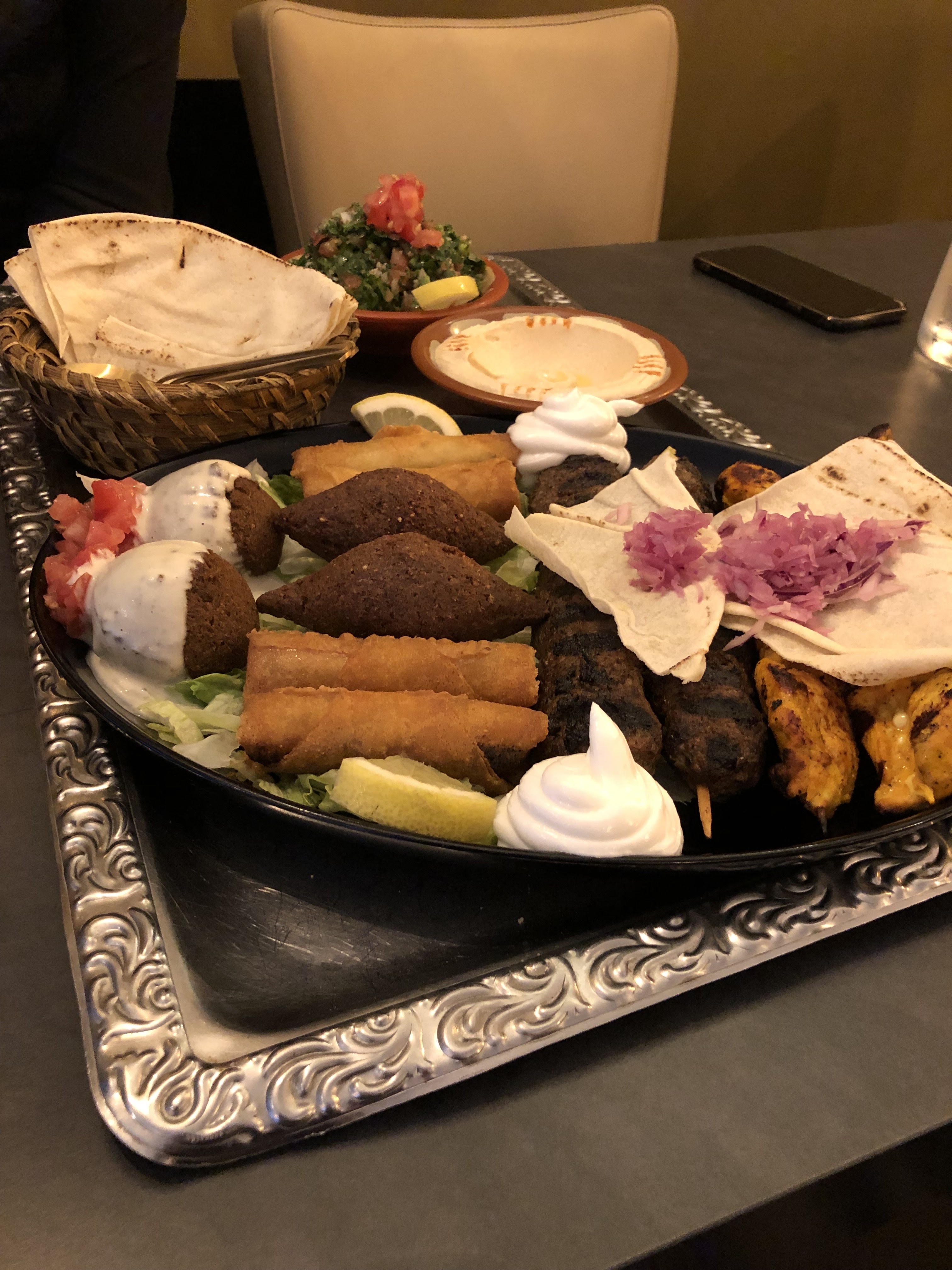 Mon premier Libanais ! Je ne l'oublierai jamais... un houmos incroyable, des boulettes de viande divines, des falafels gouteux, des brochettes de poulet savoureuse, un taboulé frais et bouleversant. Avec un plus, un personnel en or!Tout ceci dans un décor magnifique et chaleureux. J'y retournerai aussi souvent que possible.