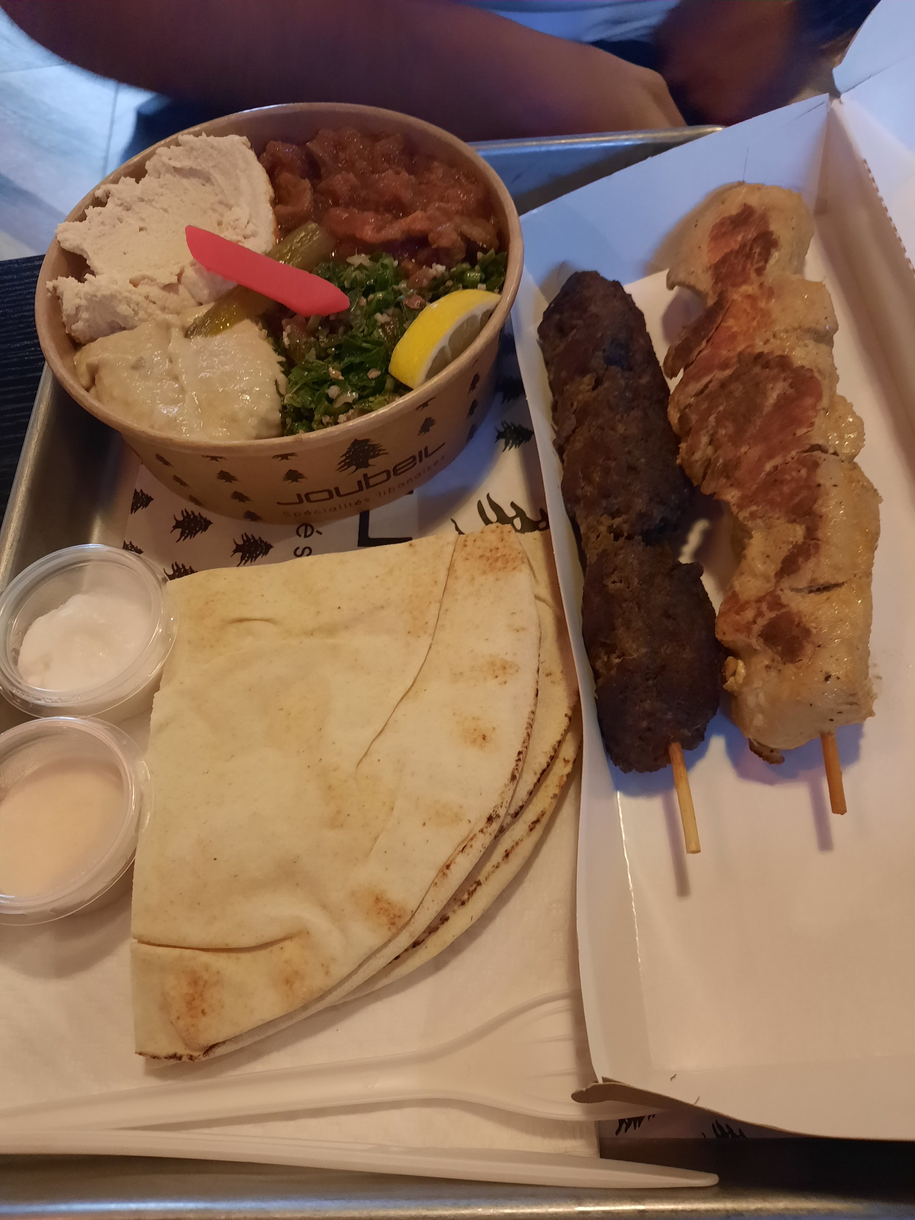 Les bons restaurants libanais ne sont pas légion à Rouen et le Joubeil en fait partie. Les prix sont un peu élevés, mais c'est souvent le cas dans les restaurants libanais. Les plats de mezze sont très corrects et relativement copieux. Seul petit bémol, mais c'était peut-être exceptionnel, nous avons attendu assez longtemps avant que l'on prenne notre commande. La déco est sympa, peut-être qu'elle ne plaît pas à tout le monde mais je l'ai trouvée originale