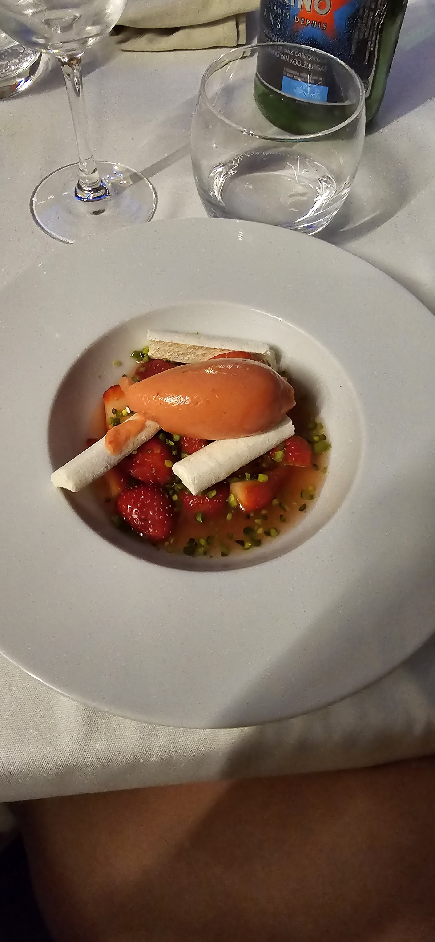 Très bon restaurant rien à dire ! La cuisson, l'assaisonnement, la quantité et la qualité des produits sont excellent ! Ils servent comme amuse bouche une crème de courgette divine ! On s'est tous régaler 😋(photo 1). Les autres photo sont : En entrée un genre de flan au suprême de St Jacques avec un sauce à la tomate et au basilic En plat c'est un filet d'agneau tellement tendre avec deux différentes purée, une à la pomme de terre et une à la carottes puis un gâteau d'aubergines. En dessert c'était un croquants au pralin avec une crème brûlé au chocolat blanc délicieux !