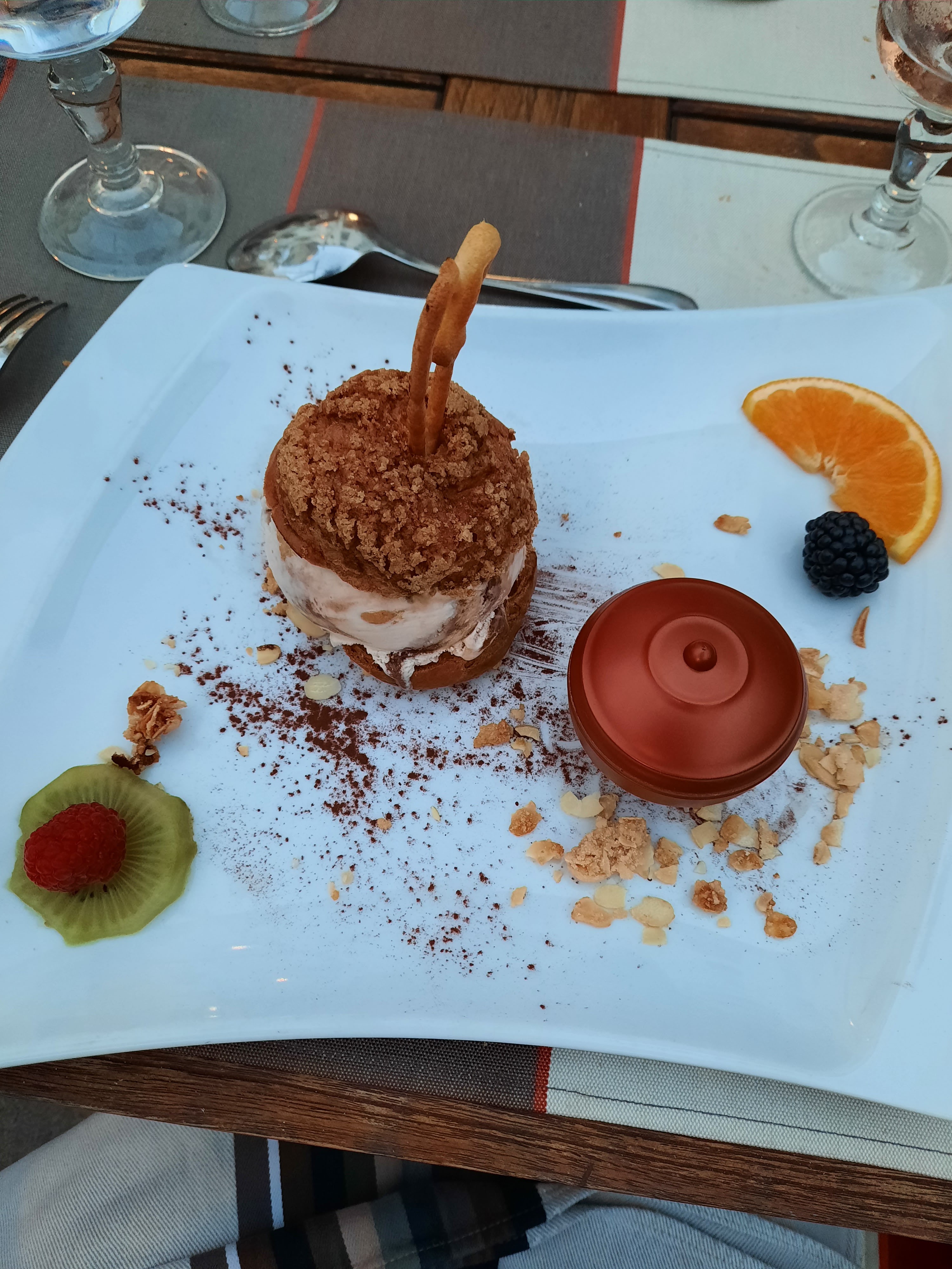 Dîner dans ce lieu calme et apaisant. Les tables ne sont pas collées les unes aux autres. Plat choisi saumon en croustade et glace artisanale. Les saveurs sont là avec un accompagnement varié et surprenant.