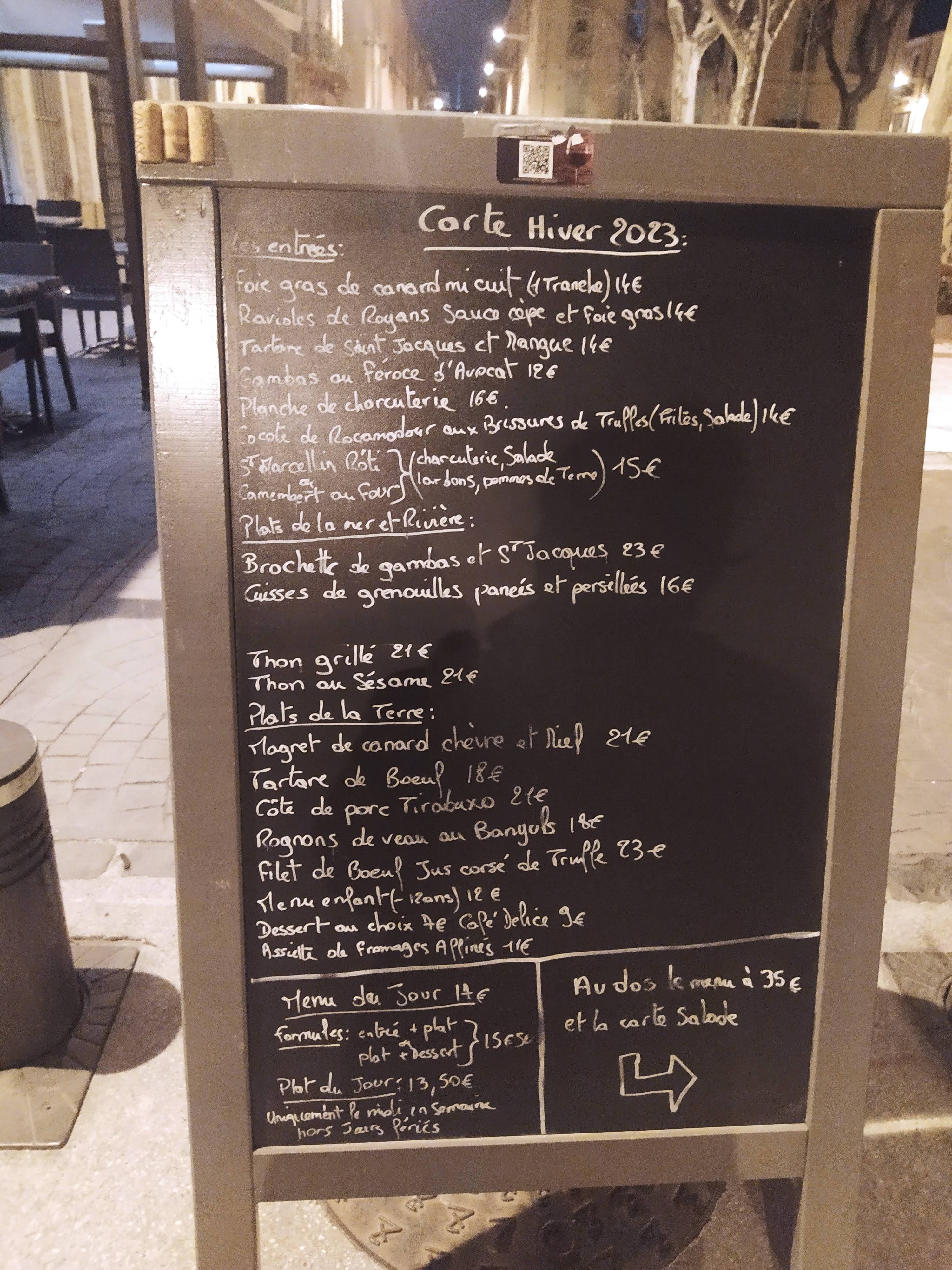 Nous avons pris deux menus 23€ et 35€ (de mémoire) excellent tous les deux. Bravo à La Chef...