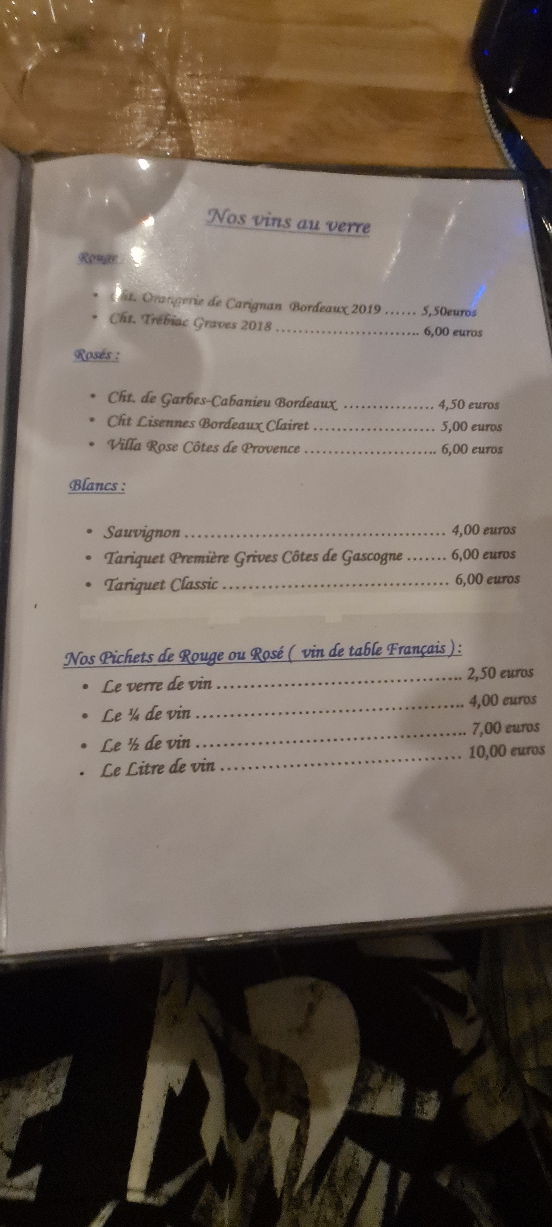 tout très moyen, frites grasses...dessert conserve..plus (chocolat servi froid!)5.5€ ballon de Bordeaux !!modeste...bref Vraiment pas top.... Pas du tout mon préféré dans le coin.