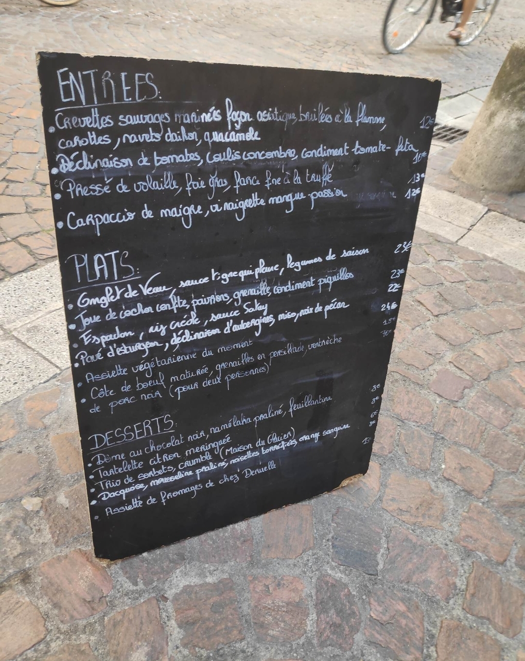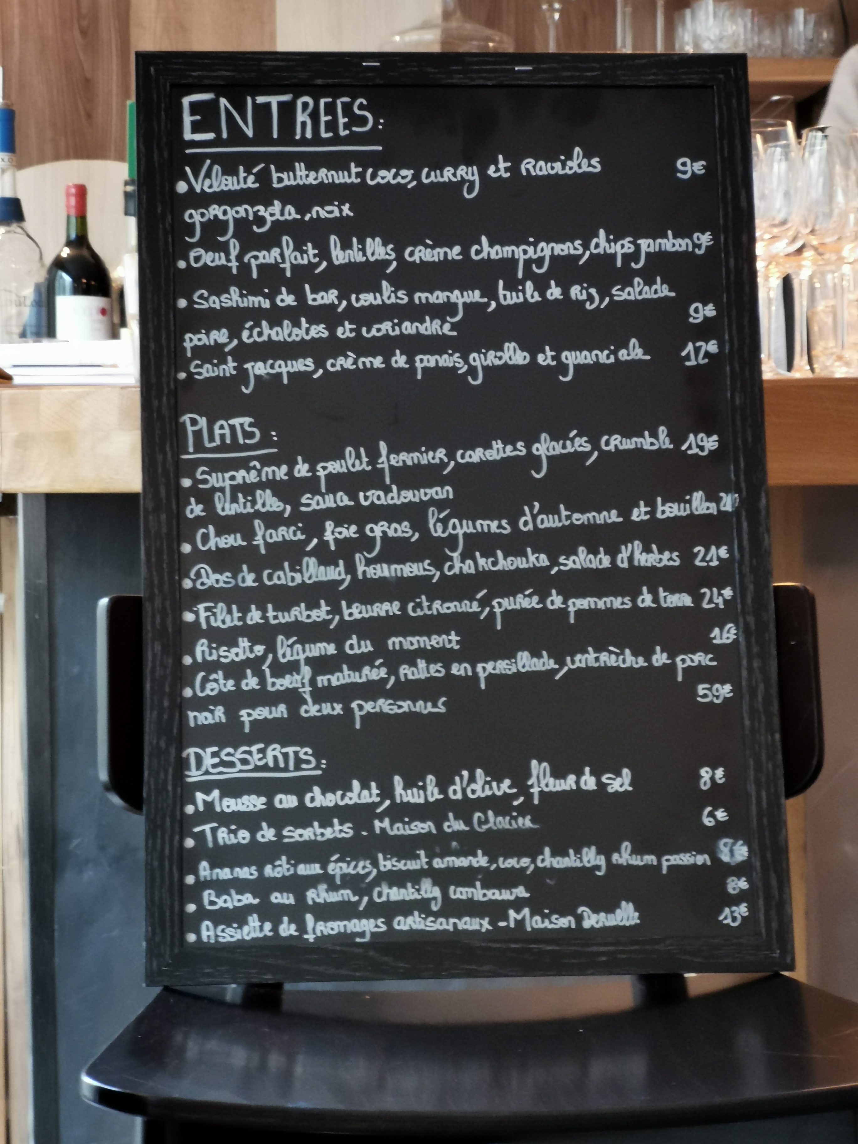Une bonne adresse parmi la multitude des restos de Bordeaux, carte du jour avec entrée entre 9 et 13€ et plats entre 18 et 24€, bon choix de vins à prix raisonnables, accueil et service charmant.