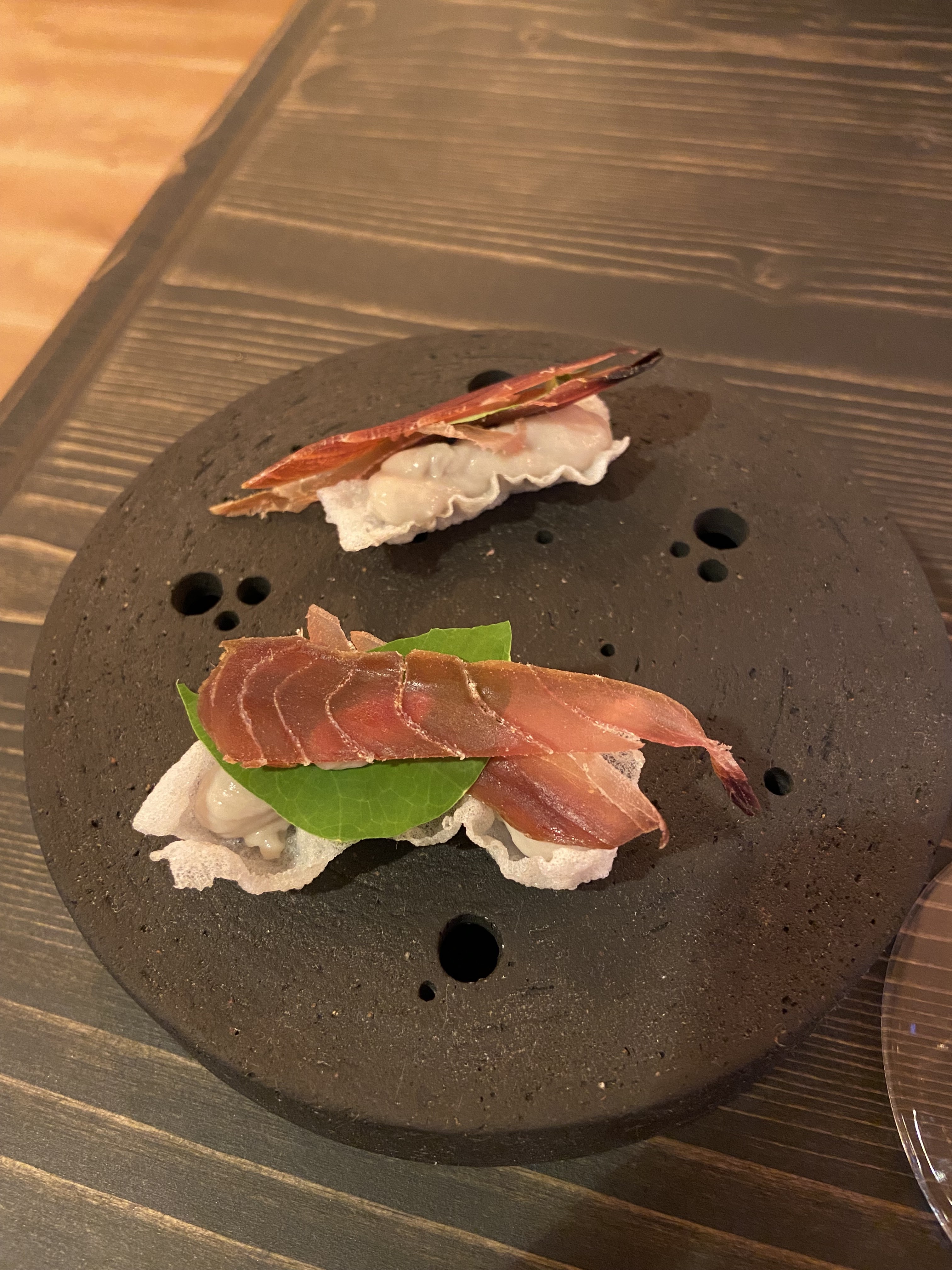 Je voulais y aller depuis l'ouverture, depuis que j’avais écouté l'excellent podcast que leur avait consacré France Bleu Pays Basque en août dernier. Alors Lurrak? C’est de la bombe ! Le lieu est inspiré avec sa décoration intimiste et minimaliste et beaucoup d’espace entre les tables qui permet à tous d’admirer la vaste cuisine ouverte. L’assiette diffuse des instants choisis, des alliances justes, des mariages précis, mais sans esbrouffe. Le service est focus, efficace et détendu. On commence avec d’esthétiques et savoureuses mises en bouche qui annoncent déjà le niveau… On poursuit avec des bois de salsifis qui rappellent que Romain et Paul se sont connus chez David Toutain et on enchaine avec une sériole travaillée en sashimi dans un bouillon, puis un cabillaud bien nacré et enfin le goûteux pigeonneau en deux manières. Une bonne sélection de fromages et des desserts tout en douceur concluent joliment ces agapes. Là-dessus on boit un accord mets et vins sélectionné par Paul qui joue astucieusement des ressources du terroir local. Bref, Lurrak est au-delà de la belle découverte, c’est à mon avis actuellement la meilleure offre gastronomique du pays basque français. Courrez-y !