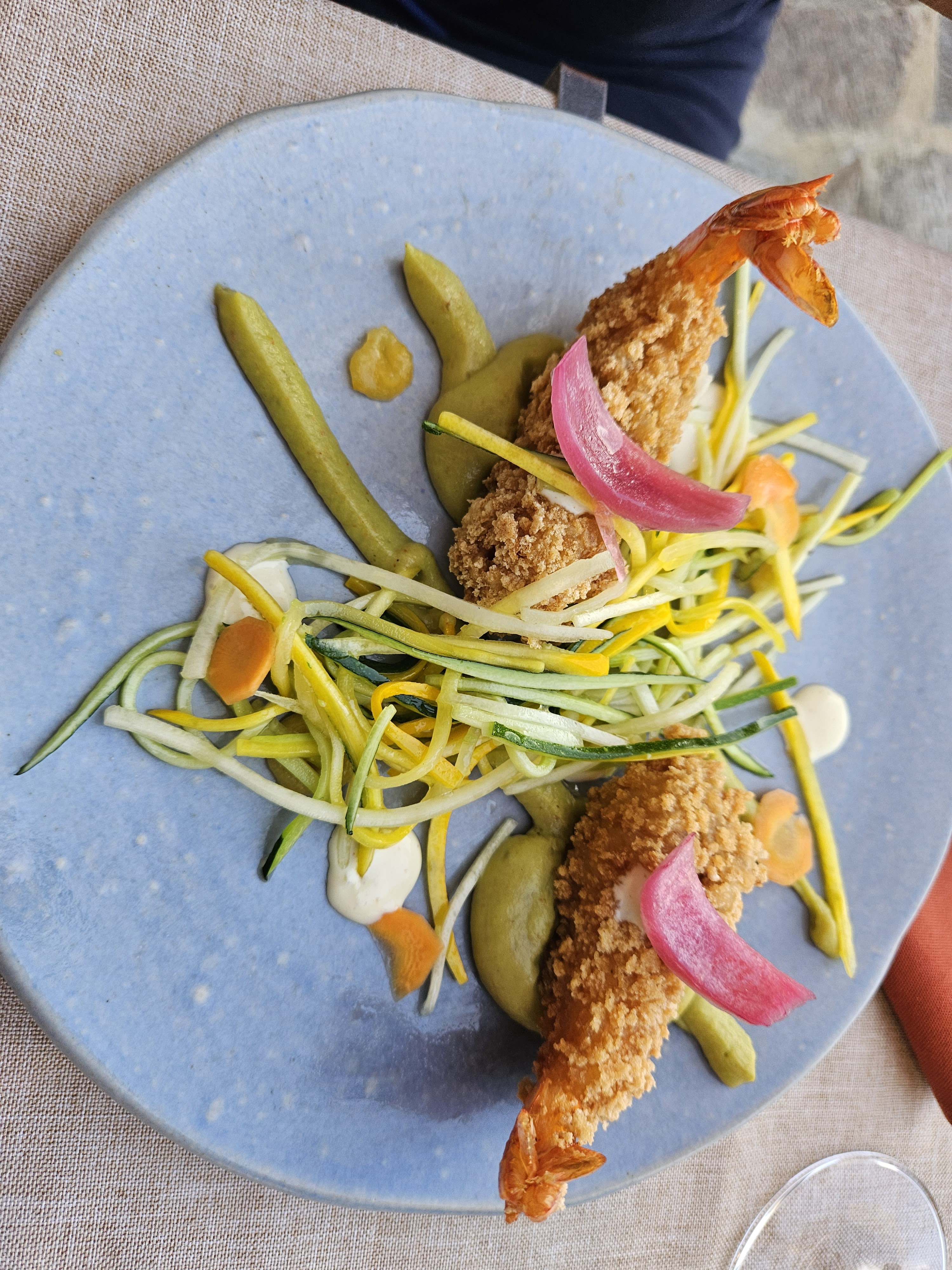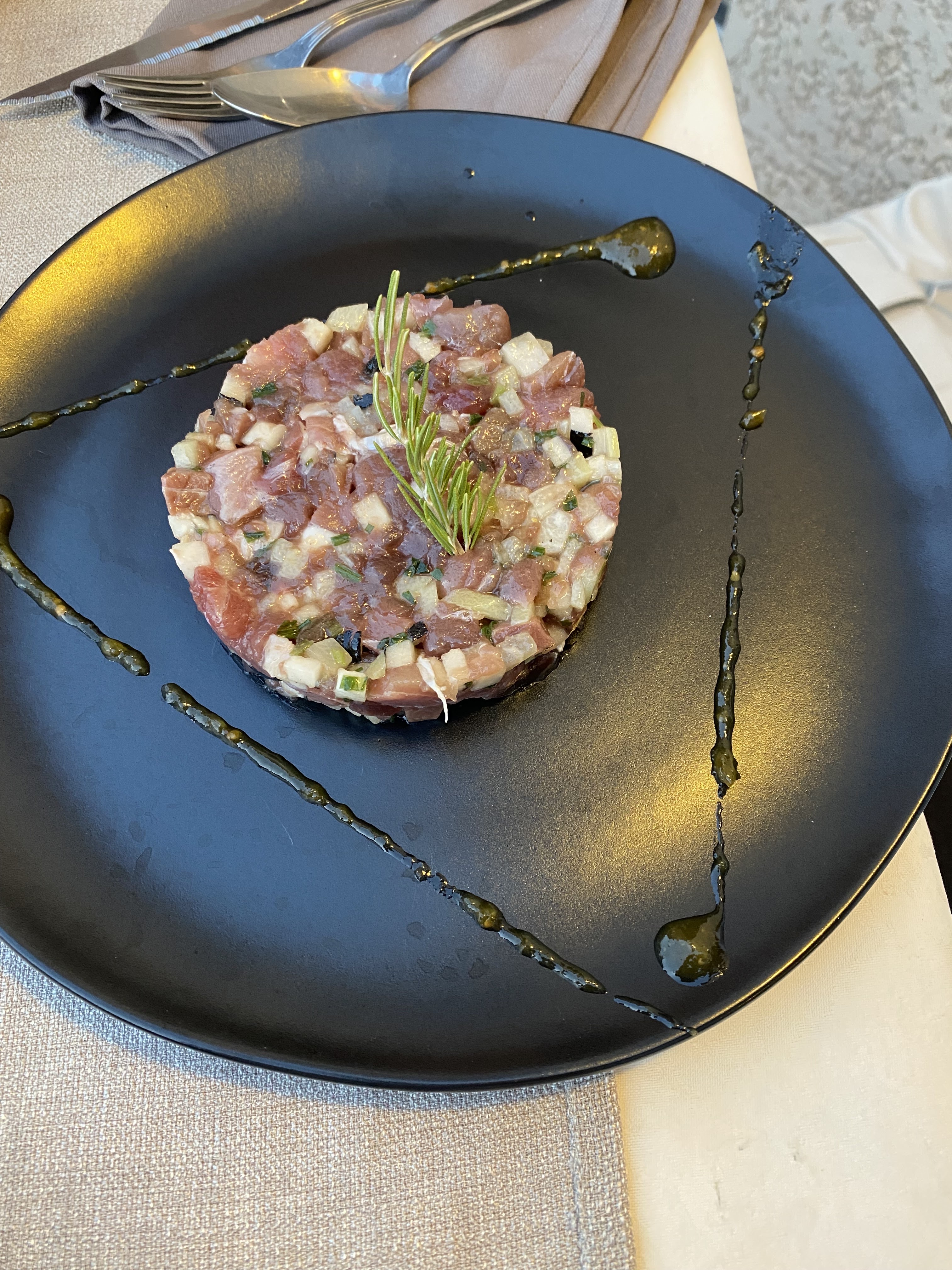 Le restaurant est merveilleusement situé au sommet de la colline et vous avez une vue fantastique sur la mer et les montagnes. Le menu propose trois alternatives pour l'entrée, le plat principal et le dessert. Le menu complet, que vous pouvez librement composer à la carte, coûte 42 €. C'est un prix très raisonnable pour la nourriture proposée ! Nous étions quatre, nous avons donc pu tout essayer sur le menu. Une réalisation de cuisine originale et habile. Des excursions dans le monde des saveurs asiatiques sont entreprises et la référence régionale est toujours conservée. Si vous souhaitez profiter d'une cuisine raffinée dans une belle ambiance, ce restaurant est fortement recommandé !