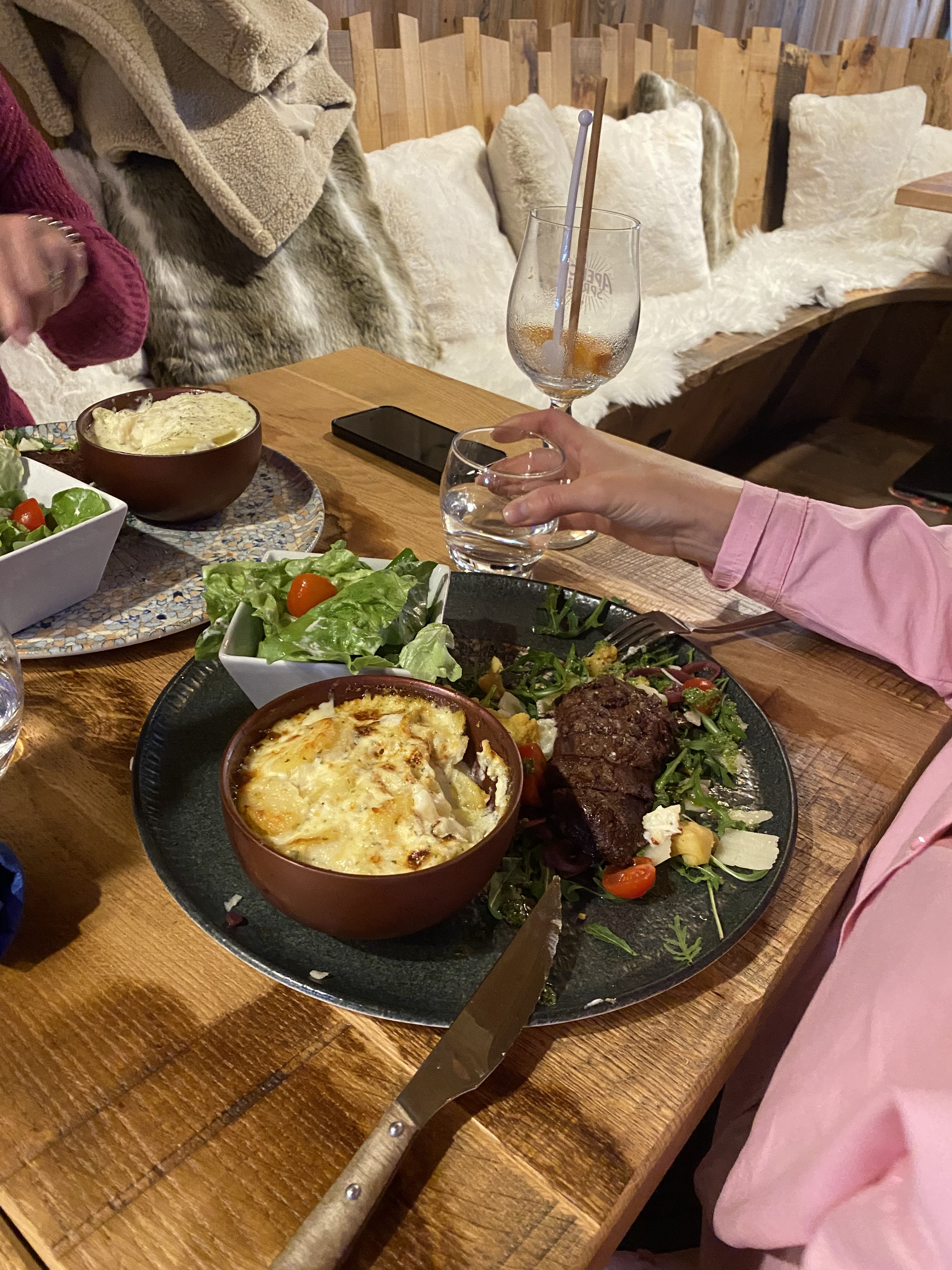 Restaurant à la décoration chaleureuse (plaids en fourrures, cabines de funiculaire, boiseries, etc.) Cuisine et ambiance montagnarde assurée ! Un délice avec un bon rapport qualité-prix. 🧀 🫕