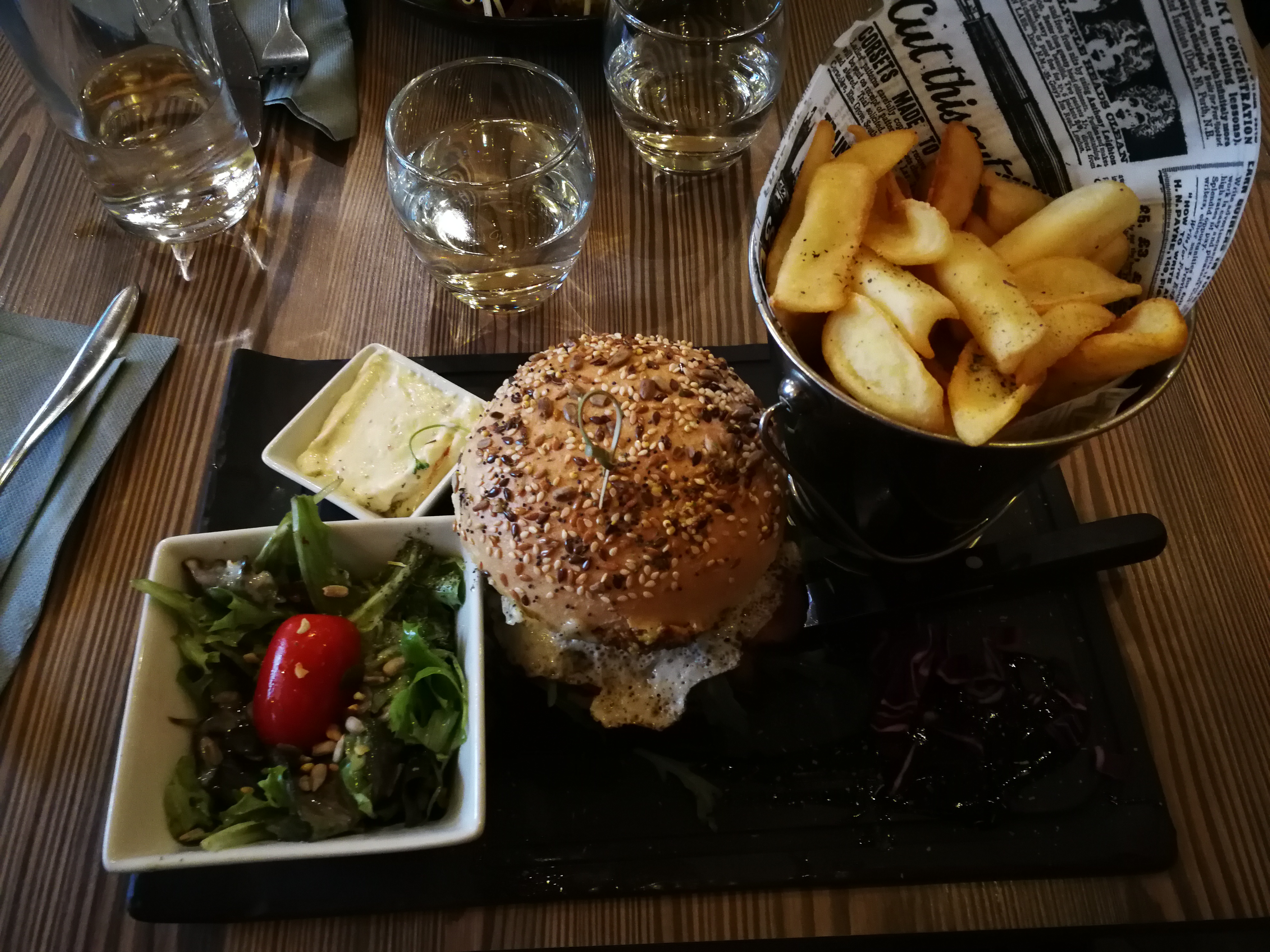 Cuisine impeccable, j'ai pris le gros burger et c'était excellent. Le service est très bien également. Le seul bémol mais non dramatique sont les tables. Un peu serré et sombre.