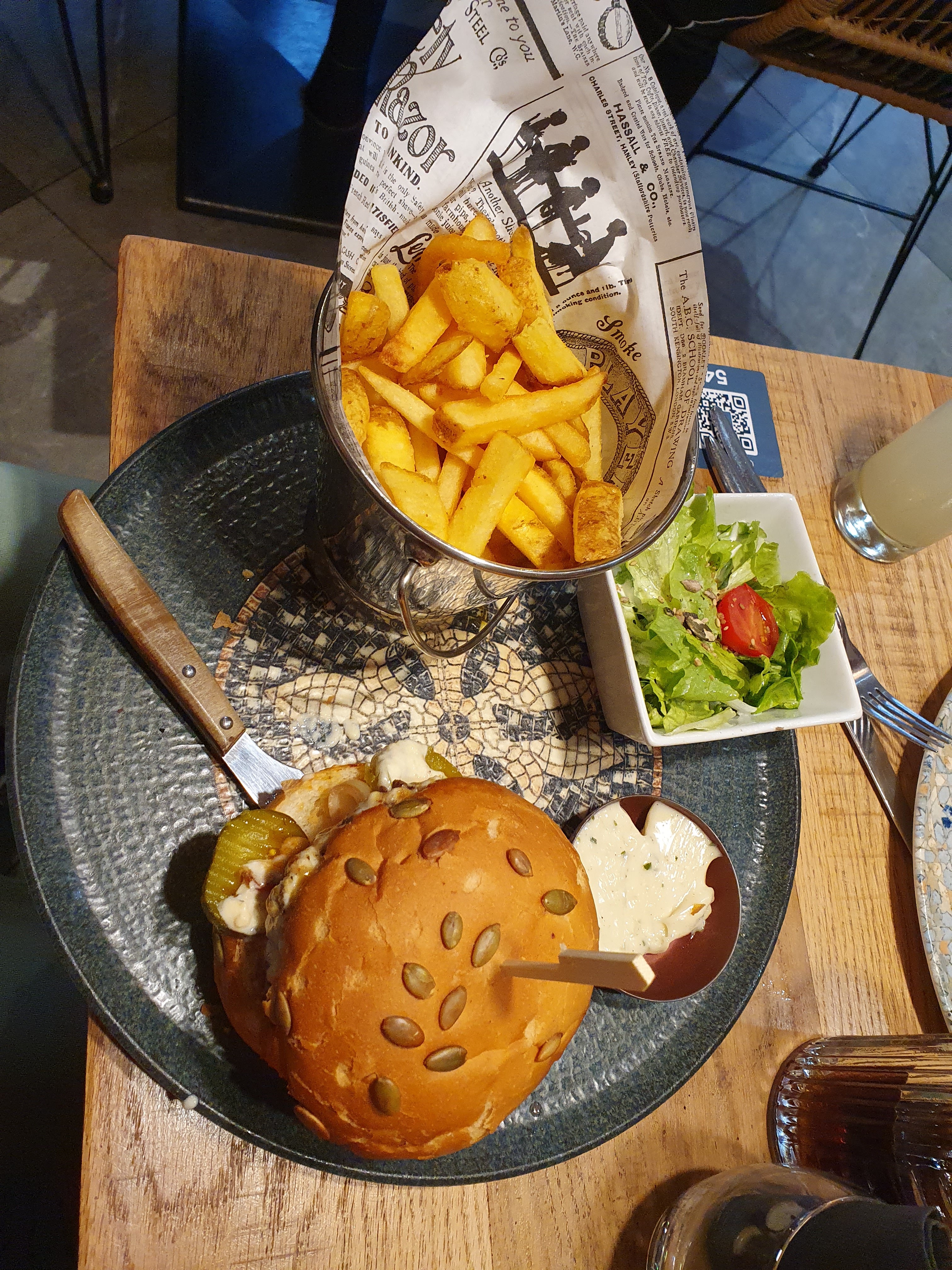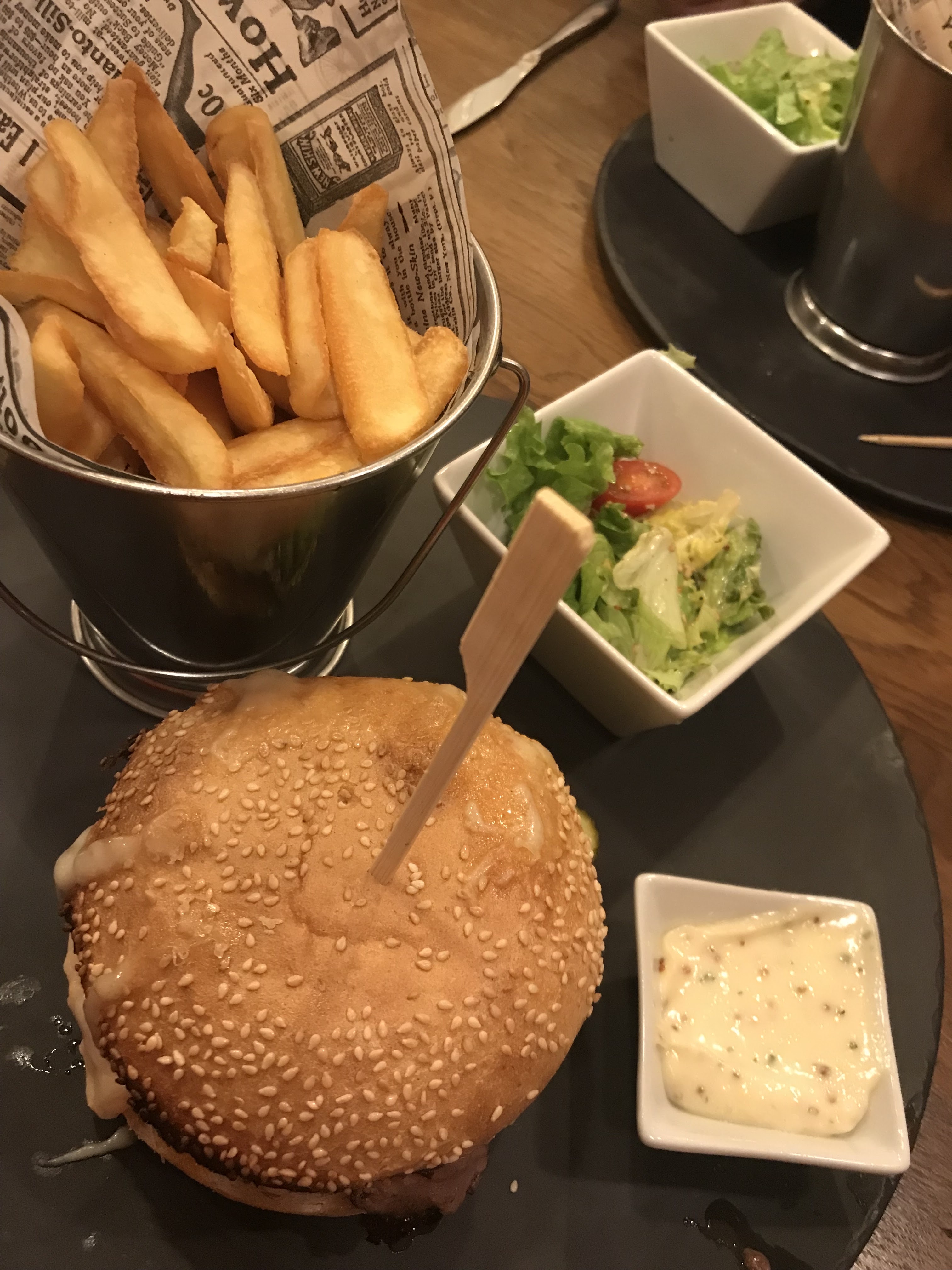Bon burger et salade, emplacement vivant (rue bien située). Service agreable