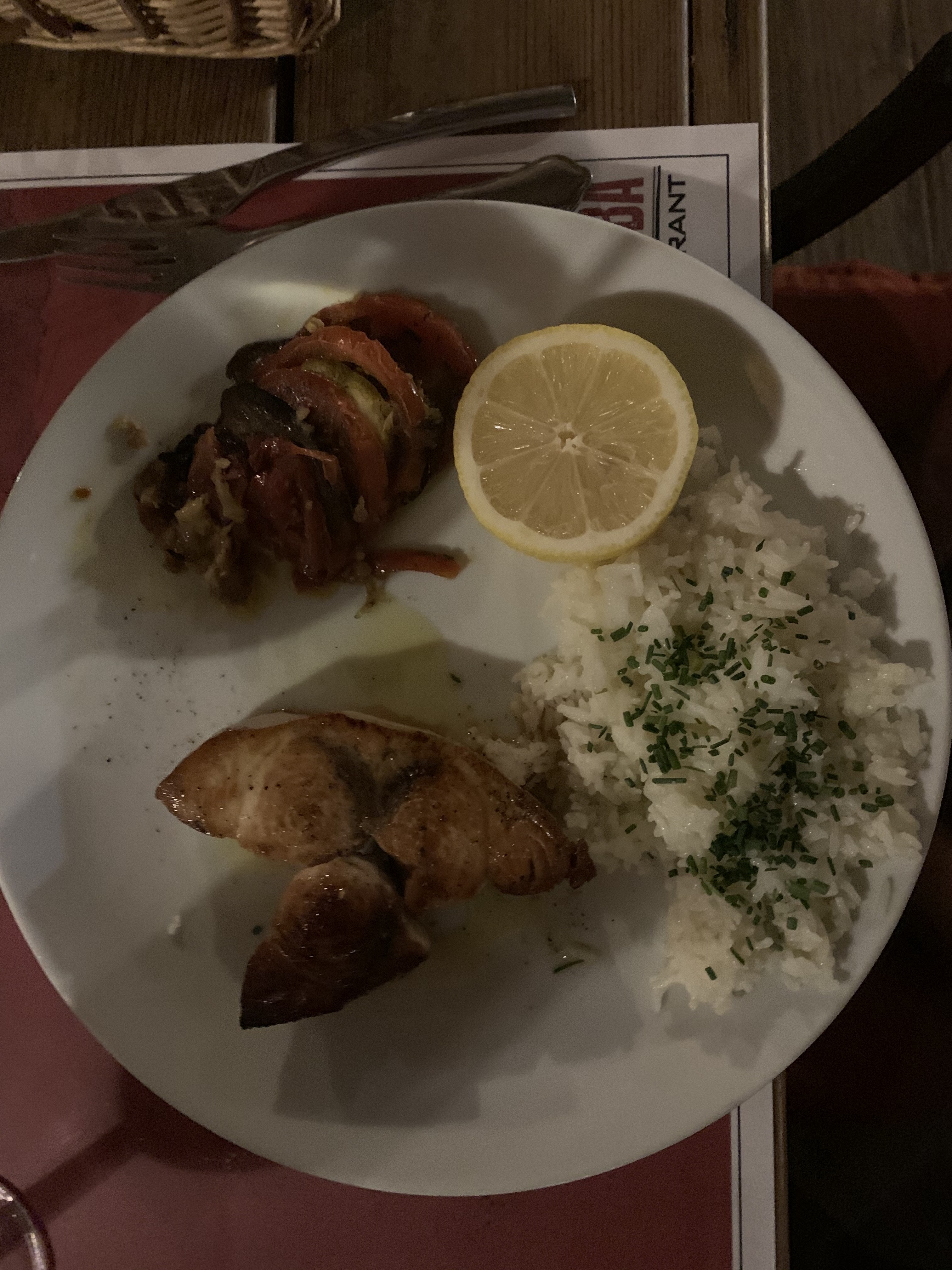 Repas convenable mais c'est très long , pas de sièges enfants , pratiquement 30 a 45min d'attente entre chaque plat (on etait 2)